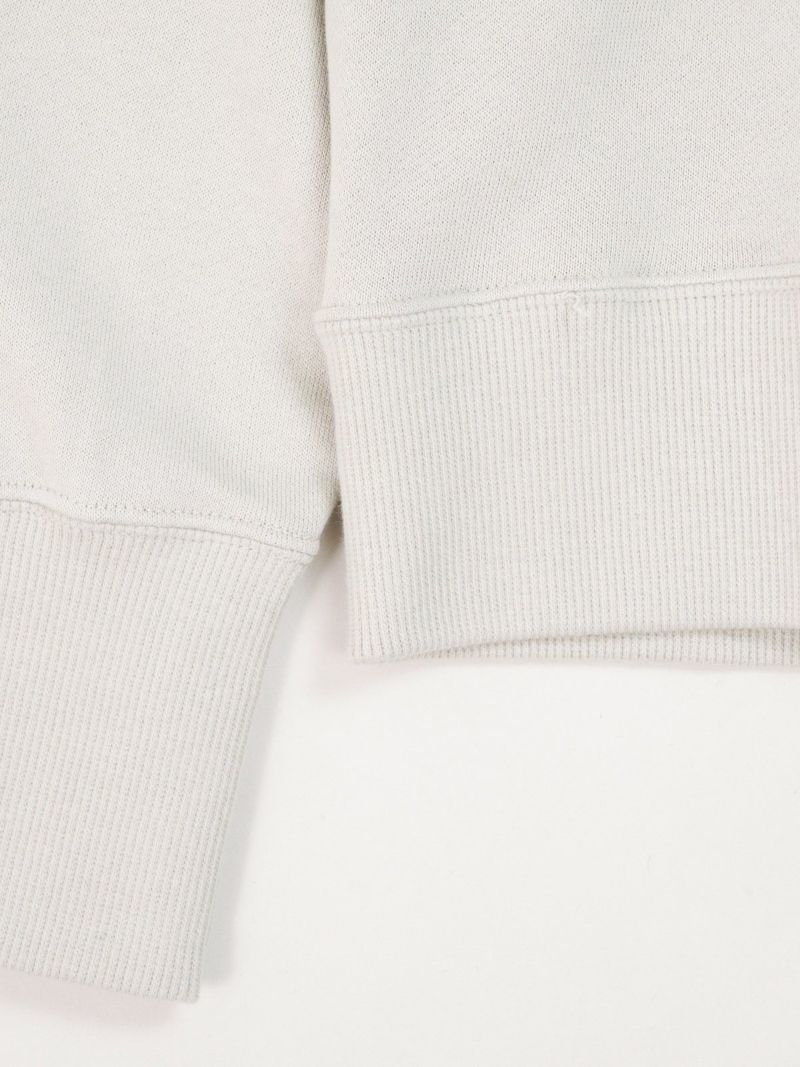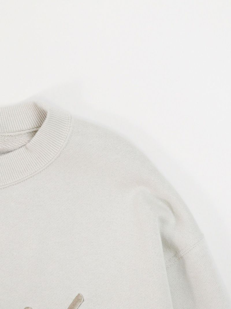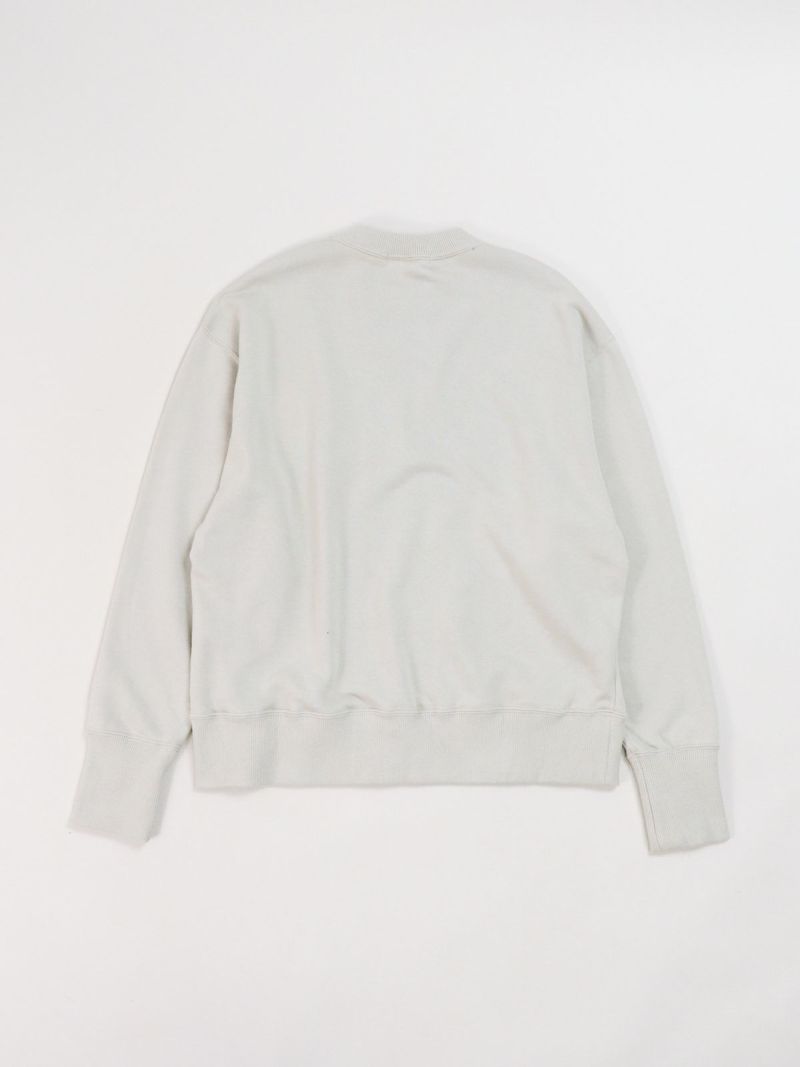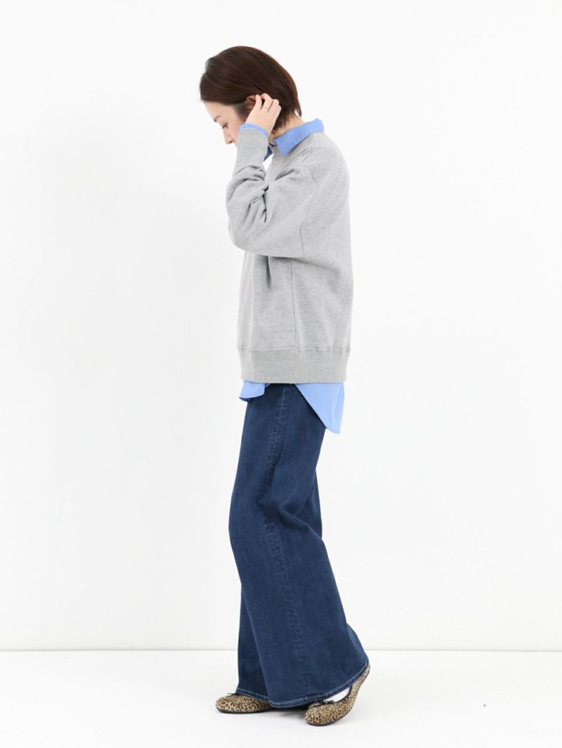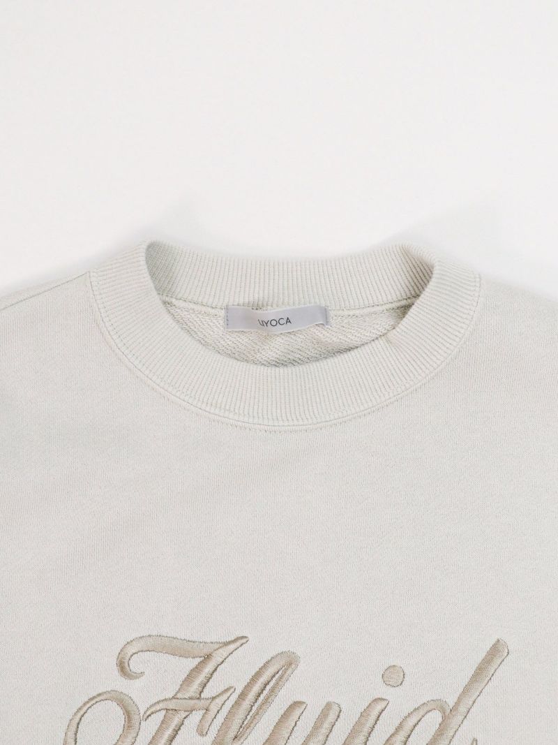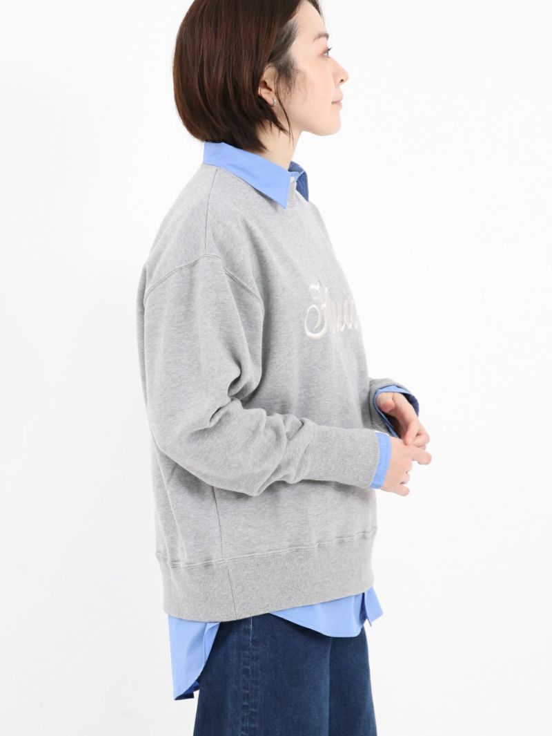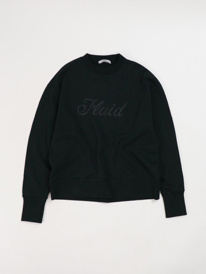 「fluid」のロゴ刺繡の裏毛スウェット。 コーディネートのバランスが取りやすいサイズ。長すぎない丈なのでボリュームあるボトムやギャザースカートとの合わせがオススメです。
