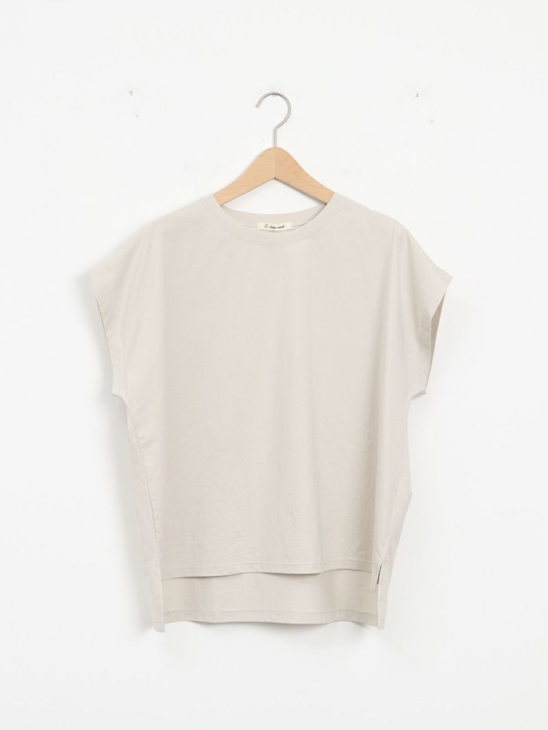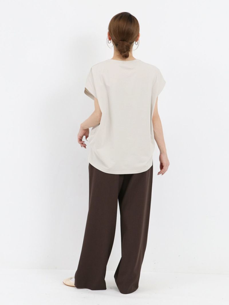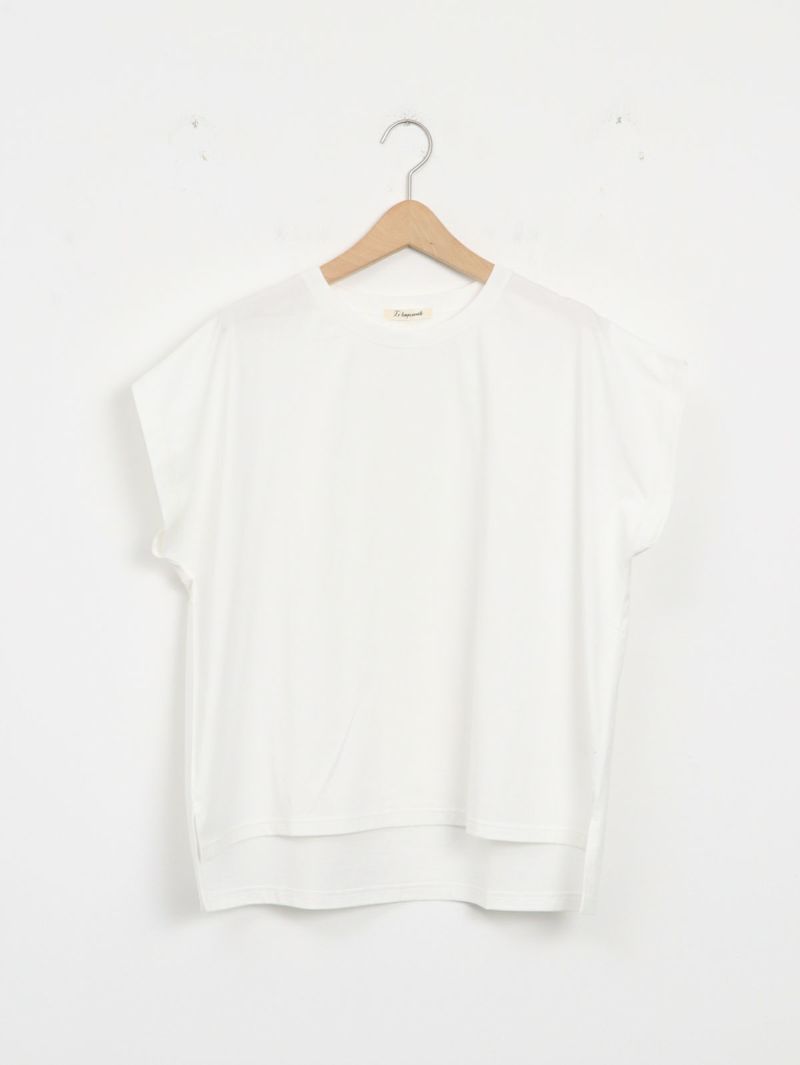 まだ暑いこの季節に気持ちの良い接触冷感機能素材。ゆったりとしたシルエットですが、これからのシーズン、シャツやカーディガンのインナーに活躍する一着です。