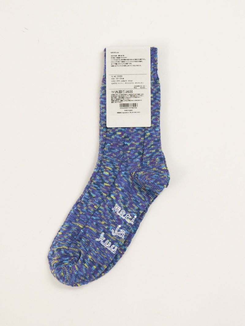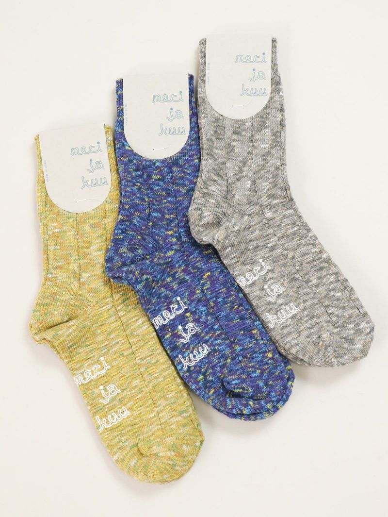 【 meri ja kuu / メリヤクー 】 どこか日本と通じる国、フィンランド。 そのフィンランドの言葉である『meri ja kuu』(メリ ヤ ク―)は『海と月』の意味を持ちます。 日々 月が優しく海(地球)を照らしています・・・ 私たちも どこかの誰かへ温かく柔らかなものを届けられるように・・・ 季節で想う1つの国から繋がる言葉を見つけ、1足1足に物語を描く。 日本で昔から使われてきた編み機を中心に・・・時間をかけて編む。 靴下を通して、受け渡し・・・また受け取り・・・糸のように人と人が紡がれて生まれた靴下。