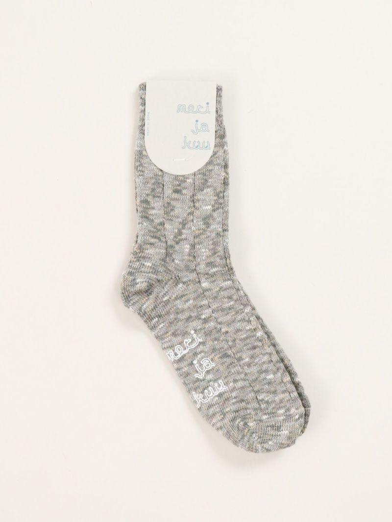凸凹とした不均一絣糸とコットンのスラブ糸を引き揃え太リブで編んだカジュアルなソックス。 足底にはブランドロゴの滑り止めプリント入り。くしゅくしゅとたるませて履いていただける、使いやすい丈感です。