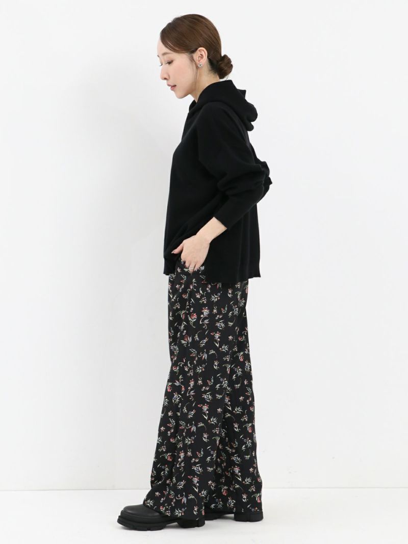 自然なツヤとしわ感が魅力のプリントセミワイドパンツ。 丁度良い落ち感で、シルエットが綺麗に映ります。ブラックと小花柄のコントラストで大人かわいいパンツコーデが楽しめます。