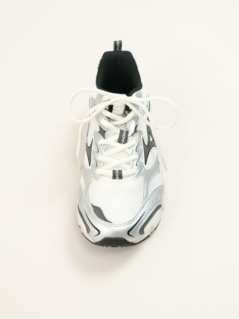 目の大きなメッシュと人工皮革の組み合わせで作られ、複数の重なり合ったデザインパターン、プリントや型押しなど細部に施された加工にもこだわりが詰まっています。ホワイトエアメッシュとシルバーのオーバーレイを採用し、差し色にレッドやブルーを加えたレトロティックな雰囲気のランニングシューズです。