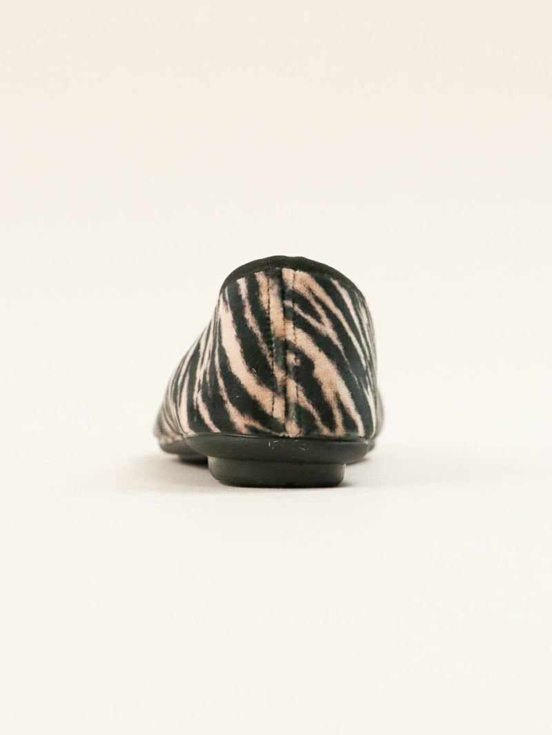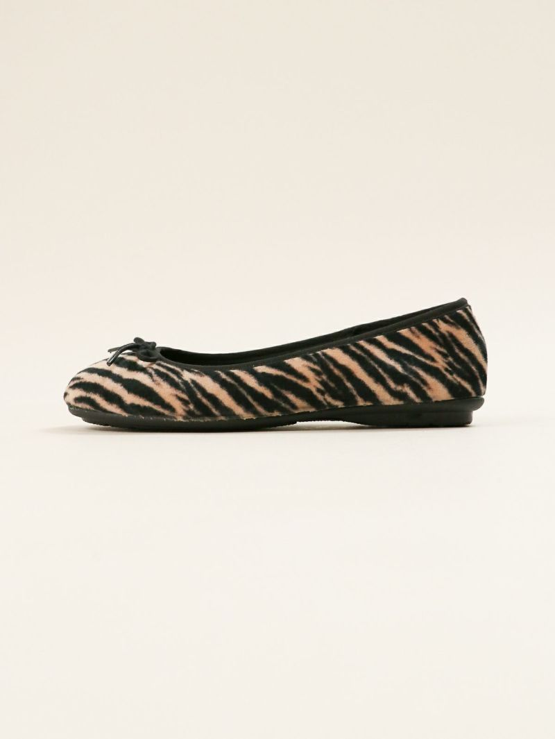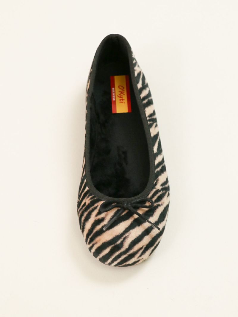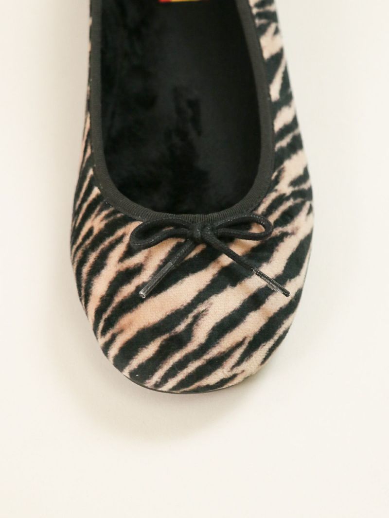 短く起毛したハラコ風のアッパーに存在感のあるゼブラ柄をプリントしたバレエシューズ。 足元を一気に華やかにし、シンプルなコーディネートのアクセントとして活躍します。内側部分は暖かく柔らかな素材で、秋冬シーズンに最適な履き心地です。