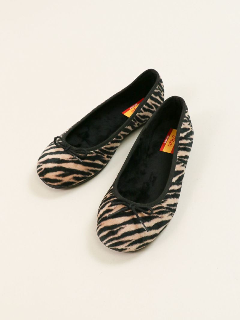 短く起毛したハラコ風のアッパーに存在感のあるゼブラ柄をプリントしたバレエシューズ。 足元を一気に華やかにし、シンプルなコーディネートのアクセントとして活躍します。内側部分は暖かく柔らかな素材で、秋冬シーズンに最適な履き心地です。
