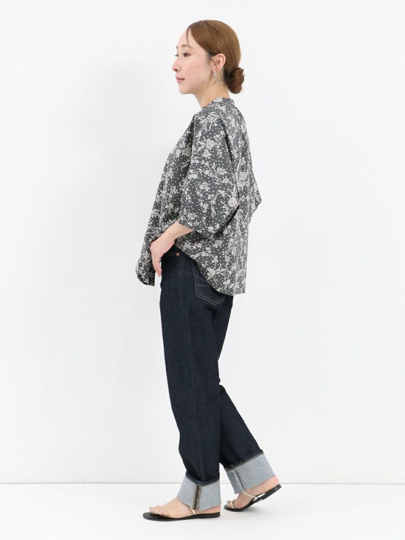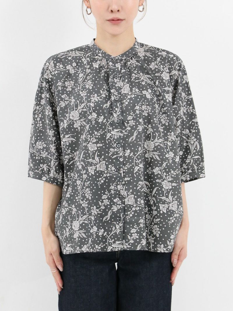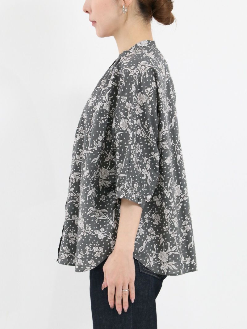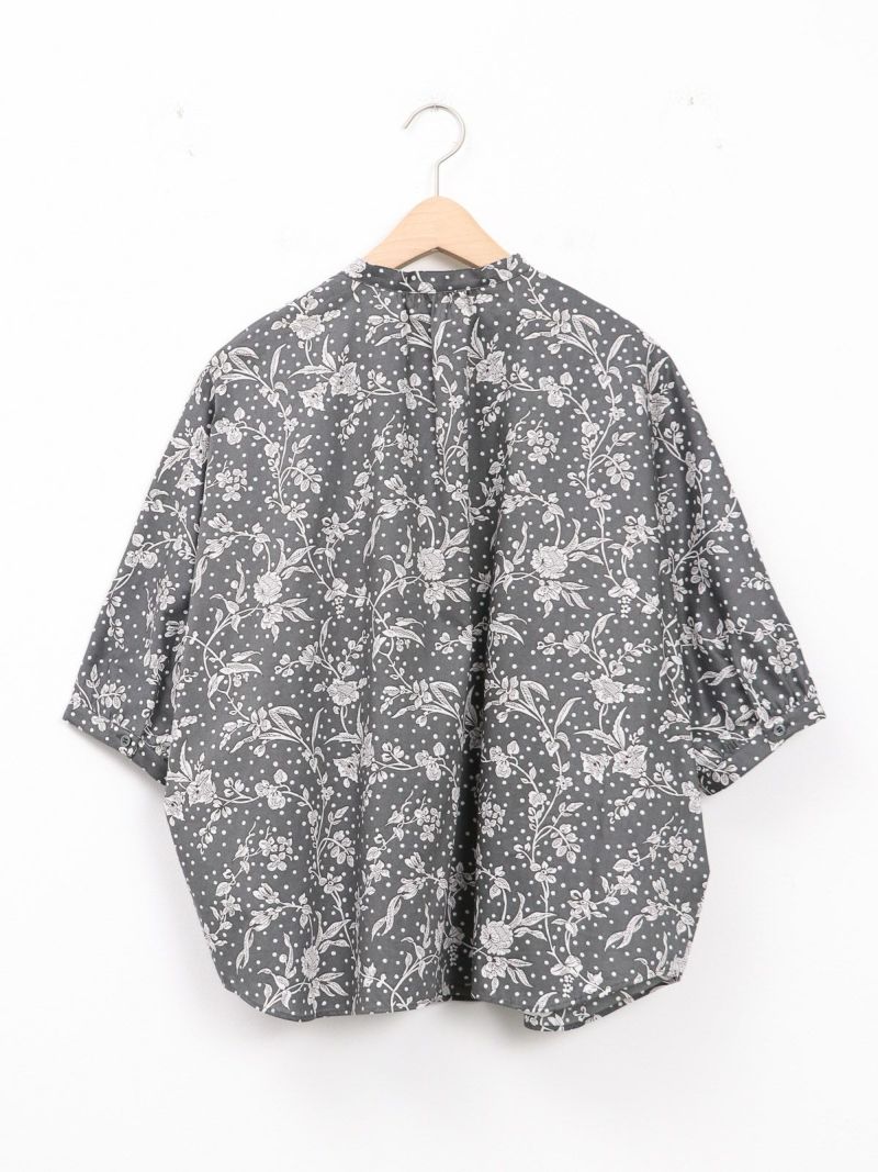 華やかなリバティプリントが着映えするスタンドカラーシャツ。 ゆとりのある身幅と5分袖のドルマンスリーブはゆったりとしたシルエットで締め付け感のない着心地です。