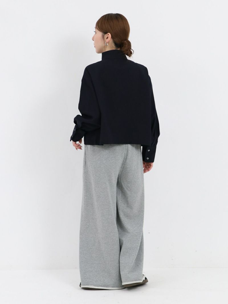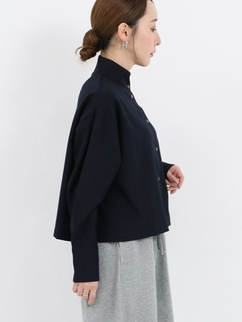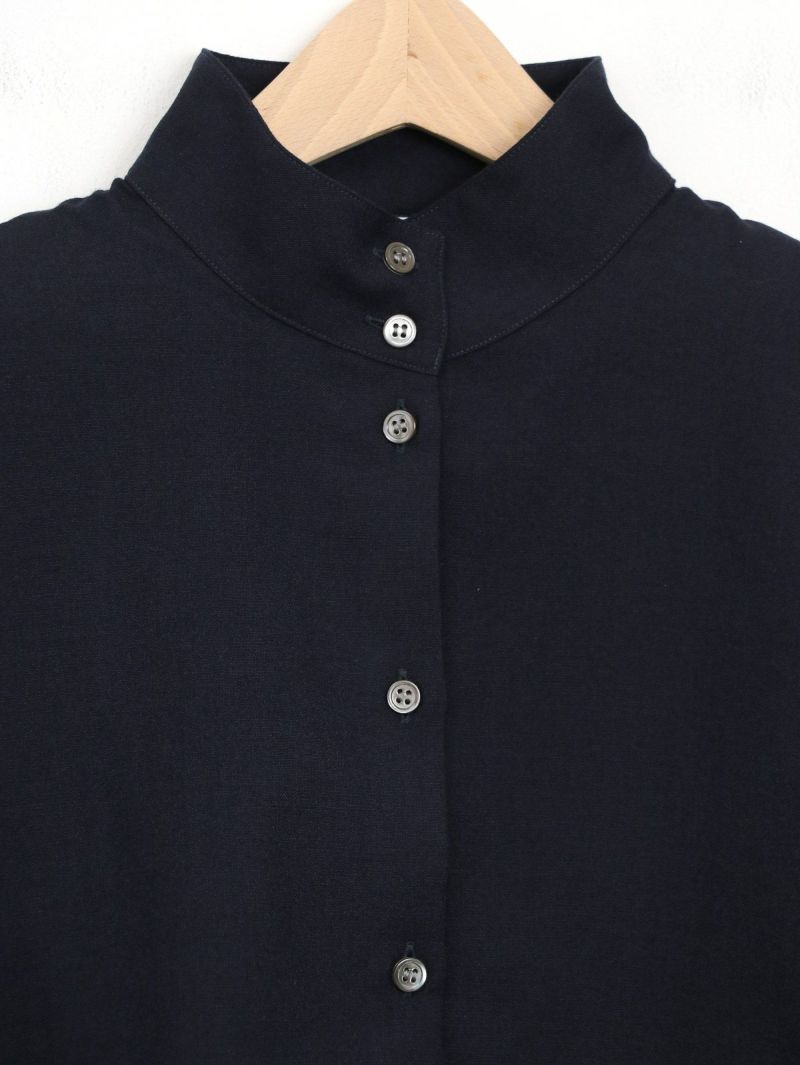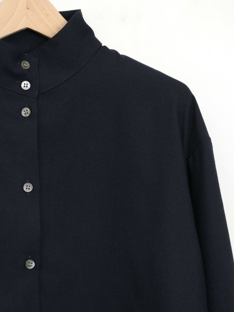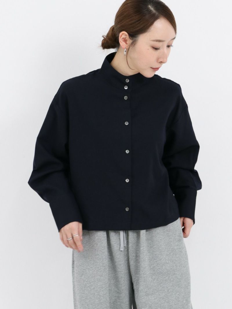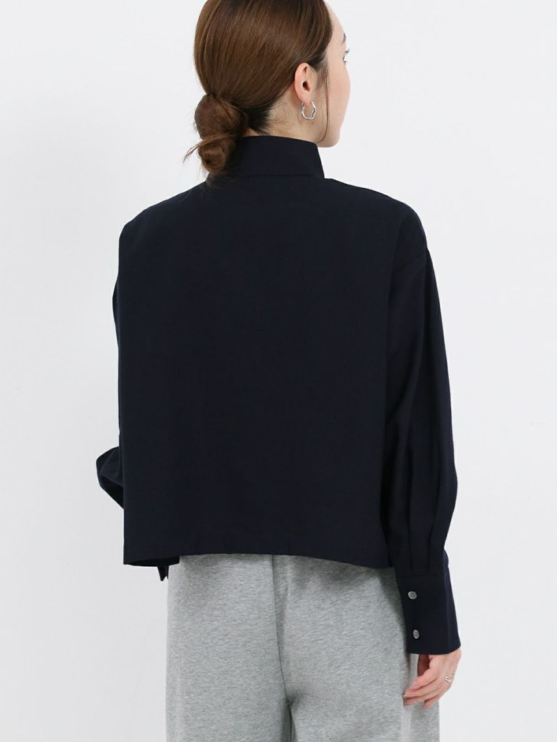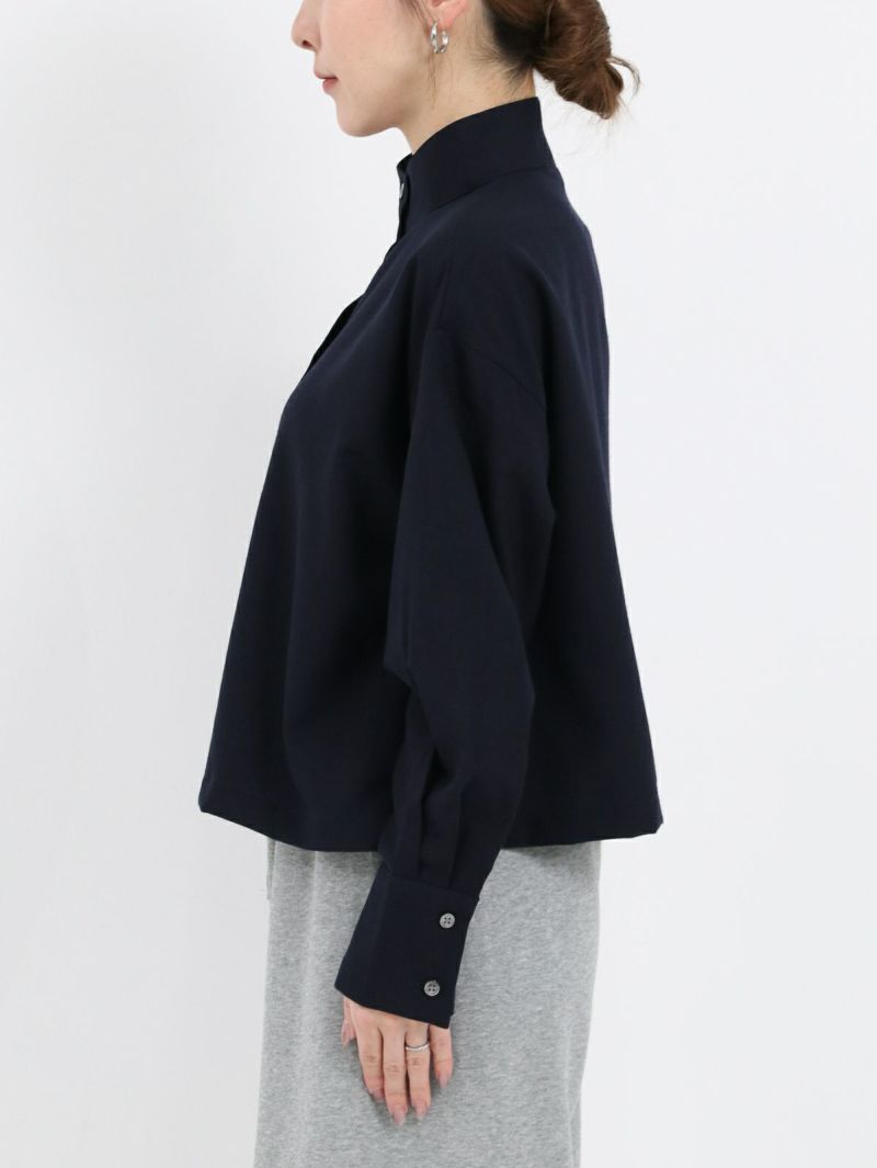 平織りサマーウールのSETTO定番オッカケシャツ。 クラシカルな雰囲気のスタンドカラーに、風を取り込むようなボックスシルエット。 身幅を広めにとった、ほどよくゆとりのあるフォルムが特徴です。短めの着丈と、長めのカフスがアクセントになり、全体のバランスにメリハリを。シンプルながら、細かなディテールにもこだわった一枚です。