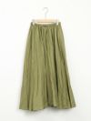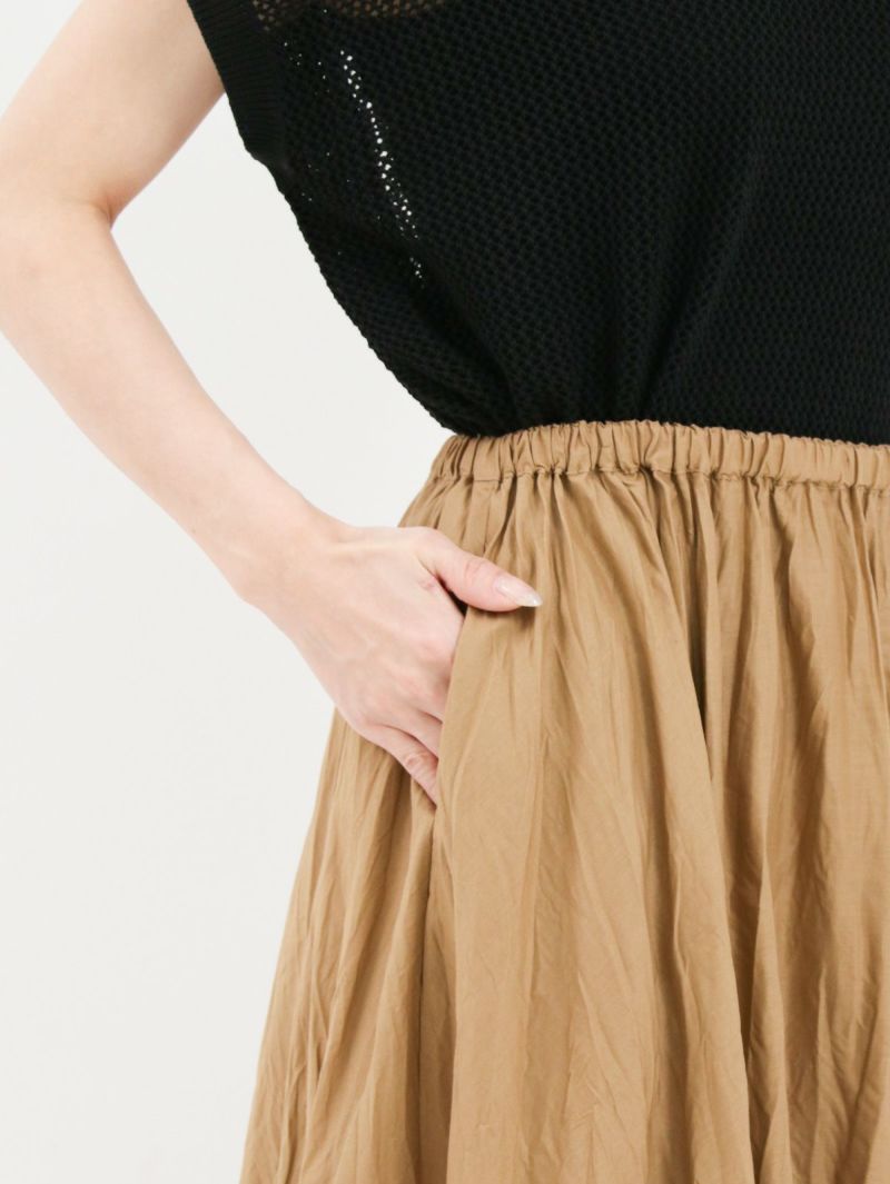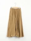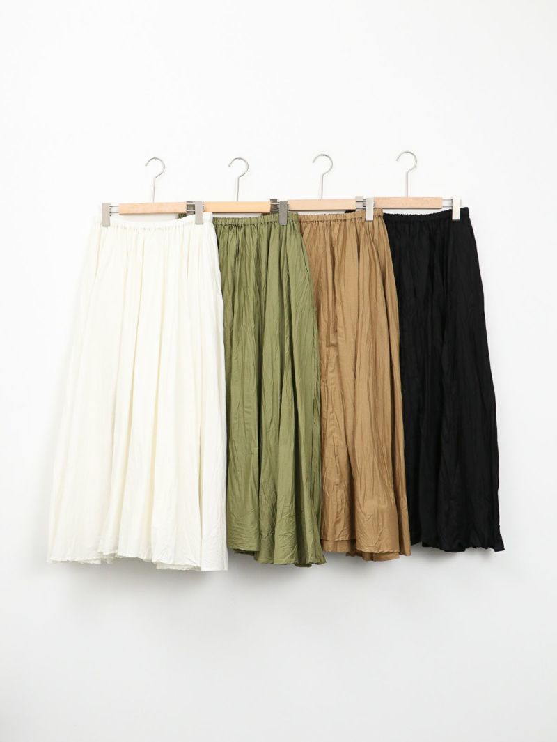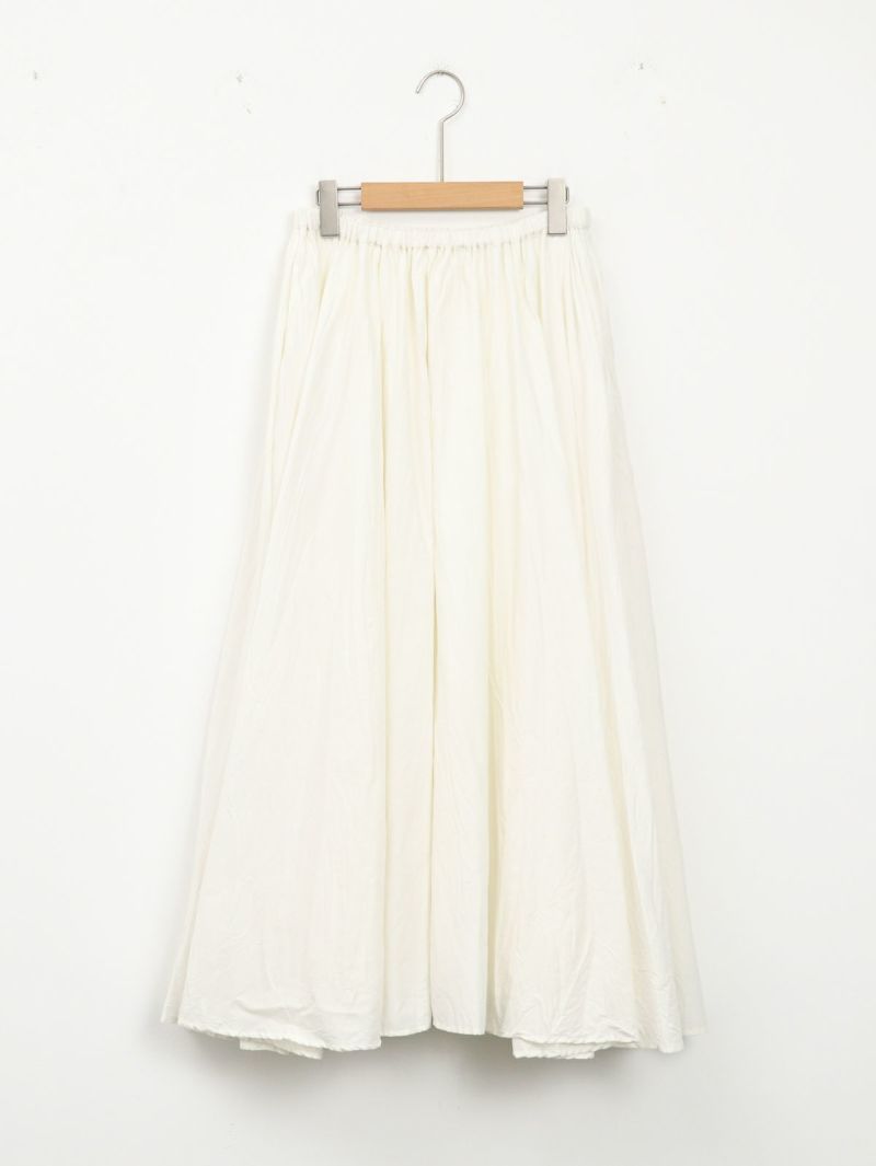 目の細かい薄手の生地にキャンブリック仕上げ(艶を出したあとに糊付けし、自然な艶をだす方法)を施したギャザースカート。 たっぷりと入ったギャザーは、ボリューム感がありながらも、縦に絞りをいれることでボリューム感がおさえられます。今回は秋らしいカラーをご用意。残暑でも涼しく先取りできます。