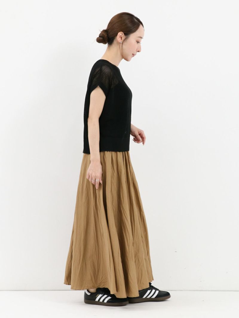 目の細かい薄手の生地にキャンブリック仕上げ(艶を出したあとに糊付けし、自然な艶をだす方法)を施したギャザースカート。 たっぷりと入ったギャザーは、ボリューム感がありながらも、縦に絞りをいれることでボリューム感がおさえられます。今回は秋らしいカラーをご用意。残暑でも涼しく先取りできます。