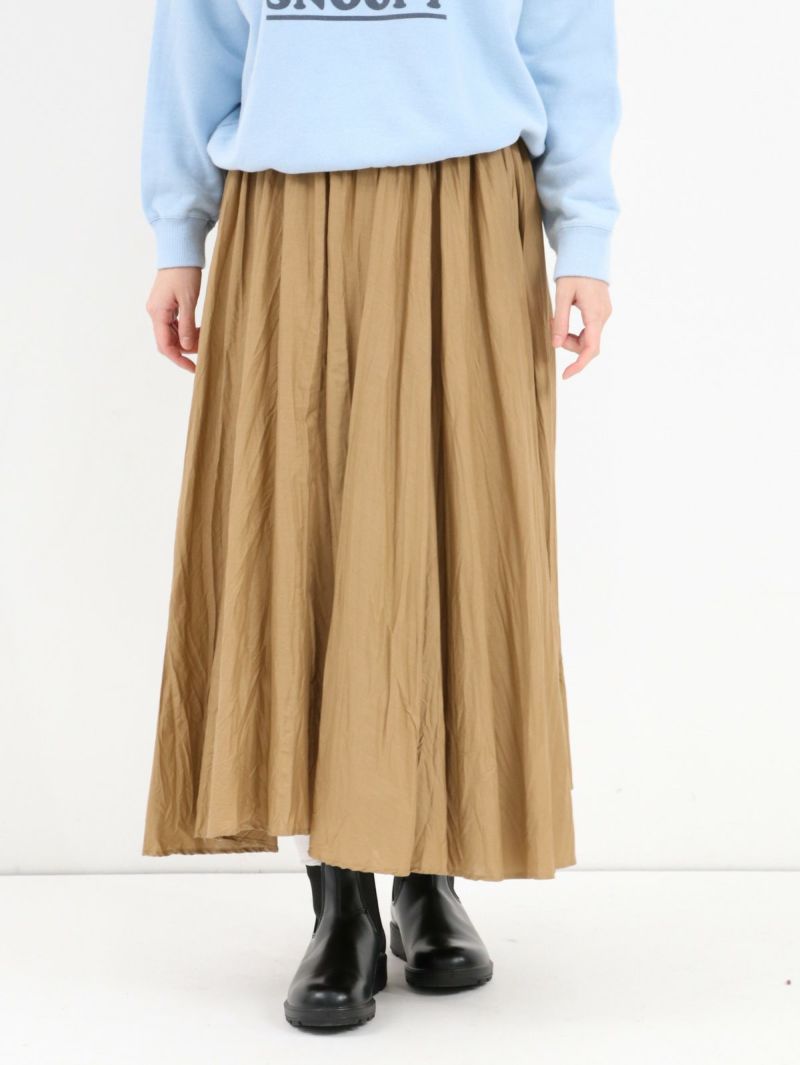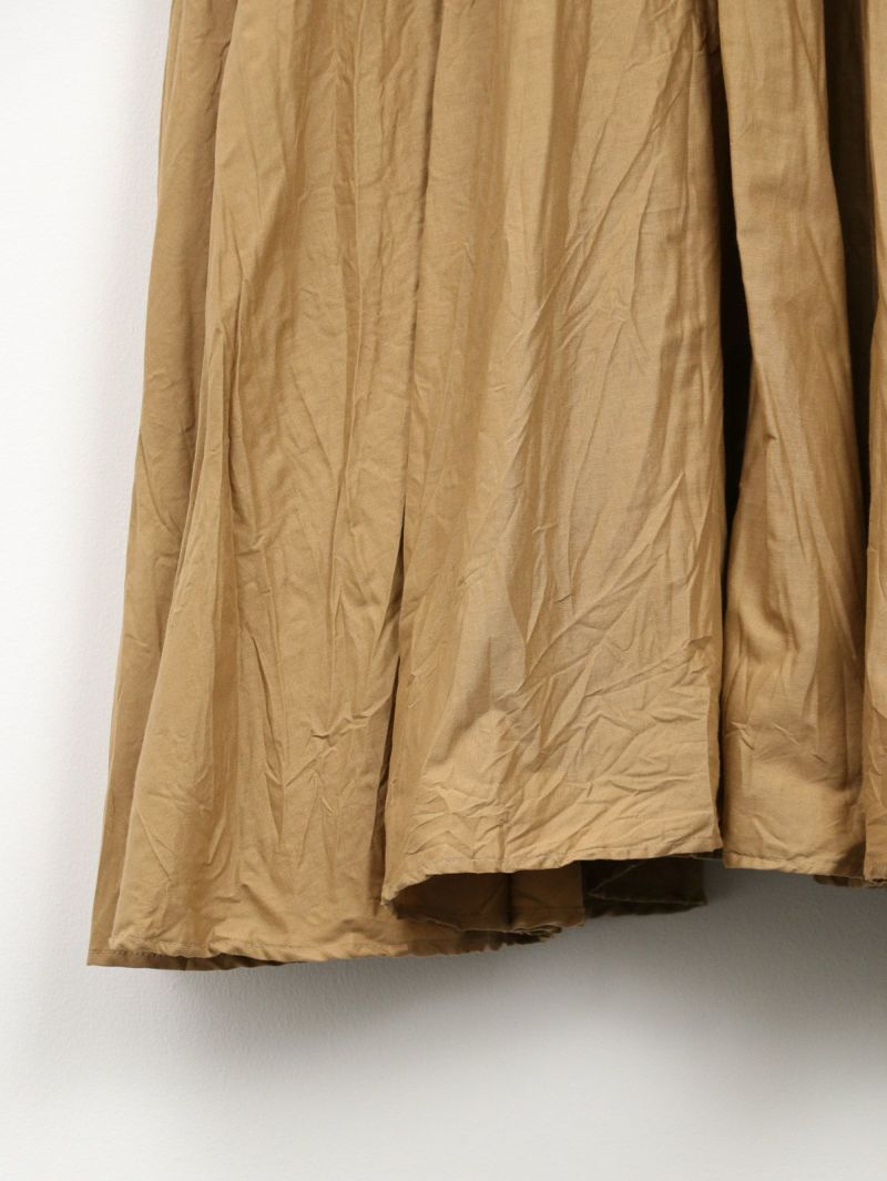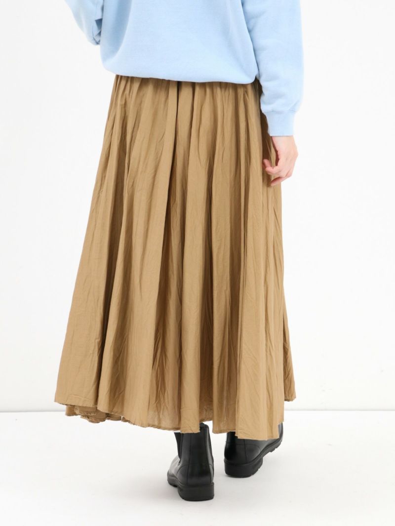 目の細かい薄手の生地にキャンブリック仕上げ(艶を出したあとに糊付けし、自然な艶をだす方法)を施したギャザースカート。 たっぷりと入ったギャザーは、ボリューム感がありながらも、縦に絞りをいれることでボリューム感がおさえられます。今回は秋らしいカラーをご用意。残暑でも涼しく先取りできます。