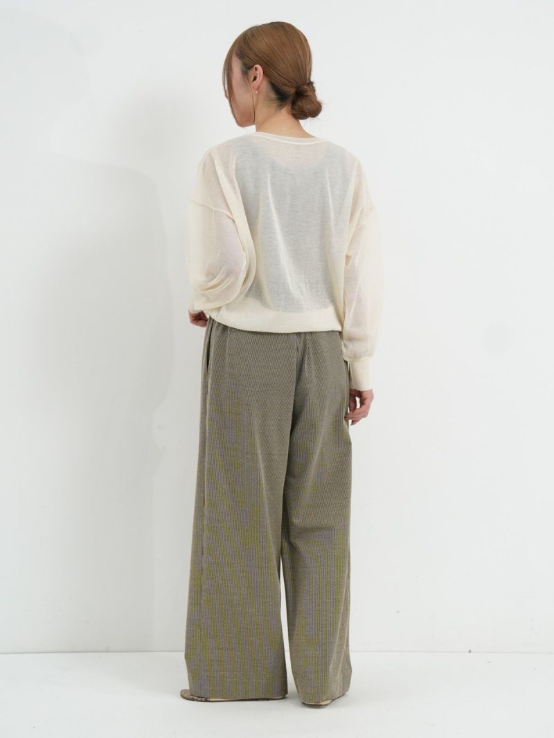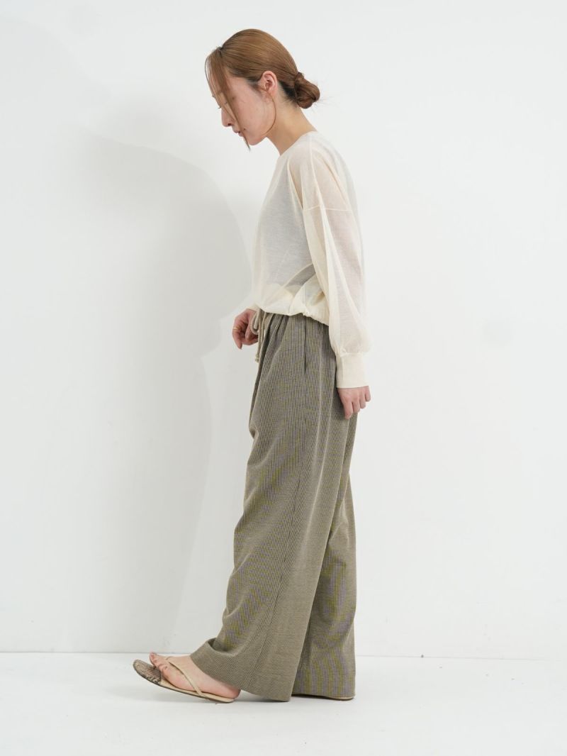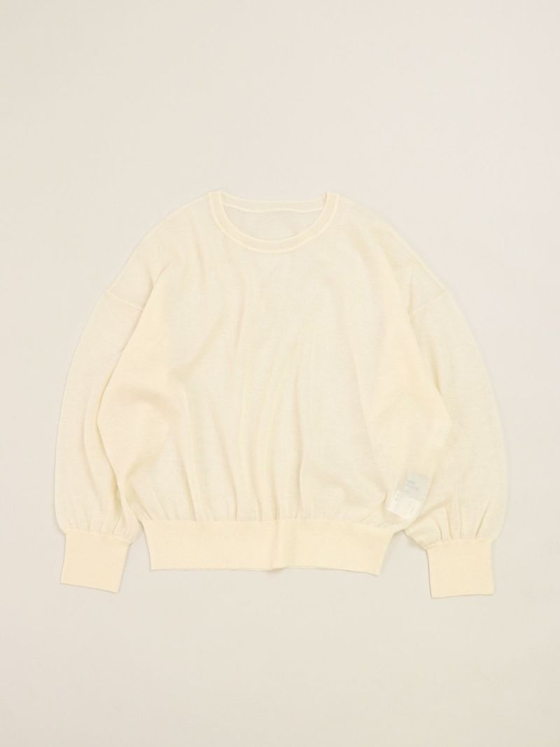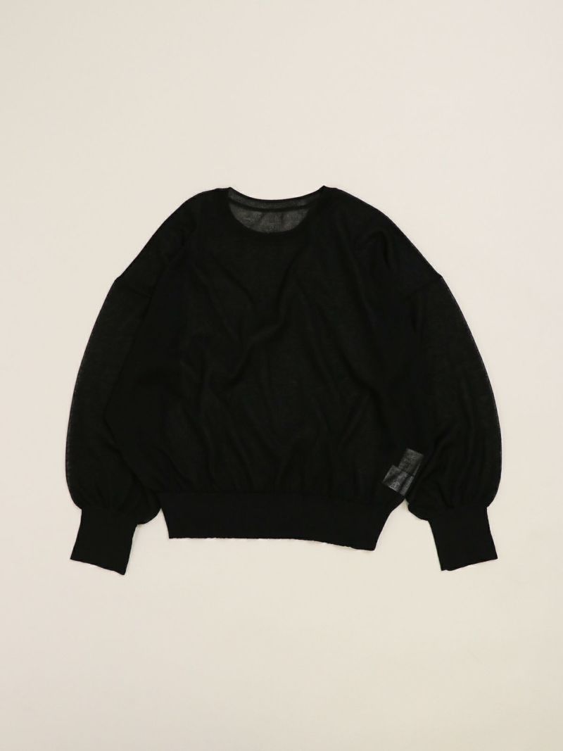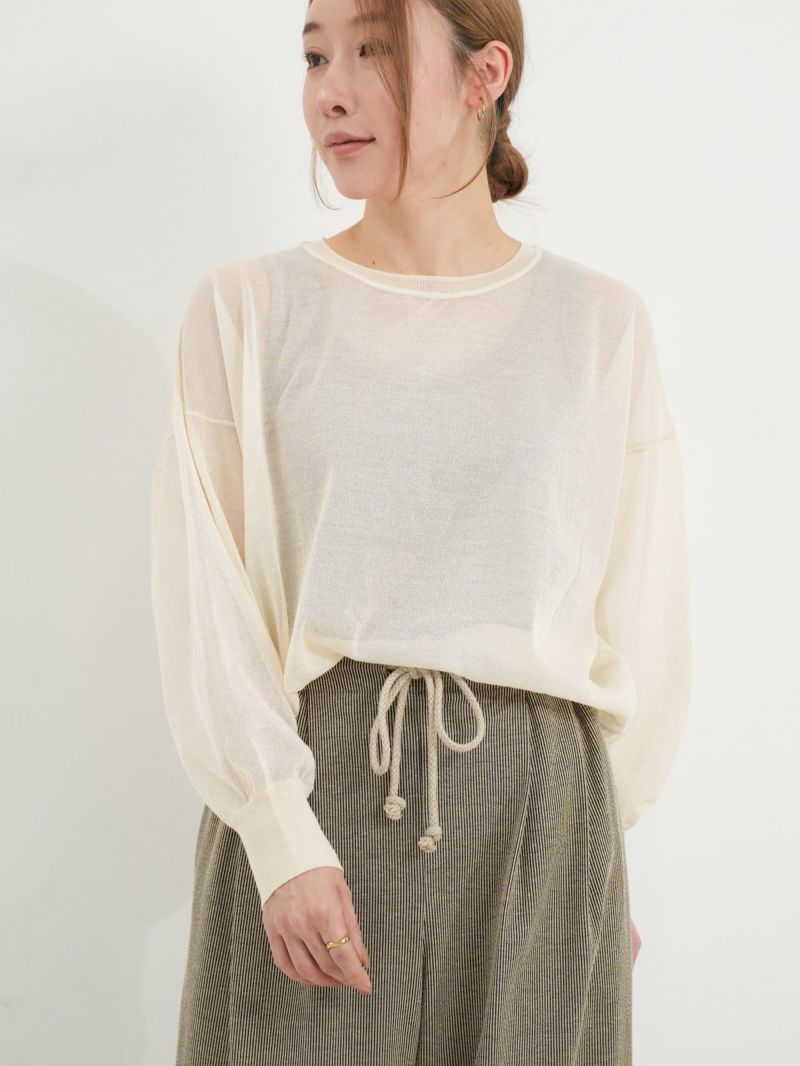 tan tan別注プルオーバーニット。 上品な光沢感と程よいシアー感が女性らしい印象に。袖にボリューム感を持たせたことでシンプルになりすぎず、一枚でサマになる万能トップスです!
