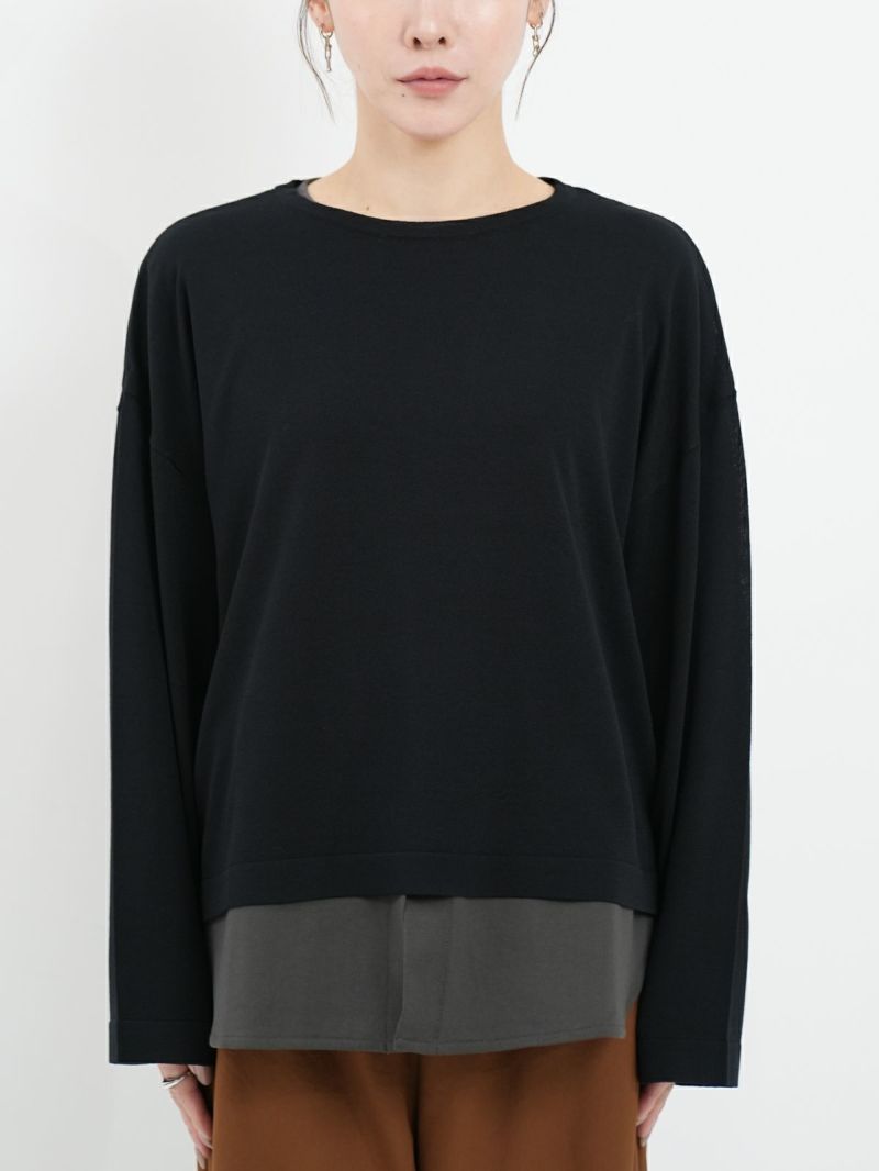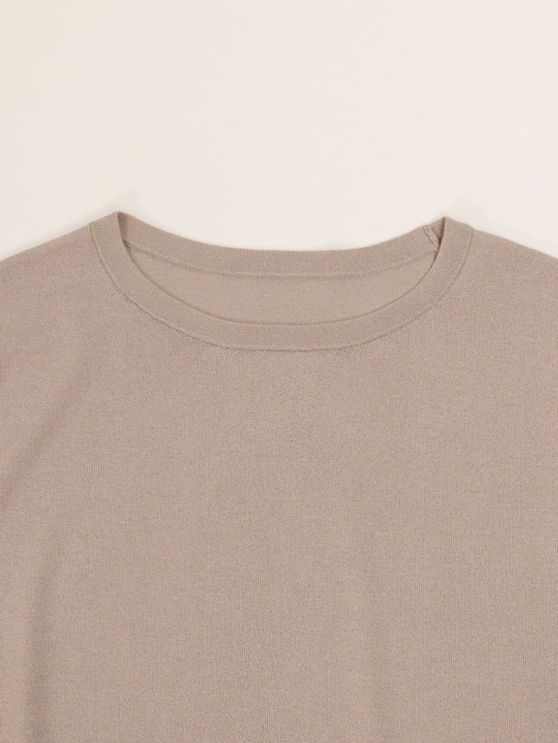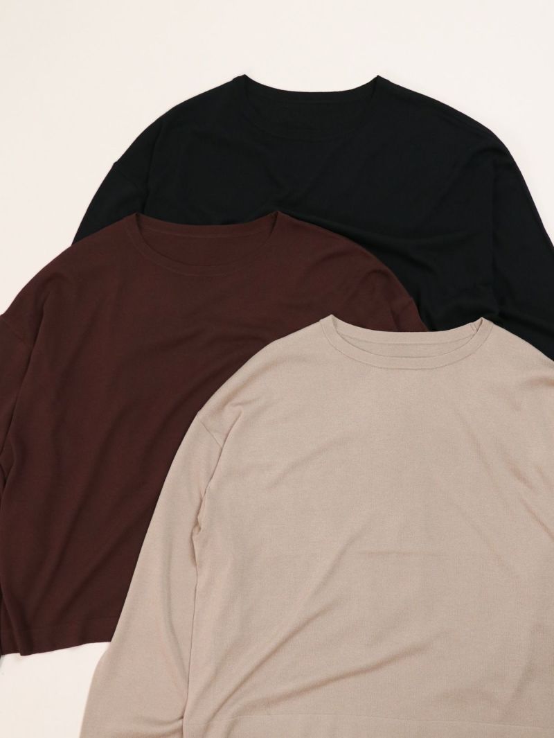 クルーネックのプルオーバーニット。 シルクの様に滑らかで肌触りが良く、秋口にちょうどいい素材感です。アームにゆとりを持たせ、袖口は締め付けずに仕上げたデザイン。風通しよく涼しく着られるので、季節の変わり目にもぴったりです。