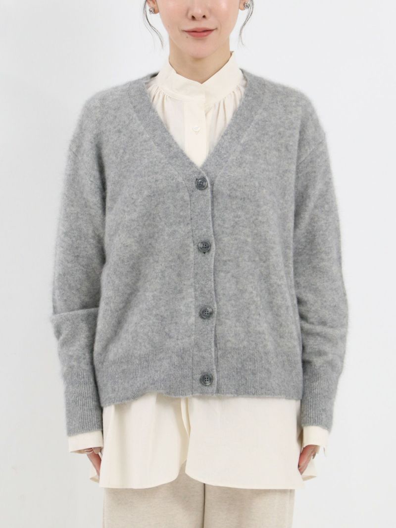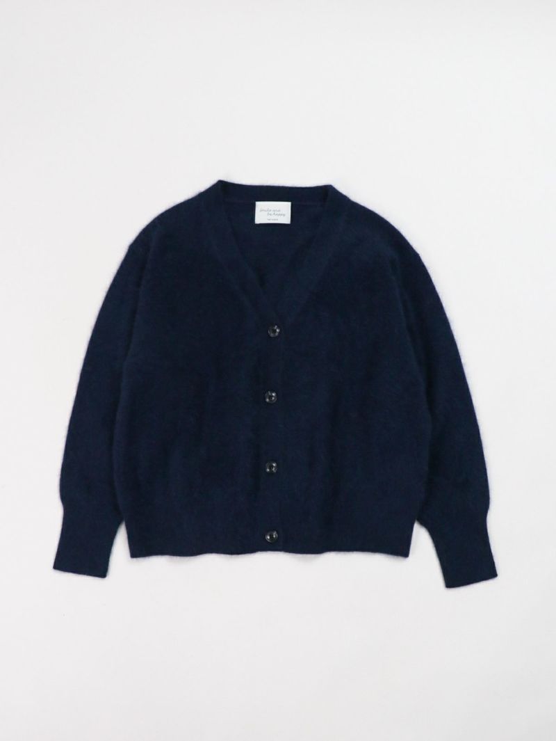 高品質なラクーン糸を使用した贅沢なニットカーディガン。 ふんわりと柔らかな肌触りで、とても暖かく軽やかな着心地です。ナイロン糸をブレーディングすることで毛が抜けにくく、もっちりとした風合いに仕上げています。