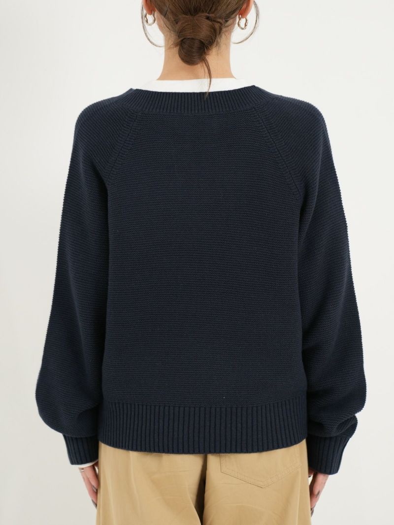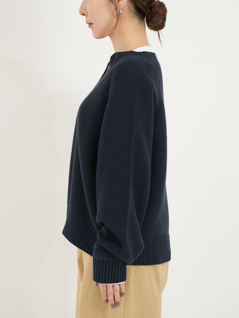 コットン×アクリル素材のキーネックがポイントのガーター編みプルオーバー。 首元がすっきりしており、シャツやタートルとの重ね着も◎インナー次第で印象の変化を楽しめます。チクチク感もなくロングシーズン着用いただけるアイテムです。