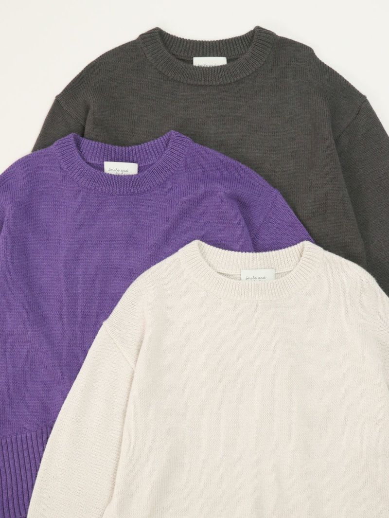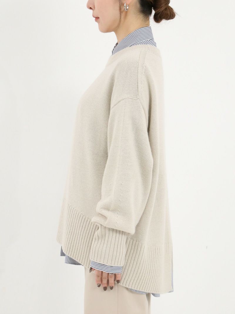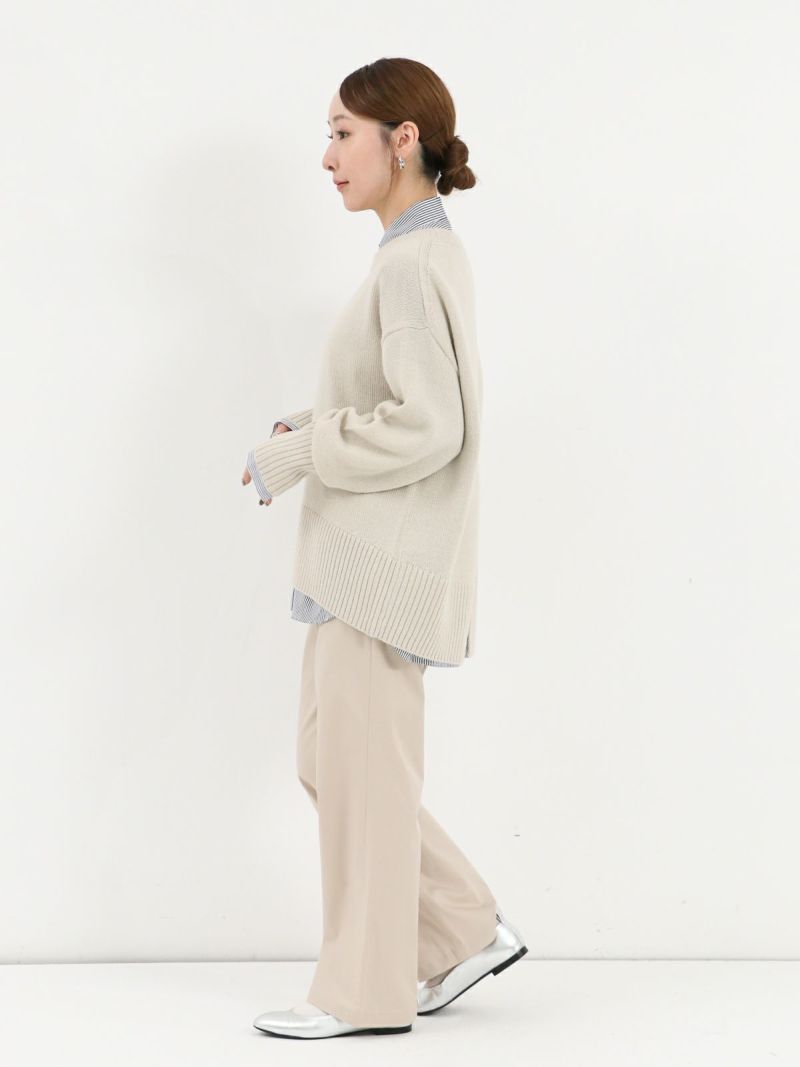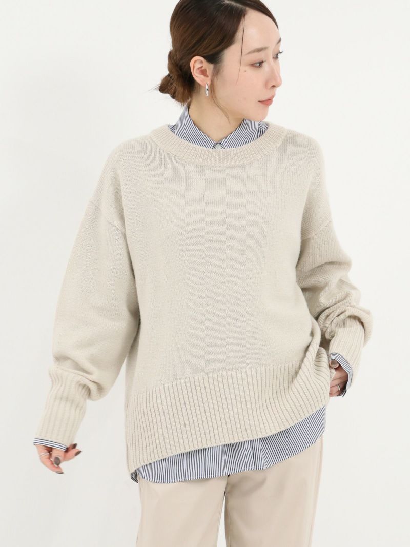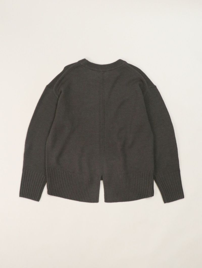 柔らかな風合いのウール混ニットプルオーバー。 ウールの暖かさとアクリルの軽さをバランスよく組み合わせたバルキー糸を使用。袖口と裾の長めのリブと、後ろのスリットがデザインポイントに。