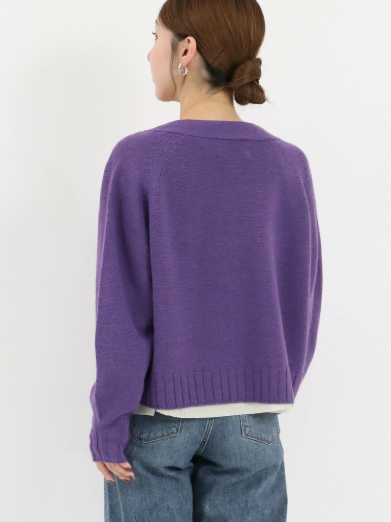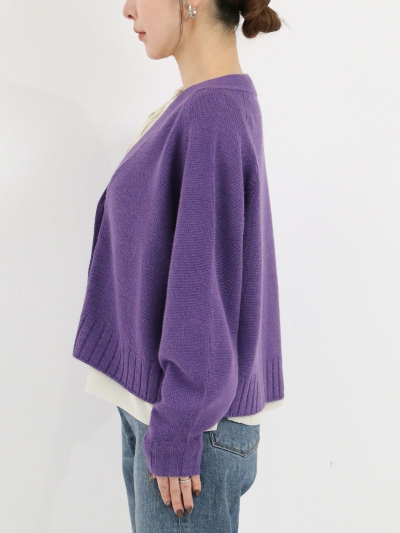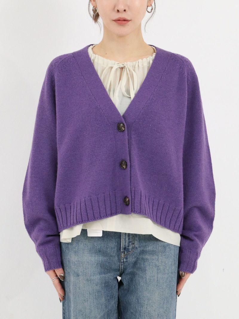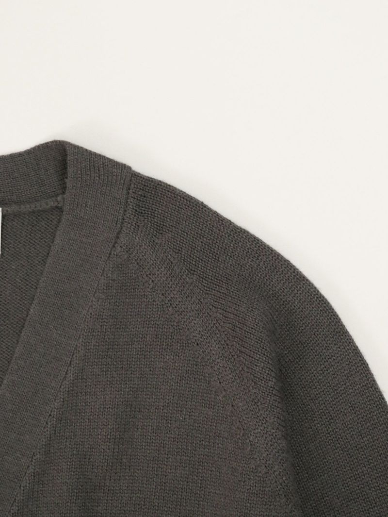 太めのリブがアクセントのVネックカーディガン。 ウールの暖かさとアクリルの軽さをバランスよく組み合わせたバルキー糸を使用。袖口と裾の太めのリブが程よいデザインポイント。前立てのラインを強調することでスッキリとした印象に。カーディガンとしてはもちろん、ボタンを閉めてプルオーバー感覚での着こなしもオススメです。