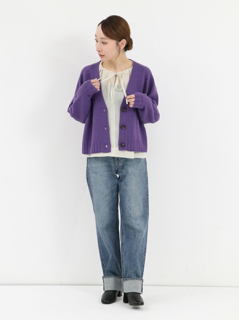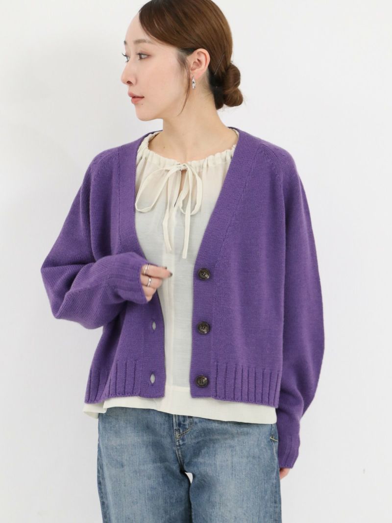 太めのリブがアクセントのVネックカーディガン。 ウールの暖かさとアクリルの軽さをバランスよく組み合わせたバルキー糸を使用。袖口と裾の太めのリブが程よいデザインポイント。前立てのラインを強調することでスッキリとした印象に。カーディガンとしてはもちろん、ボタンを閉めてプルオーバー感覚での着こなしもオススメです。