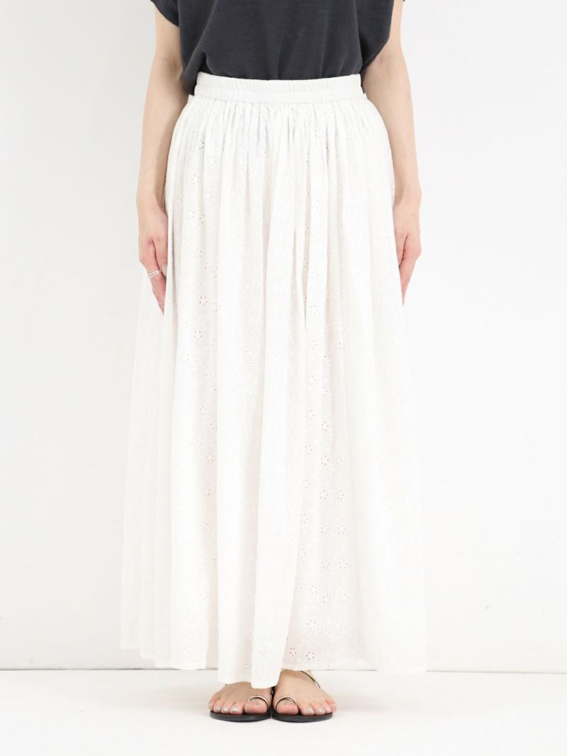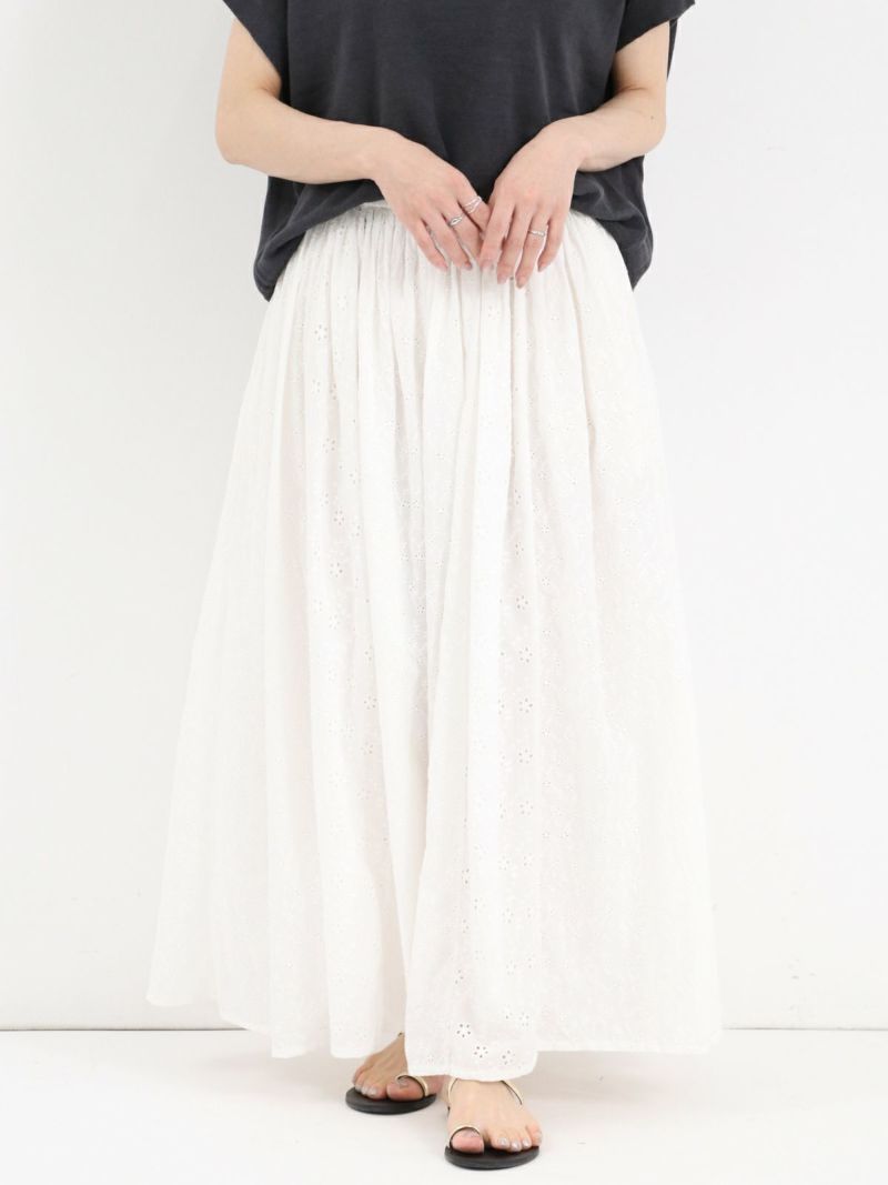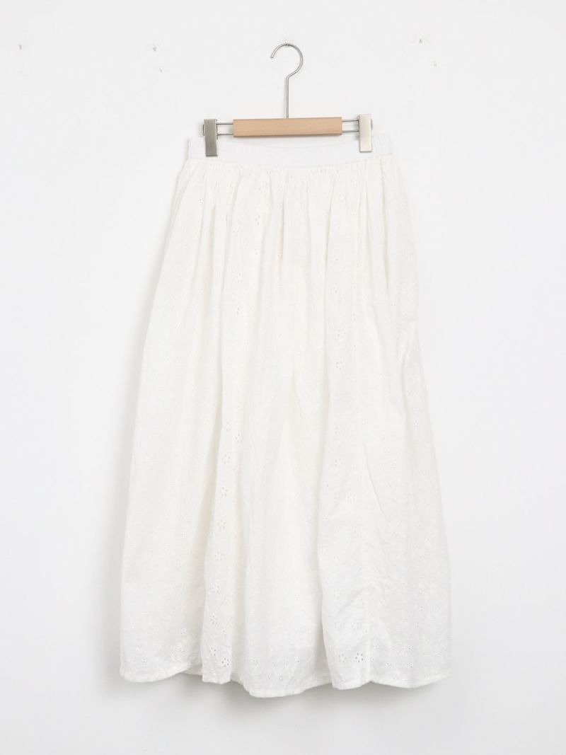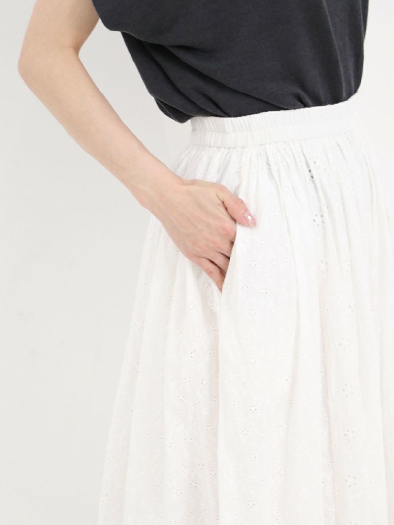 大小異なる2種類のヘムラ刺繍の生地を、パッチワークで仕立てたギャザースカート。 カラーを統一させた刺繍は華やかさがあり、裏地付きで透け感を気にせず着ていただけます。両サイドにはポケット付き。