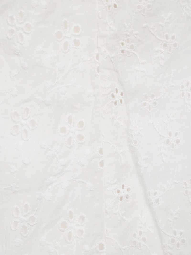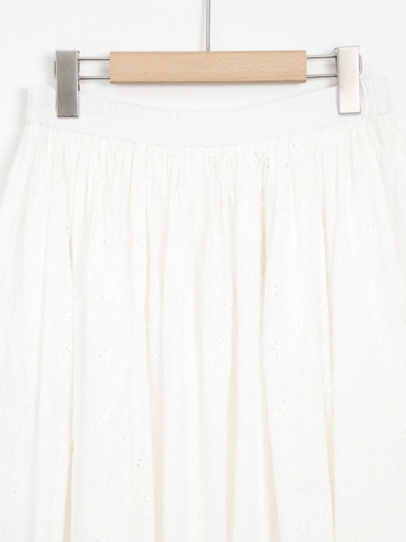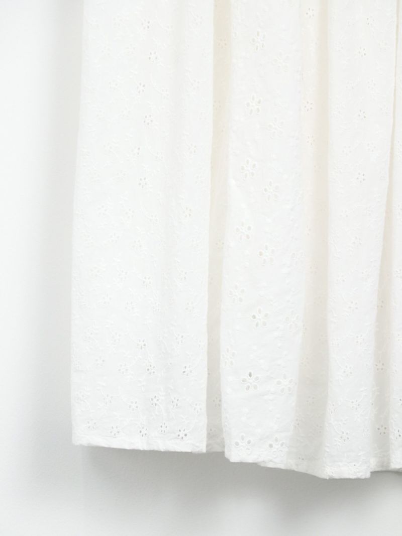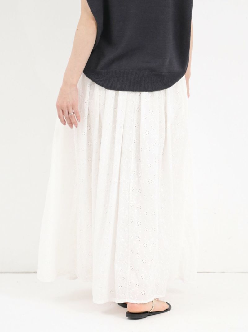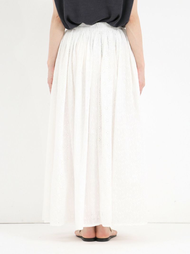 大小異なる2種類のヘムラ刺繍の生地を、パッチワークで仕立てたギャザースカート。 カラーを統一させた刺繍は華やかさがあり、裏地付きで透け感を気にせず着ていただけます。両サイドにはポケット付き。