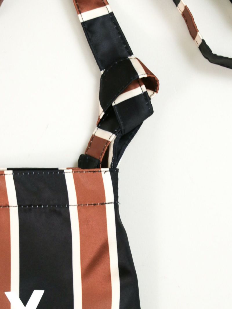 レトロな配色が魅力のストライプ柄サコッシュ。 フロントにプリントされたロゴがコーディネートのアクセントにぴったりです。ユニセックスでお使いいただけます。