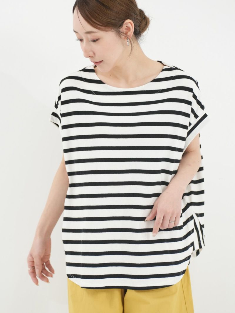 毛羽立ちや糸ムラが少ない空紡糸を使用したコットンT。 広めの身幅で、ゆったりとしてリラックス感があります。フレンチスリーブと、ラウンドヘムがシルエットのアクセントになります。