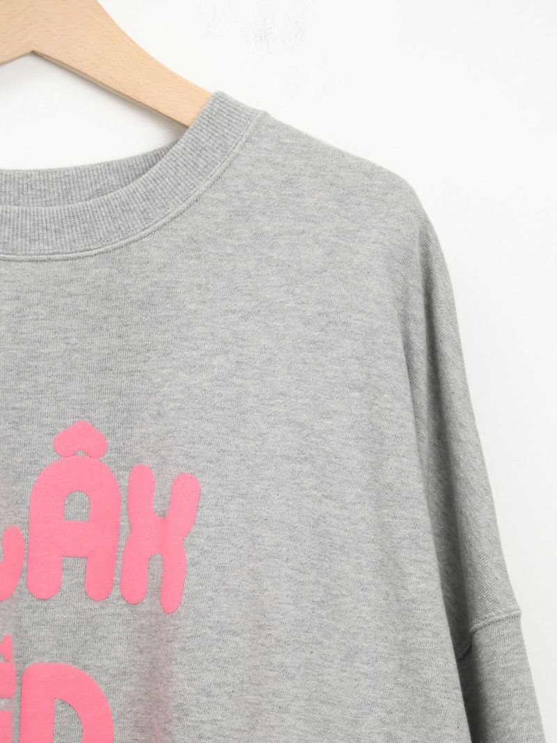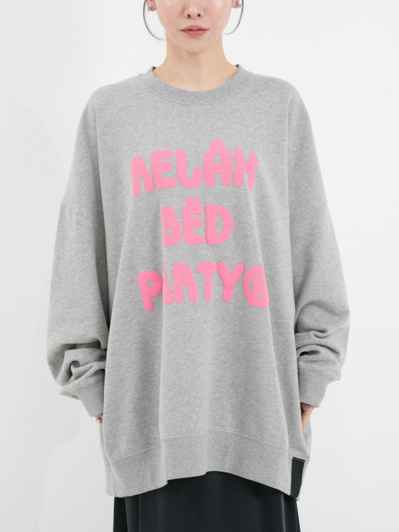 オーバーサイズでかなりゆったりしたスウェットプルオーバー。 やや薄手のパイル素材を使用。「RELAX BED PARTY」=リラックスしてベッドでパーティのロゴ。発泡プリントのモコモコ感もポイントです。