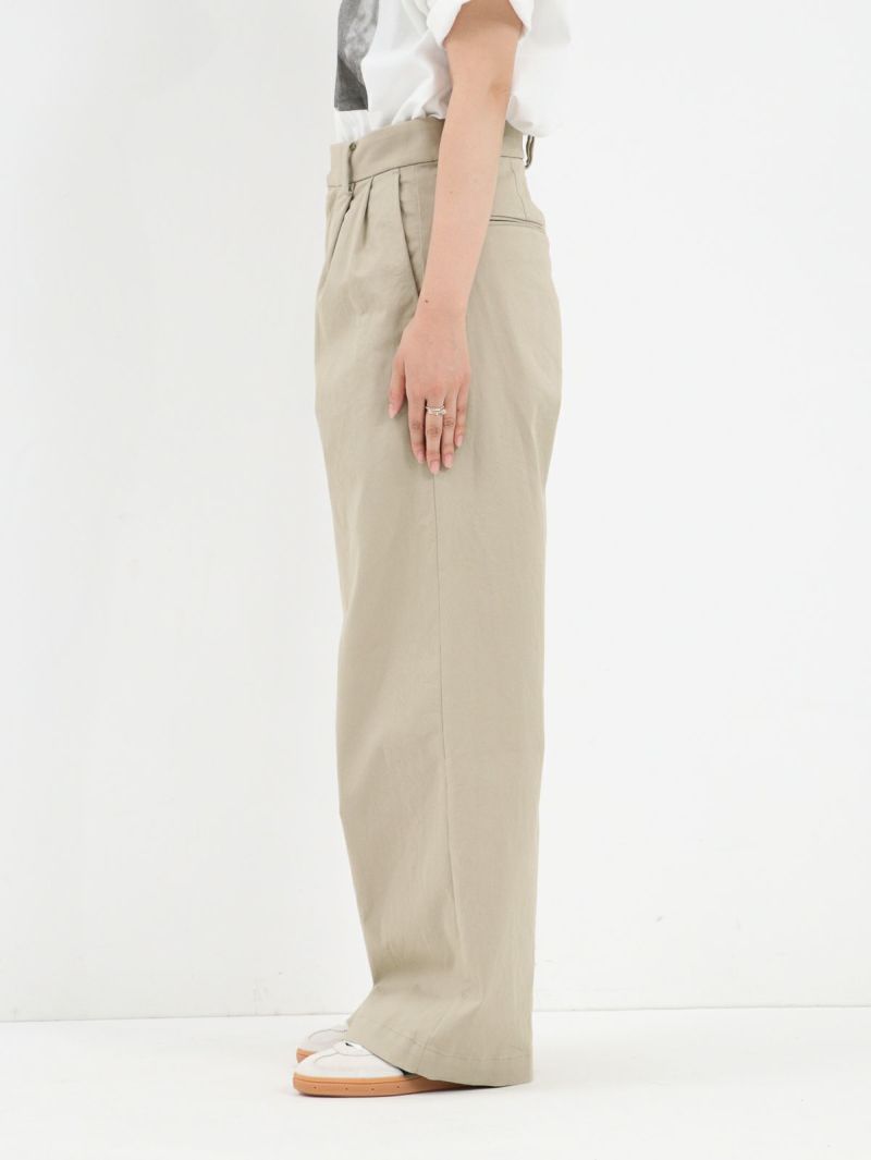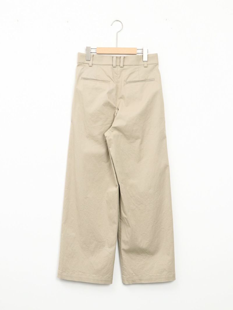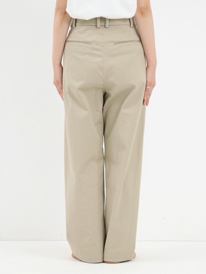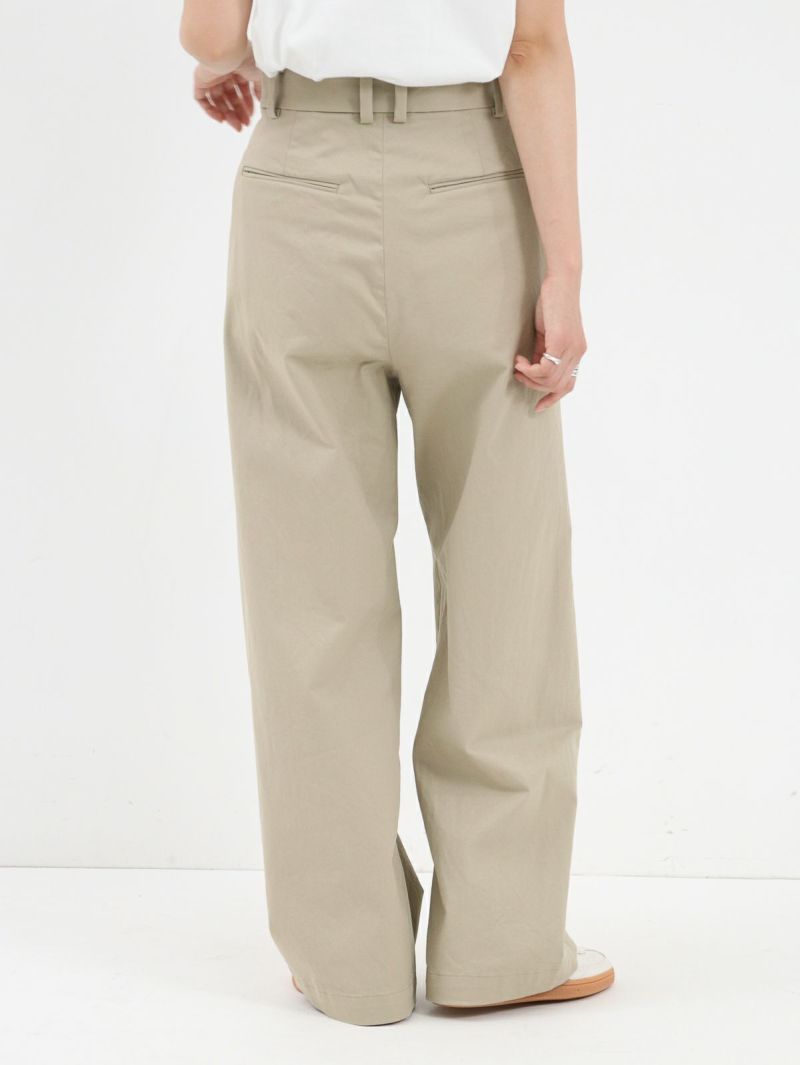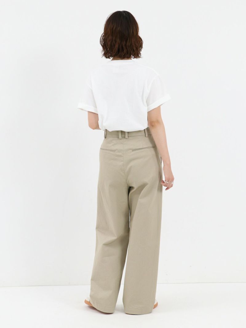 深めの股上とワイドストレートシルエットが美しいチノパン。 上質な超長綿のオーガニックインド綿を使ったチノを使用し、仕上げに表面に施したピーチ加工により、微起毛感で滑らかな風合いに。丈夫でシワになりにくい機能性にも優れ、定番のベージュは濃すぎない色でどんな色とも相性が良いので、着回し力抜群です。