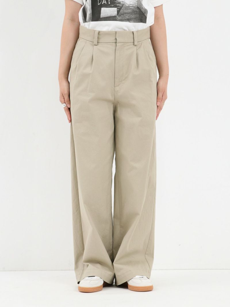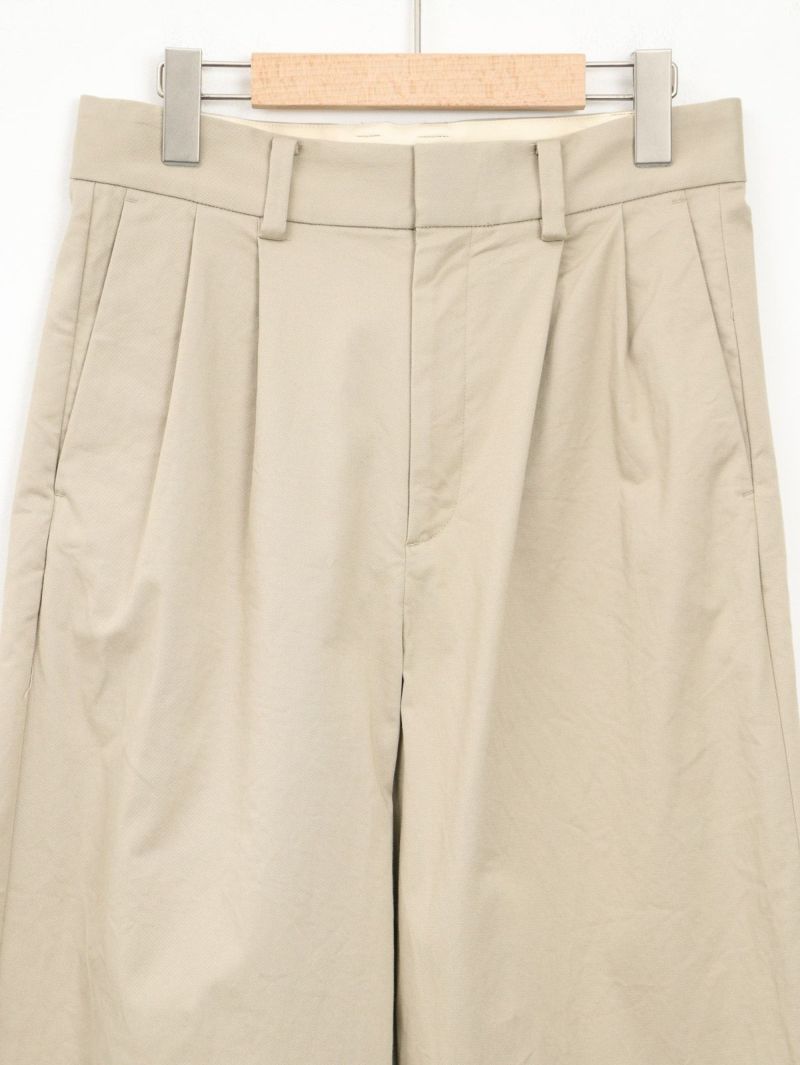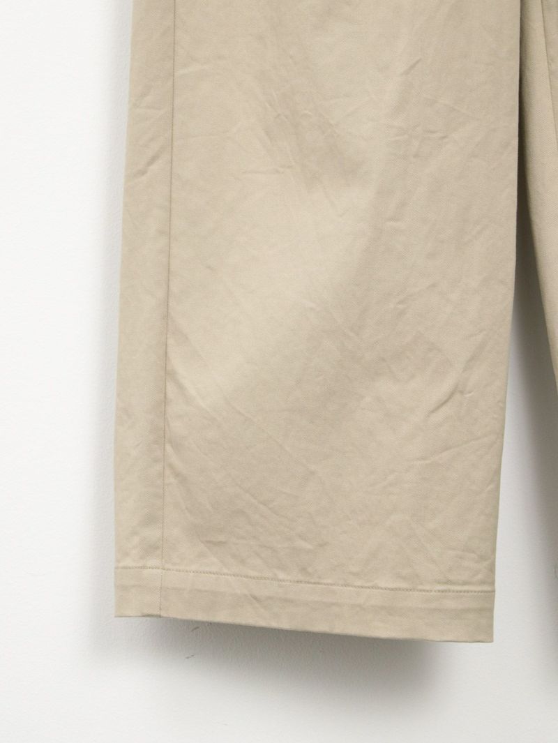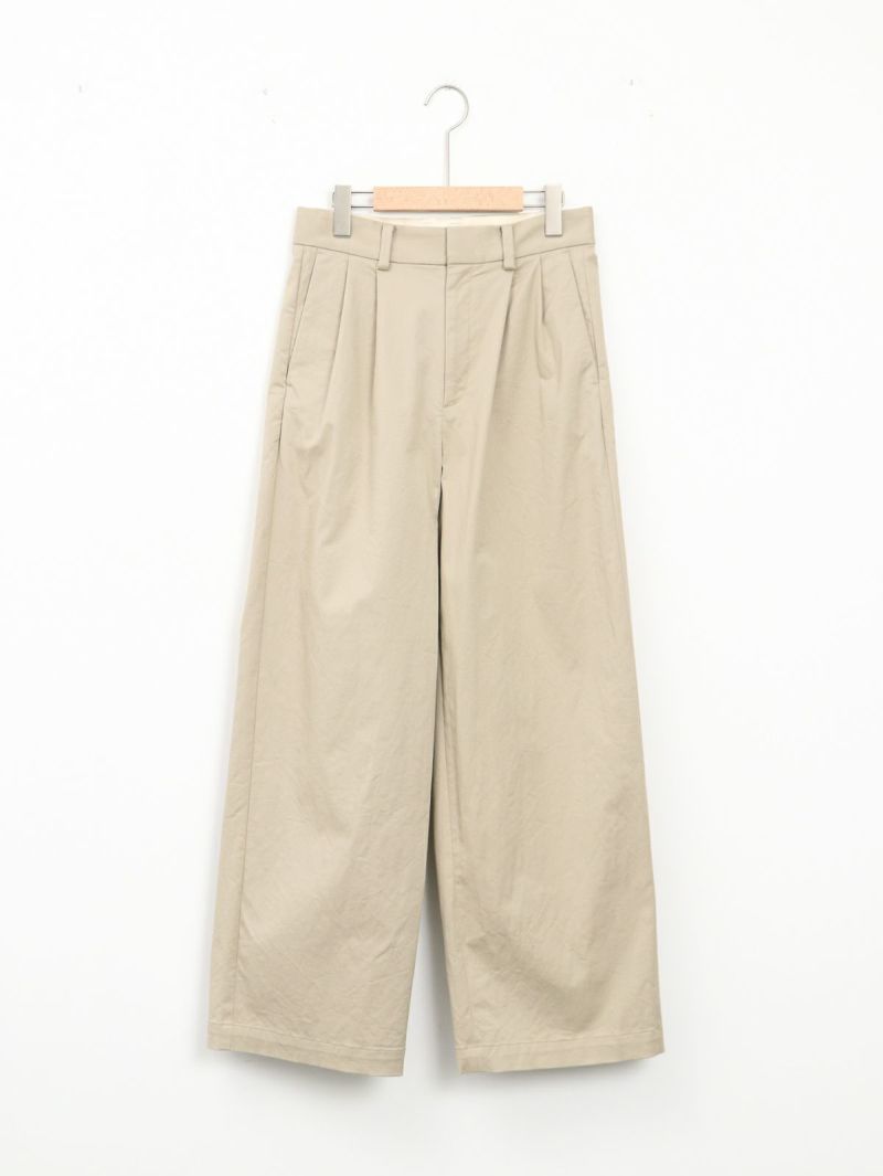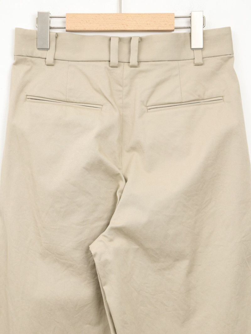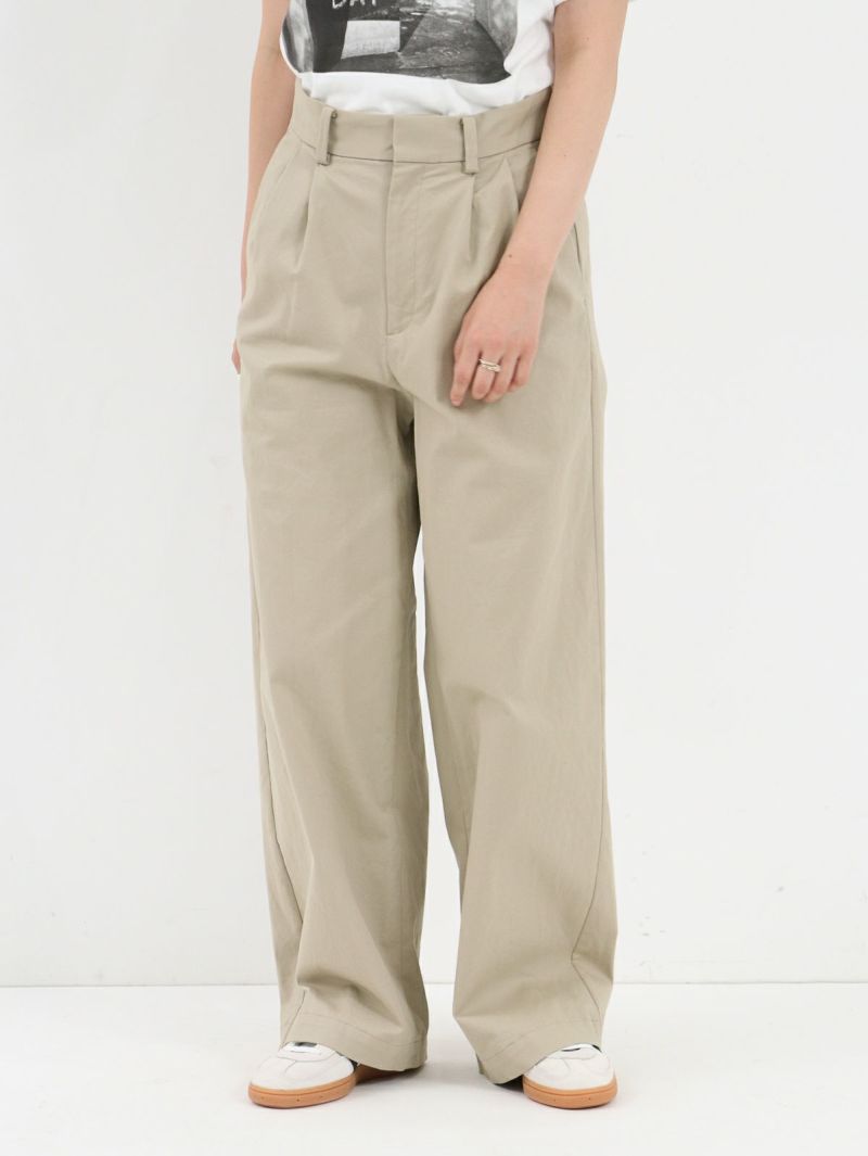 深めの股上とワイドストレートシルエットが美しいチノパン。 上質な超長綿のオーガニックインド綿を使ったチノを使用し、仕上げに表面に施したピーチ加工により、微起毛感で滑らかな風合いに。丈夫でシワになりにくい機能性にも優れ、定番のベージュは濃すぎない色でどんな色とも相性が良いので、着回し力抜群です。