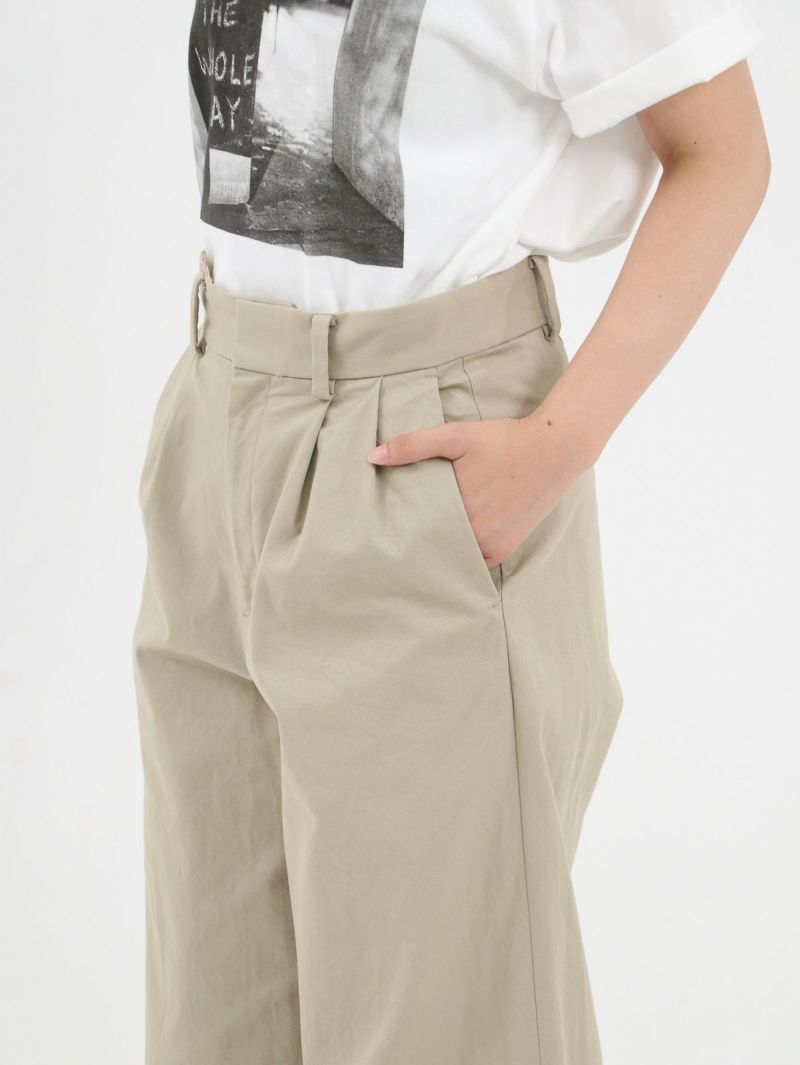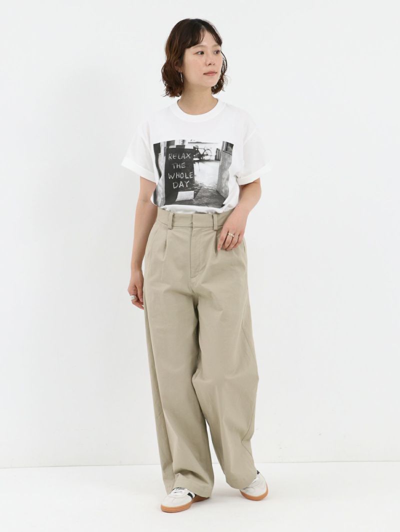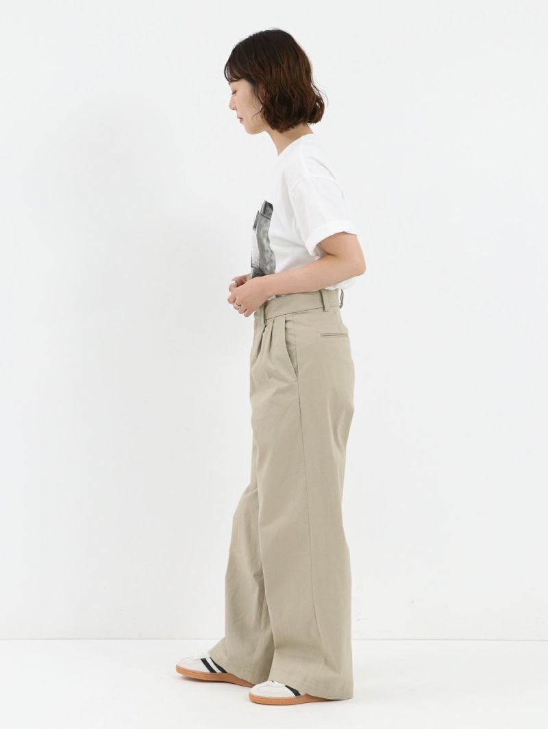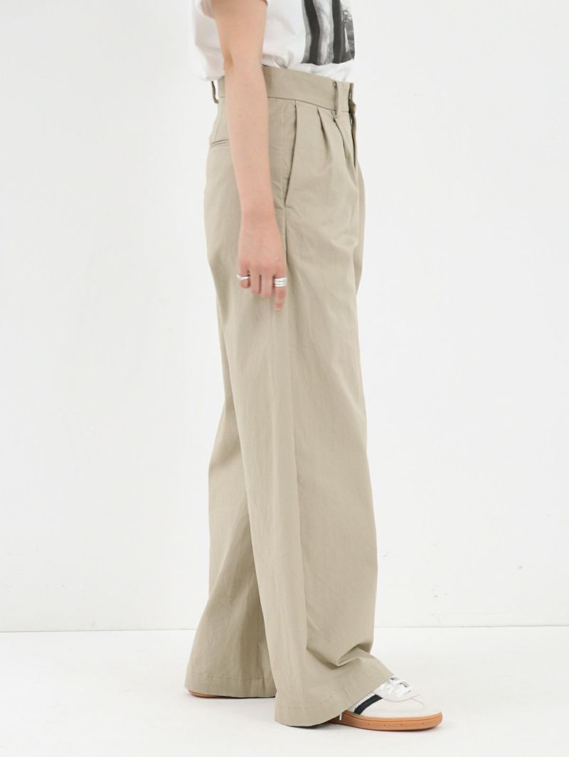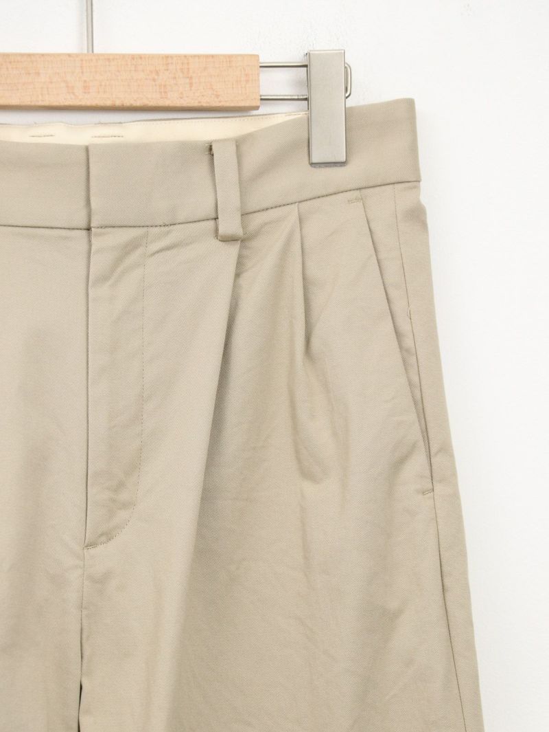 深めの股上とワイドストレートシルエットが美しいチノパン。 上質な超長綿のオーガニックインド綿を使ったチノを使用し、仕上げに表面に施したピーチ加工により、微起毛感で滑らかな風合いに。丈夫でシワになりにくい機能性にも優れ、定番のベージュは濃すぎない色でどんな色とも相性が良いので、着回し力抜群です。