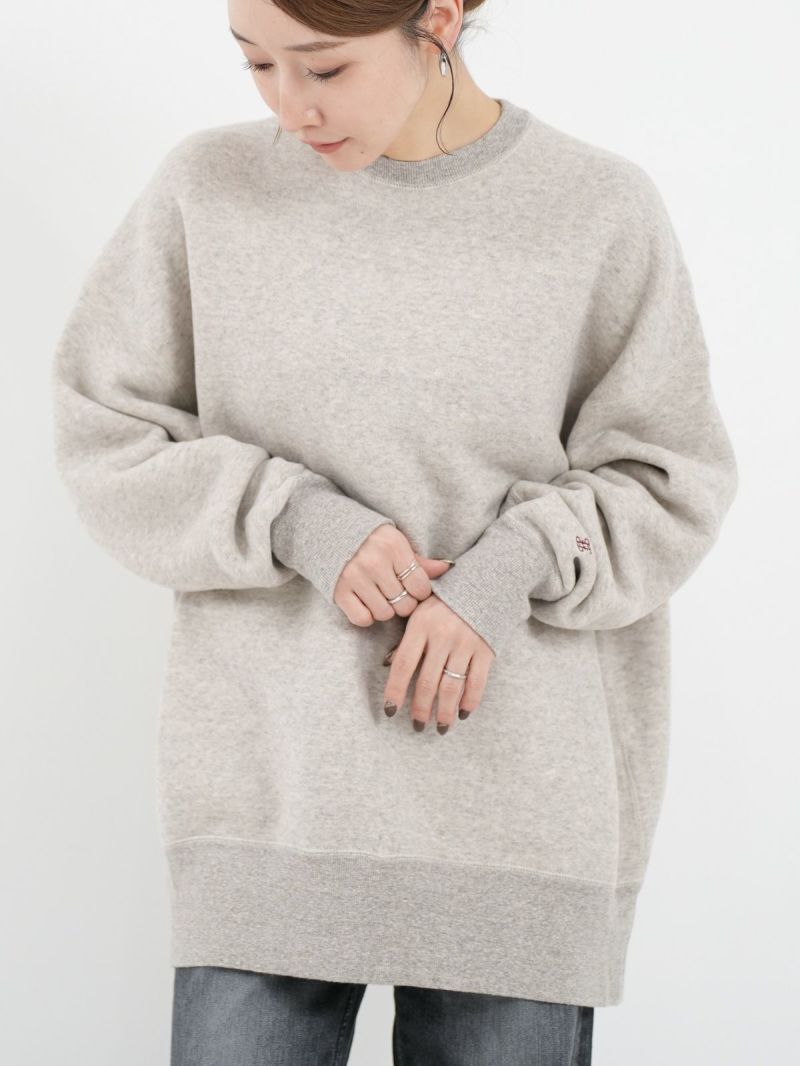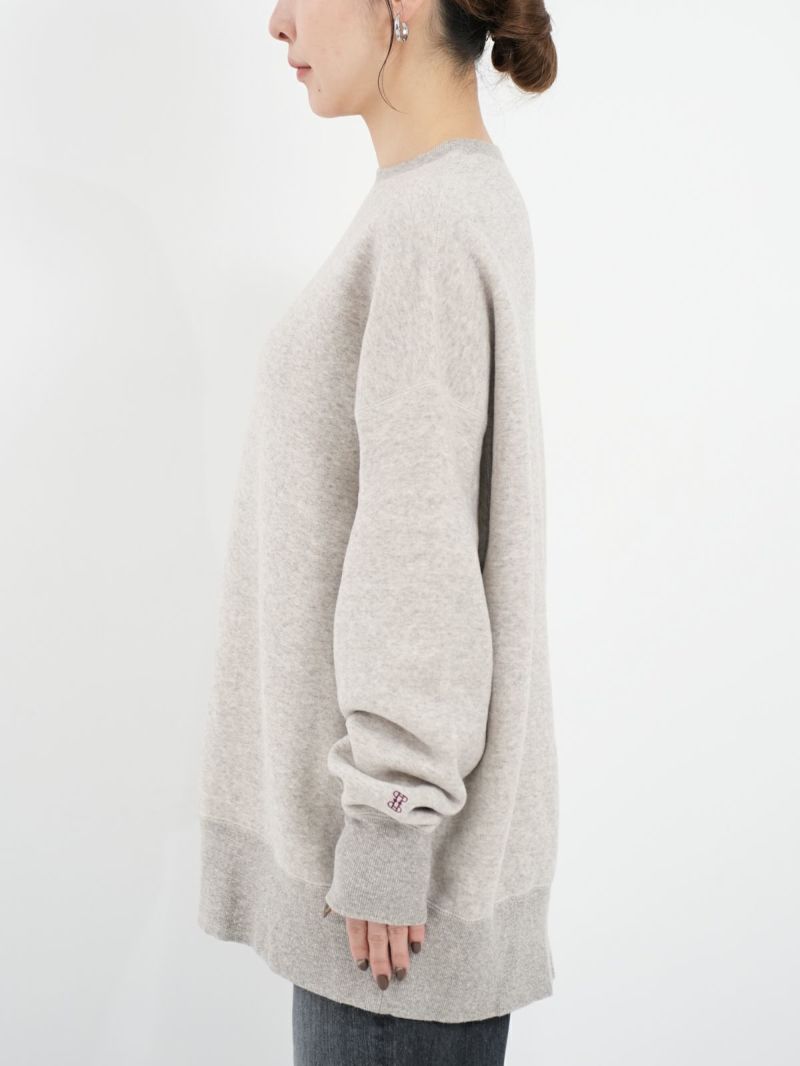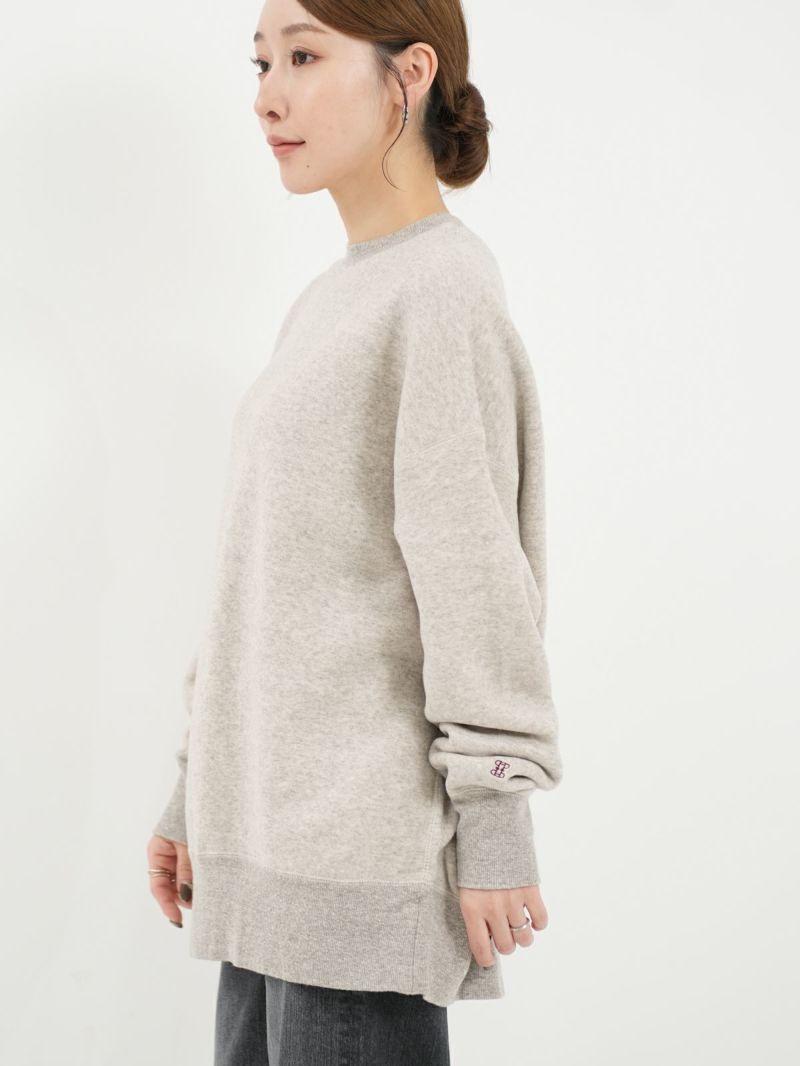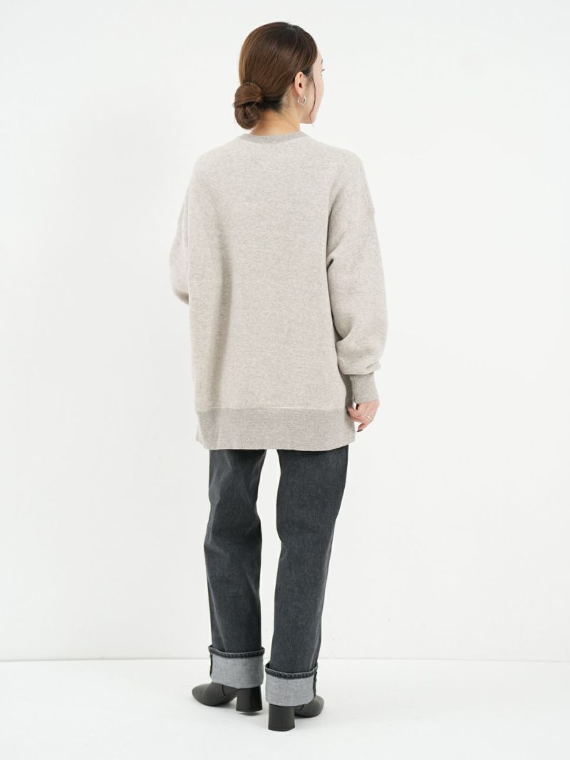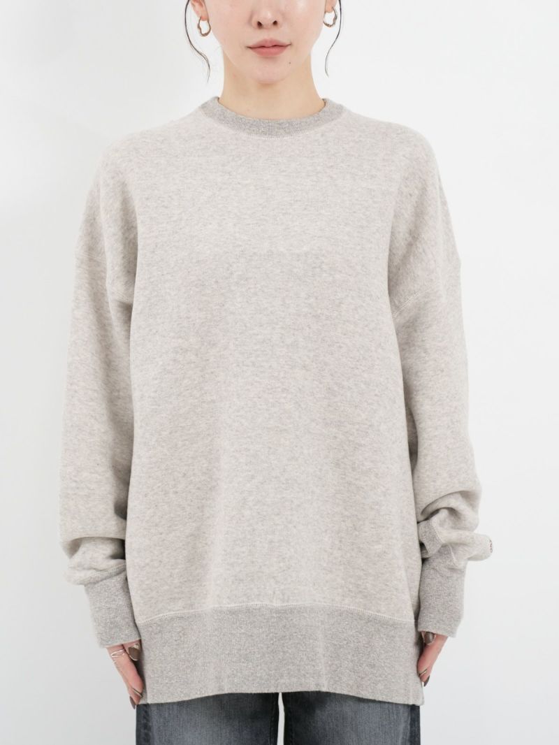 表も裏も両面起毛することで滑らかで優しさのある極上の肌触りのプルオーバー。 リヨセル素材(再生セルロース繊維で環境にも配慮した素材)とコットンの混紡糸を使用した裏毛は、特殊な編み立てにより、肉厚ながら固くならずふっくらとした風合いが魅力的です。 長めの着丈に仕上げ、ドレッシーなボトムスともスタイリングしやすいトップス。シンプルにデニムに合わせても大人っぽくなり、スカートにも合わせやすい一枚。