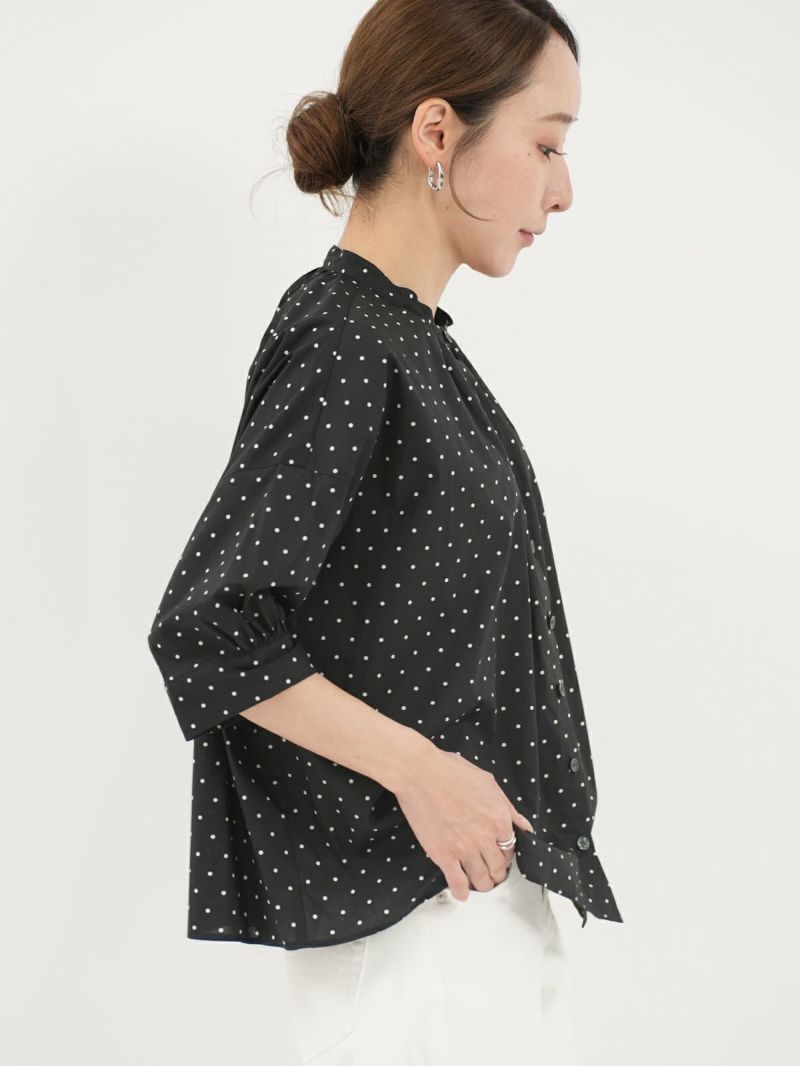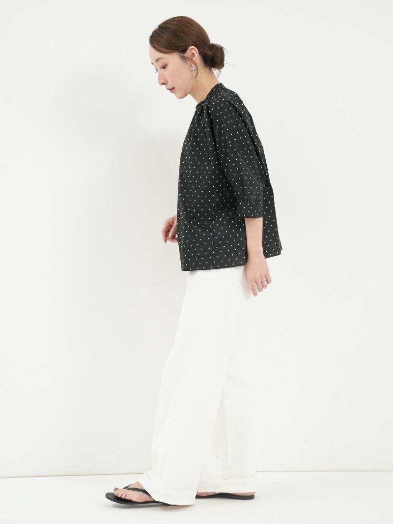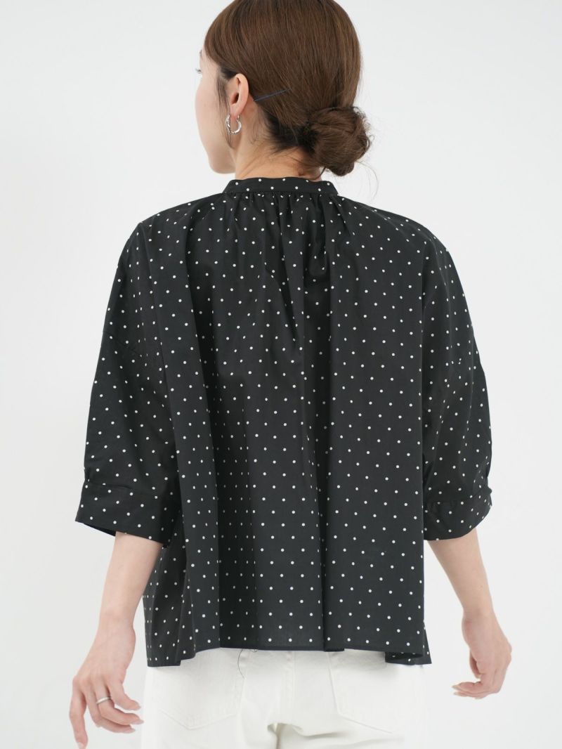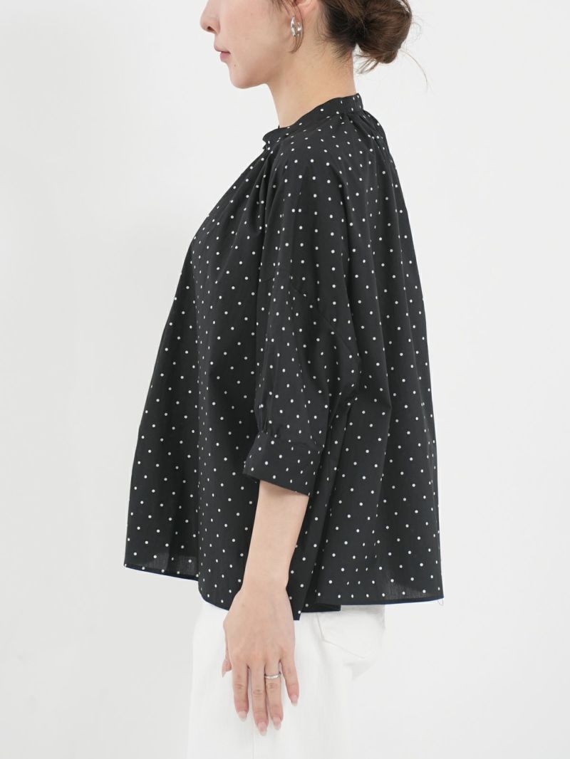 高密度に織り上げられたコットン生地を使用したギャザーブラウス。 薄手でさらっとしたなめらかな肌触りが、暑い夏の時期にも涼しく着ていただけます。 たっぷりとした身幅に首元と袖口のギャザーでふんわりとしたシルエットです。