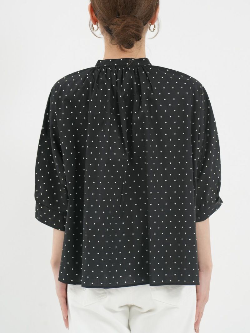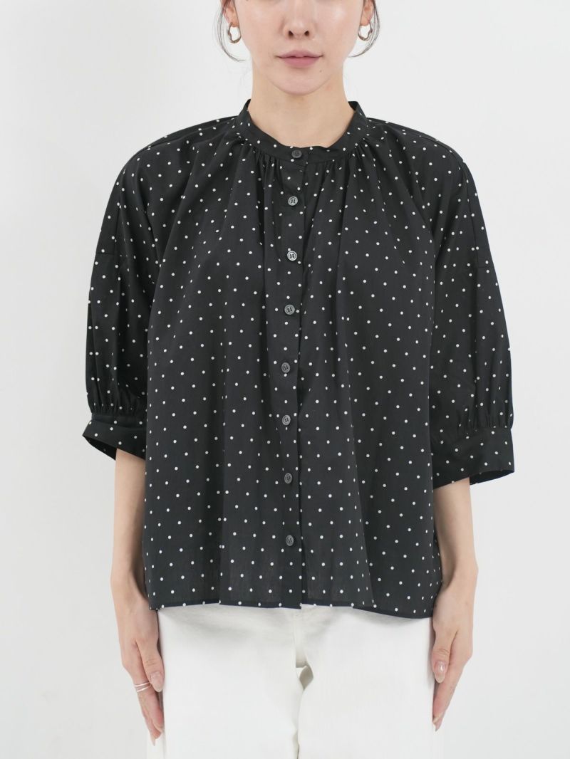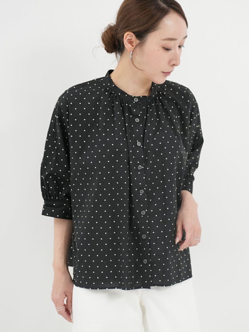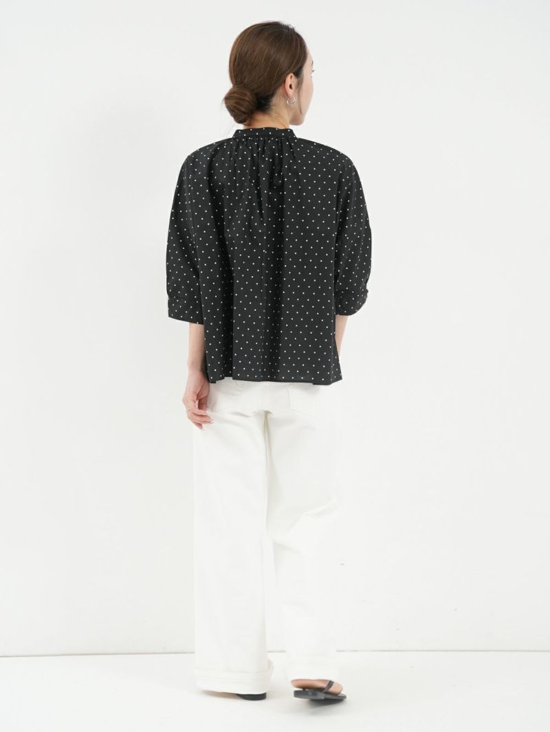 高密度に織り上げられたコットン生地を使用したギャザーブラウス。 薄手でさらっとしたなめらかな肌触りが、暑い夏の時期にも涼しく着ていただけます。 たっぷりとした身幅に首元と袖口のギャザーでふんわりとしたシルエットです。