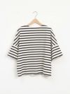 フランス語で”洗いざらし”という意味のデラヴェ生地を使用した、ボーダーカットソーです。袖のボーダーの切り替えやバックのボタンがアクセントになってます。