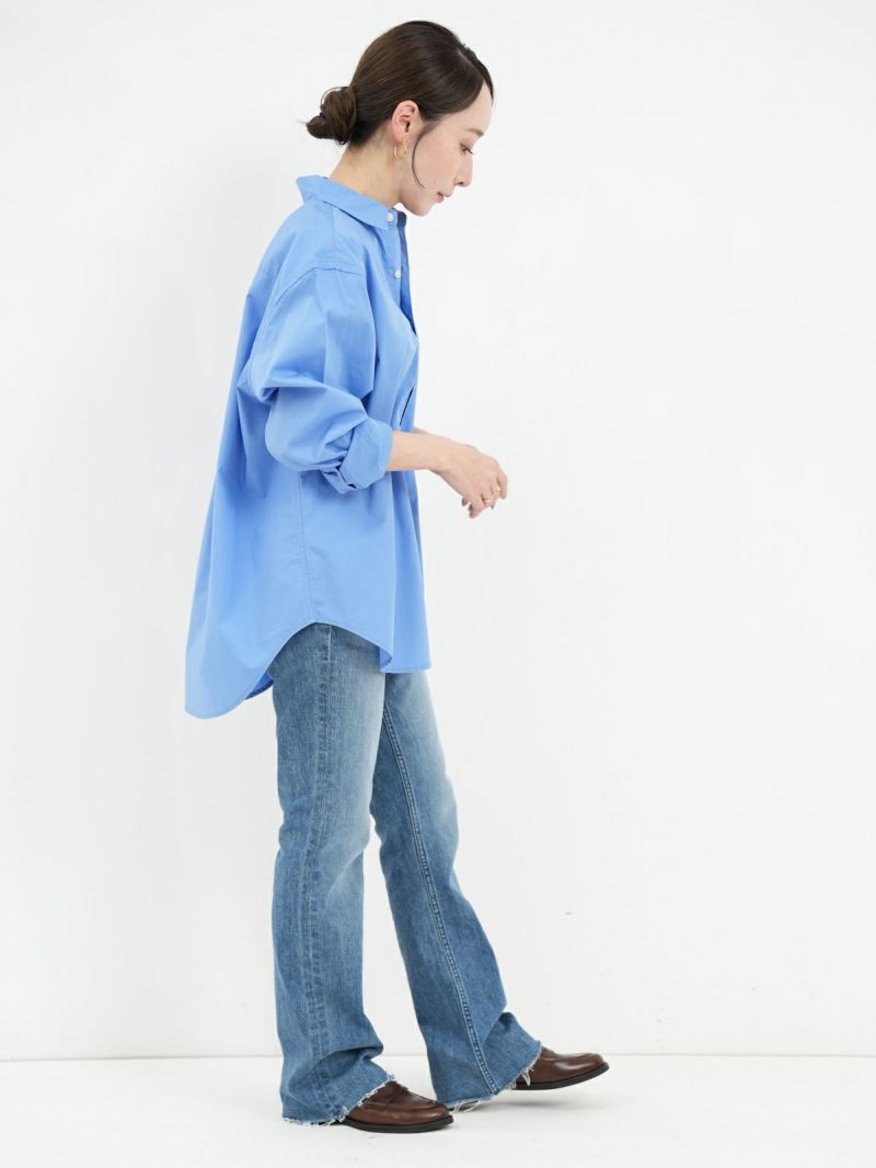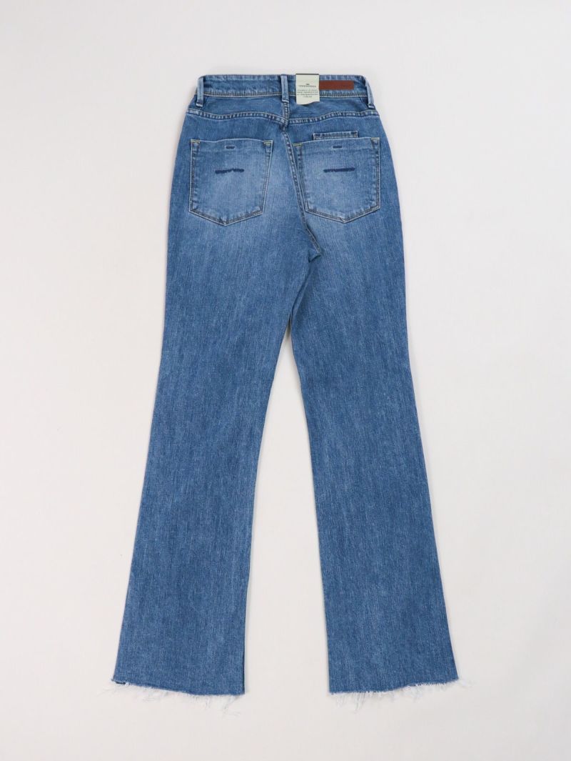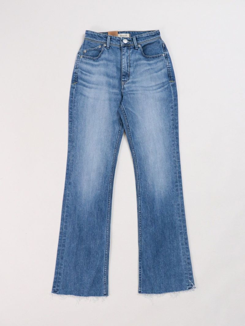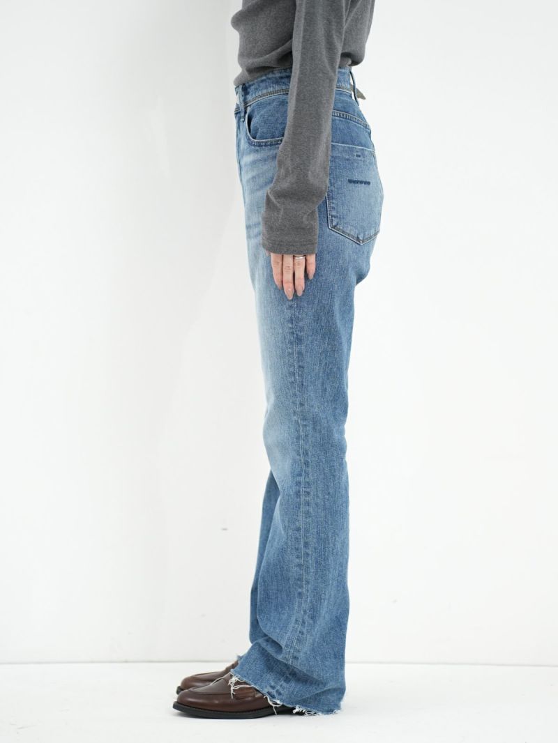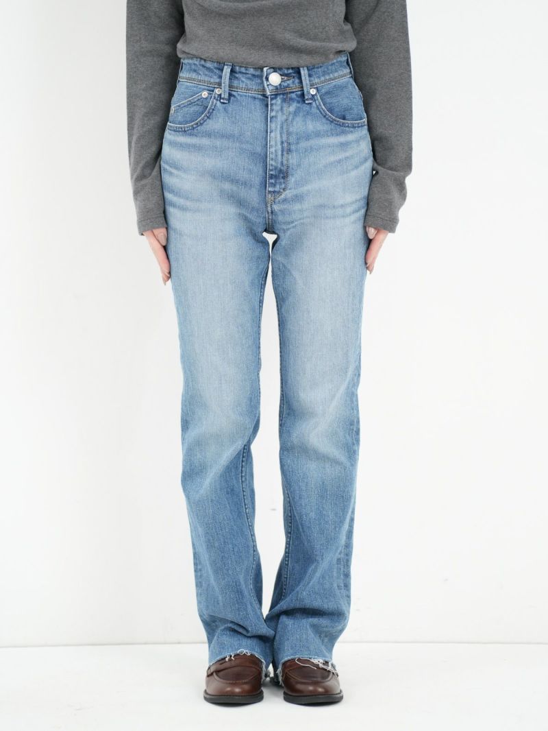 ハイウエストのセミフレア。 フレア感が抑えられており、ストレートに近いブーツカット。膝位置を高く設定することで高い膝位置から自然に広がるフレアが脚を長く見せてくれます。