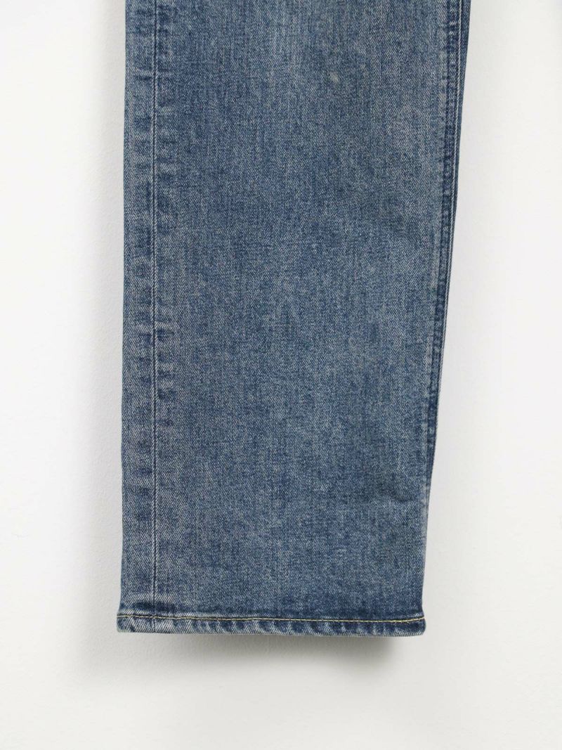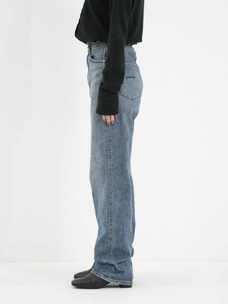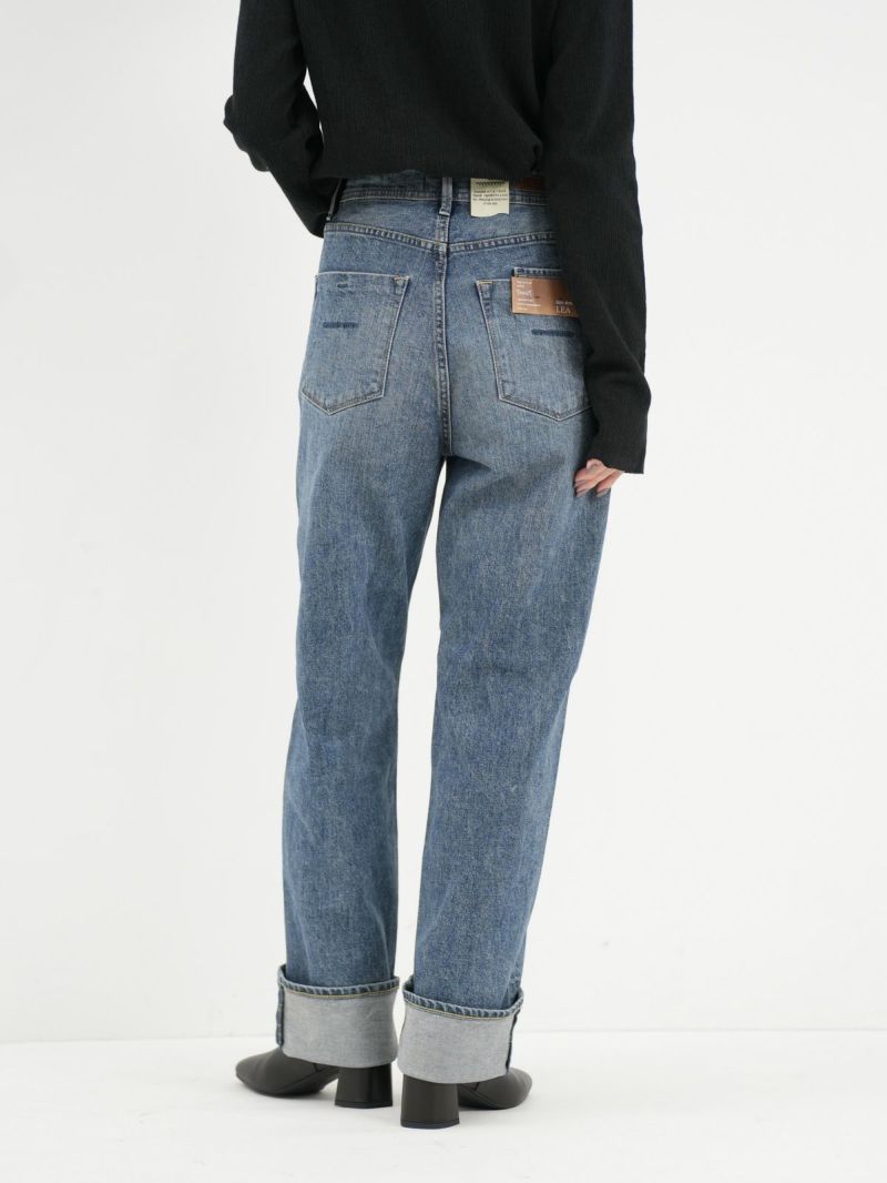 股上が深く程よくゆるっとしたボーイズストレートのLEA(レア)。 ゆとりのあるストレートはどうしても野暮ったくなりがちですが、LEAはパターンにこだわることで美脚に、そして脚長に見せてくれる女性らしいシルエットです。くすんだブルーの色味が秋冬のカラーコーデにも合わせやすくマッチします。カジュアルなトップスはもちろんテーラードジャケットなどのキレイめアイテムとも相性がよく、シンプルなコーディネートが様になる通年お使いいただけるアイテムです。