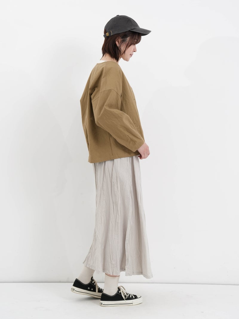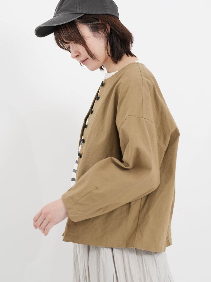 フロントに並んだボタンがさりげないアクセントになり、シンプルながら存在感のある一枚です。軽い着心地と程よい着丈でパンツにもスカートにも合わせやすく、コーディネートの幅が広がります。