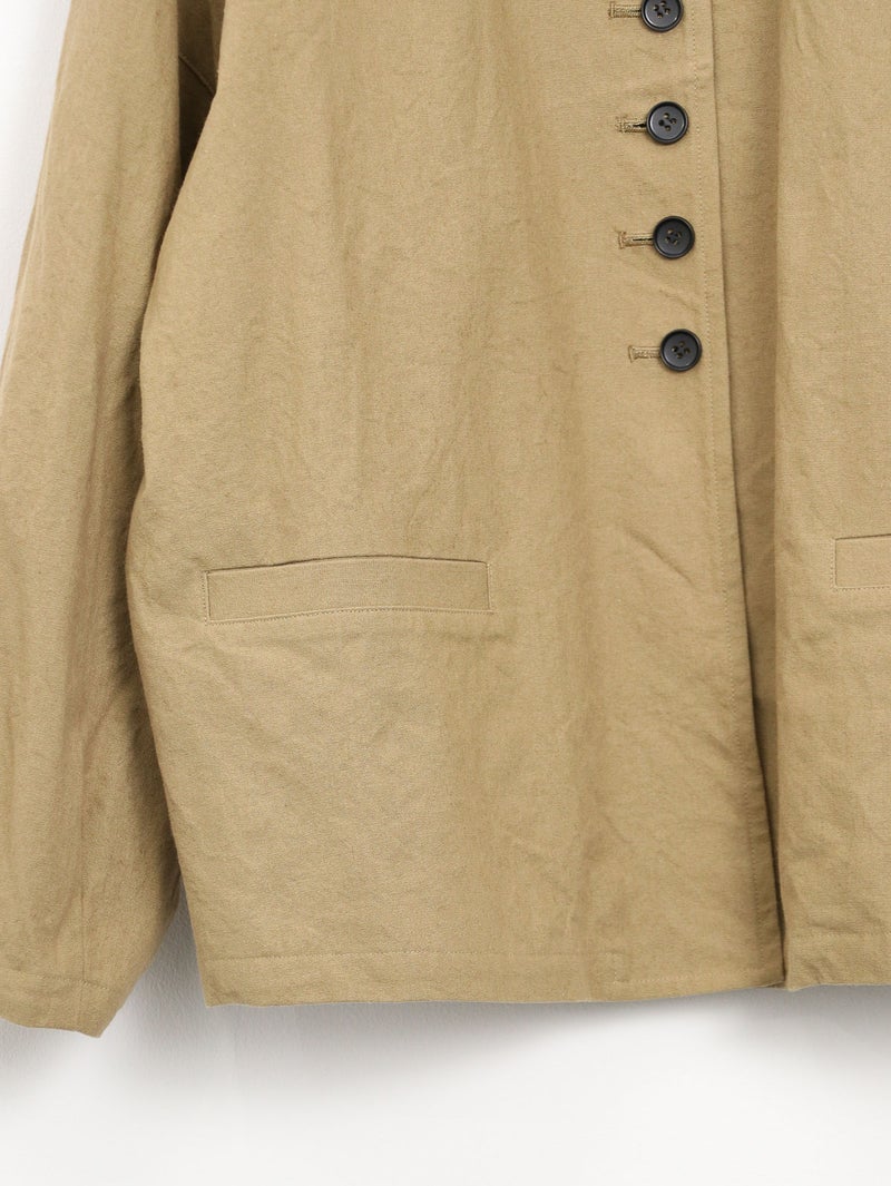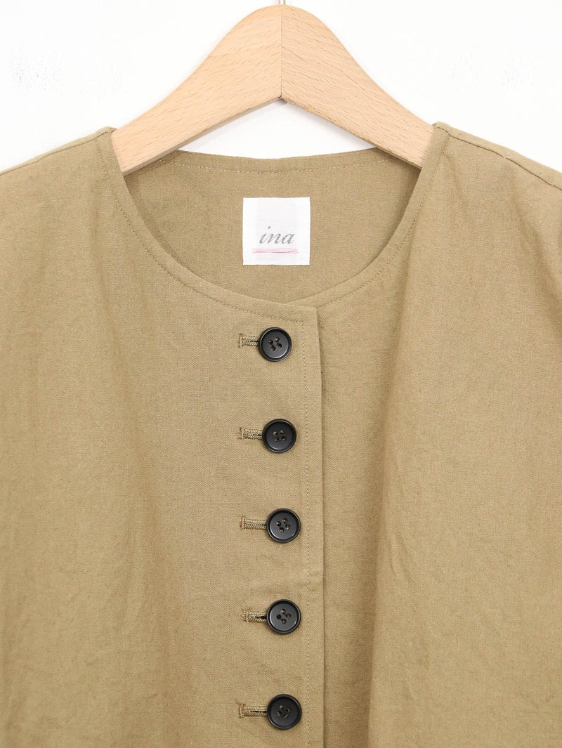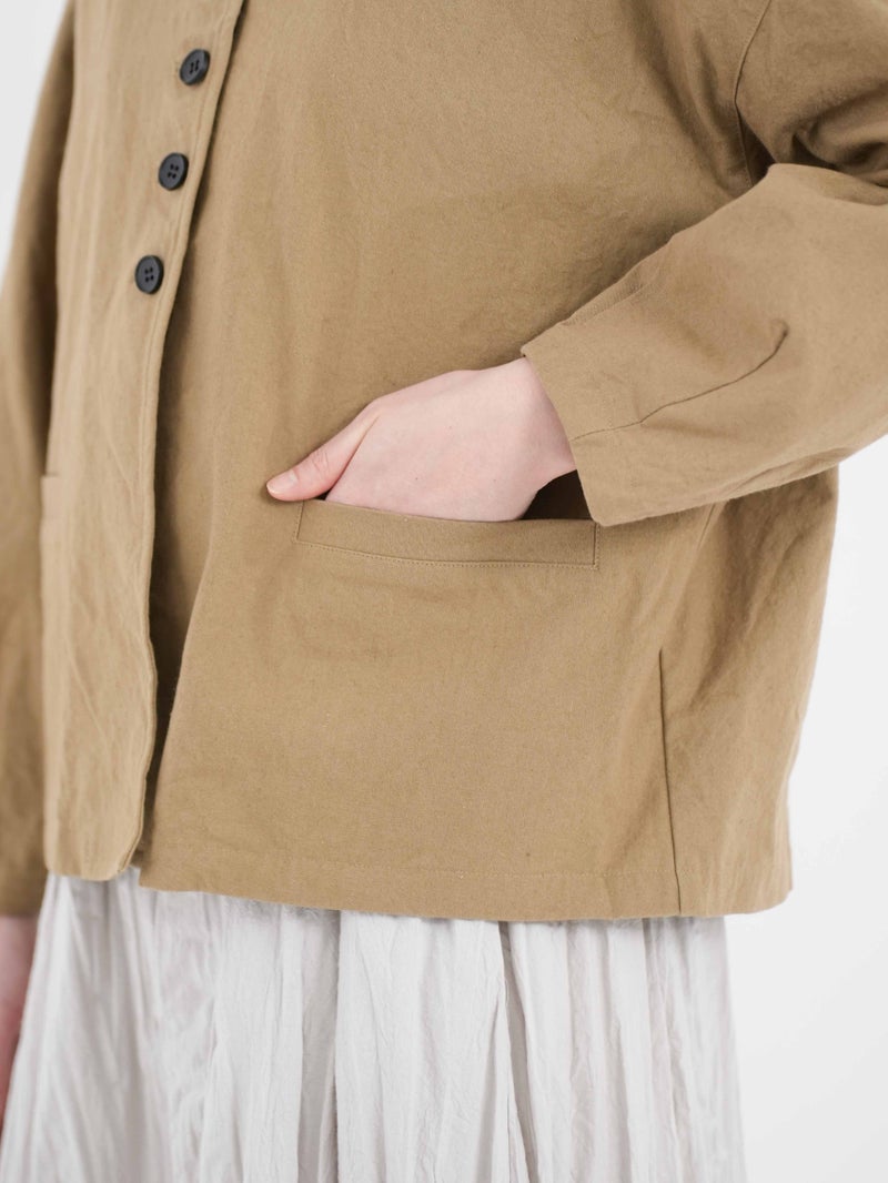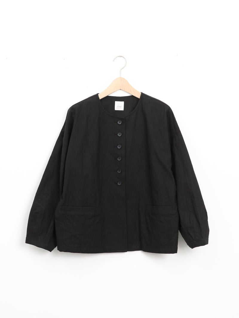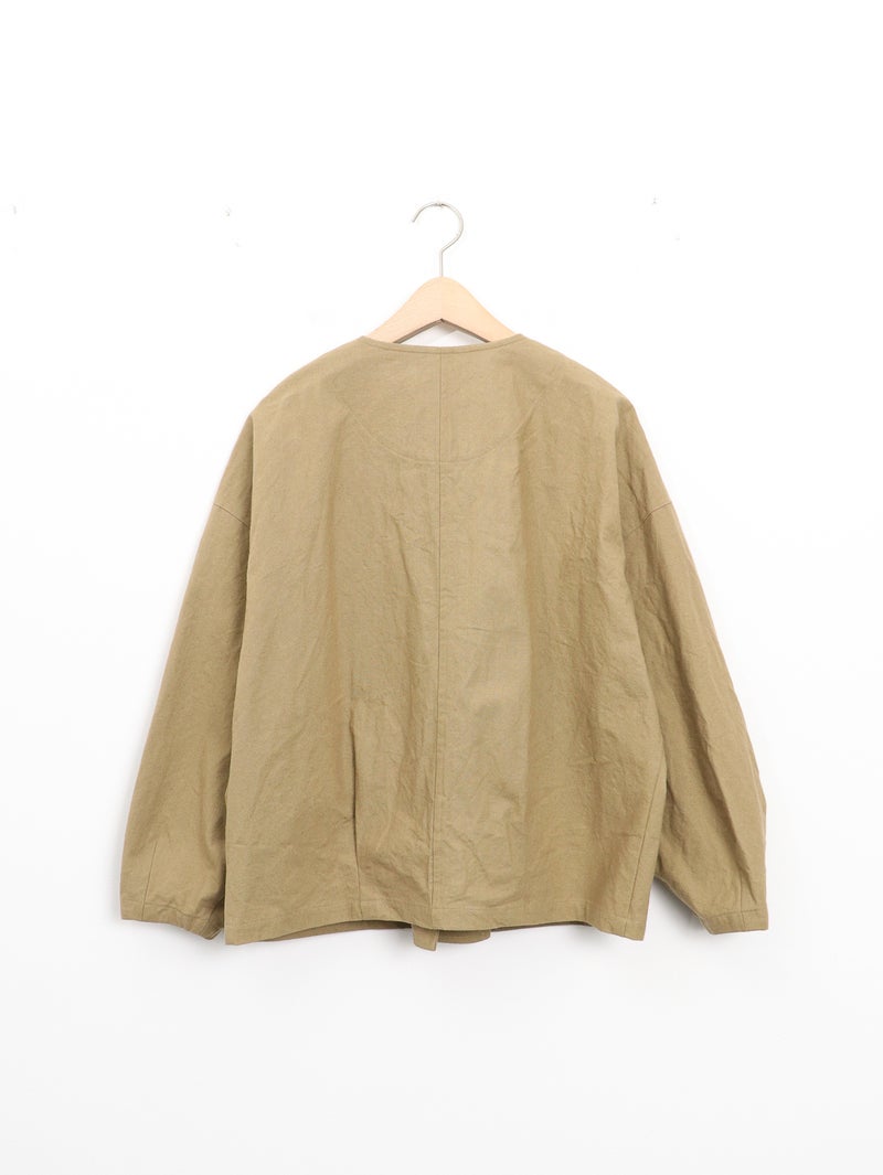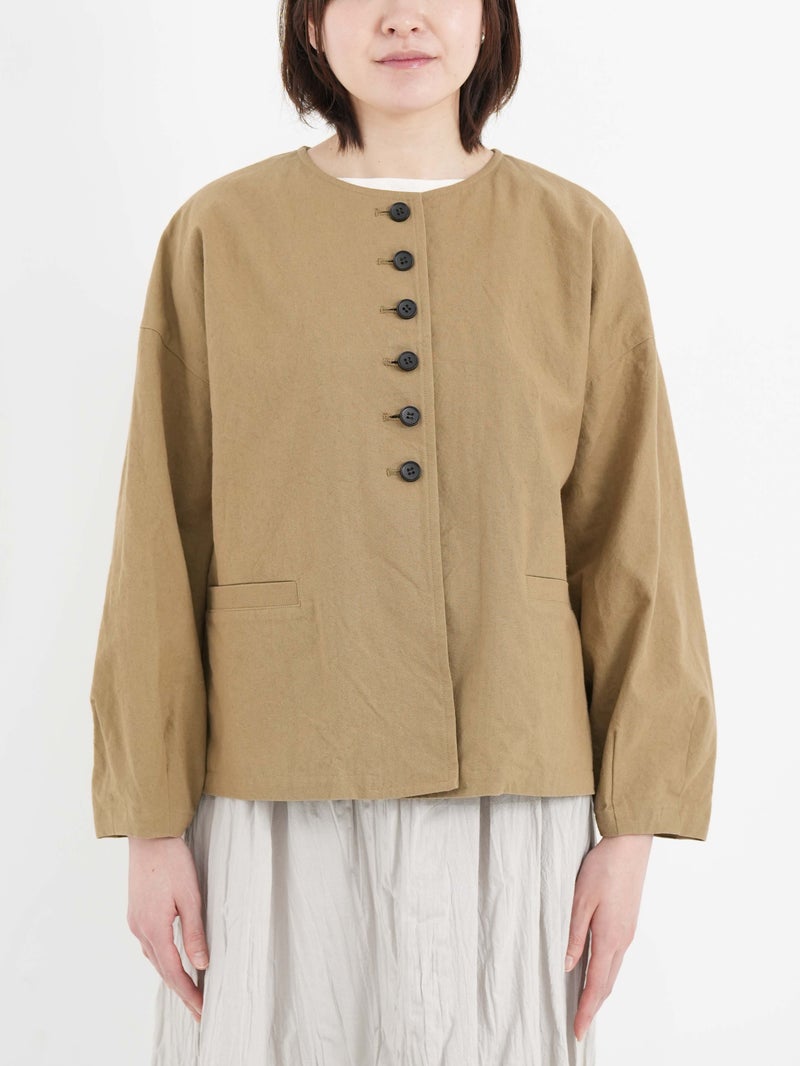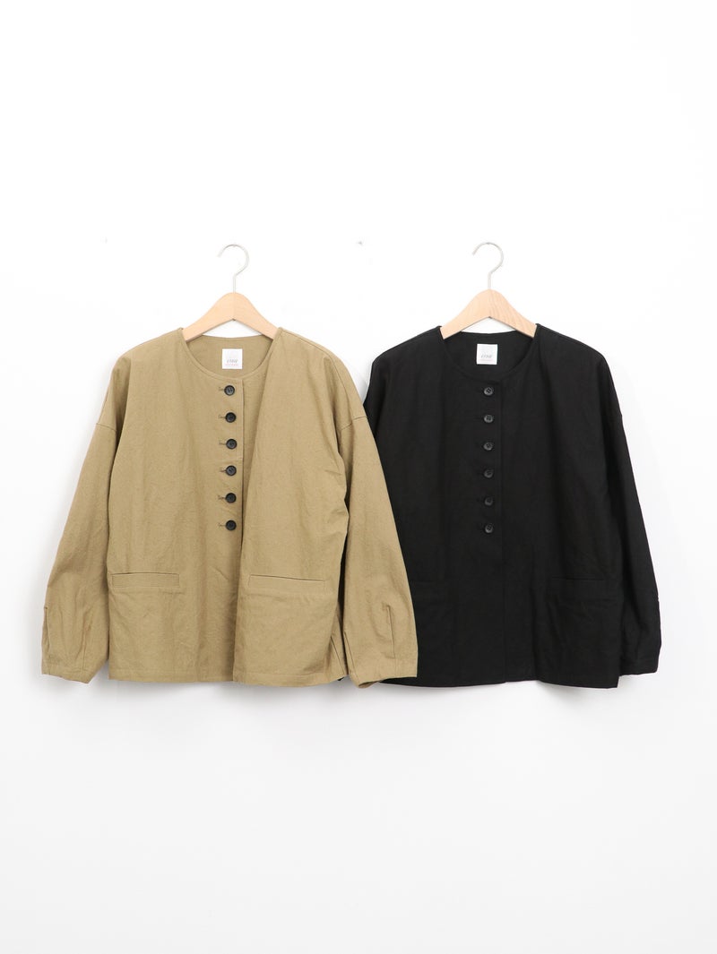 丸みのあるクルーネックがやわらかな印象のノーカラージャケット。