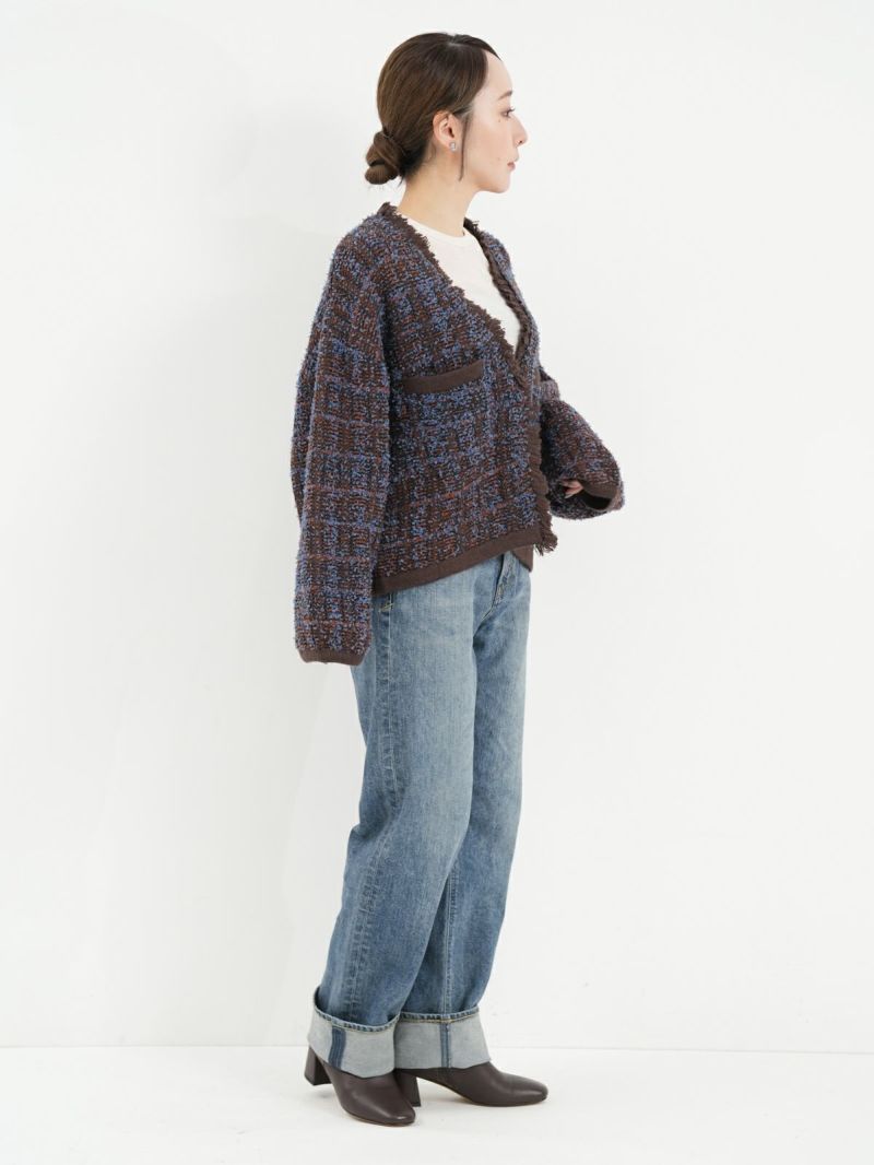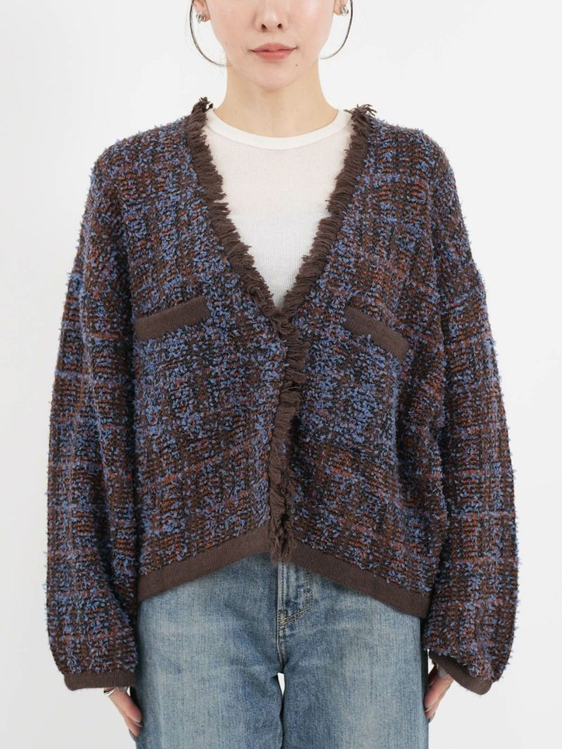 Vネックのツィードニットがクラシックで上品な印象を与えるカーディガン。