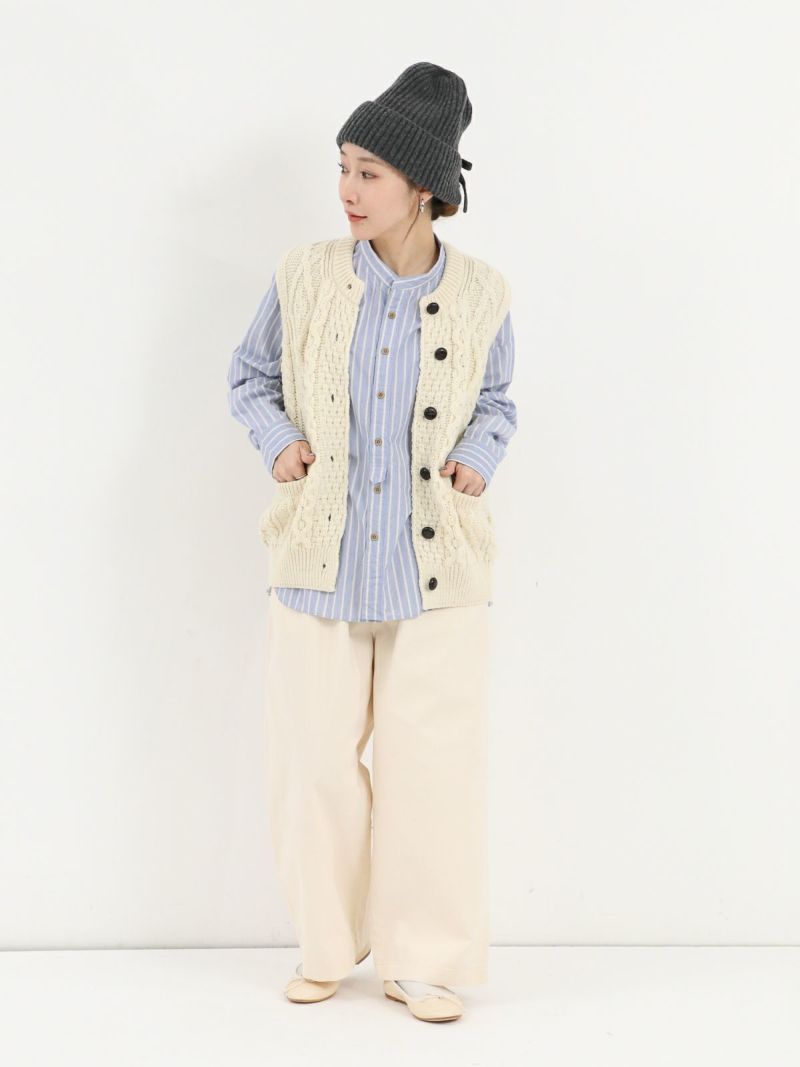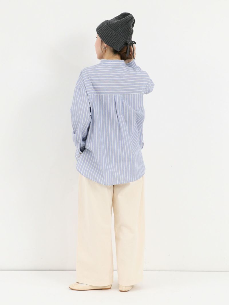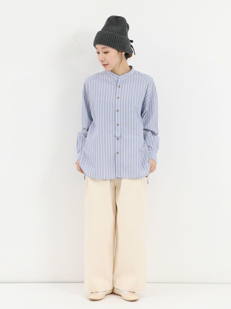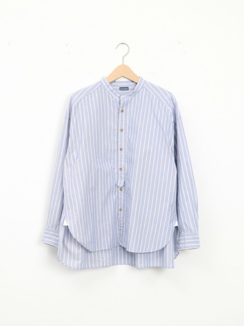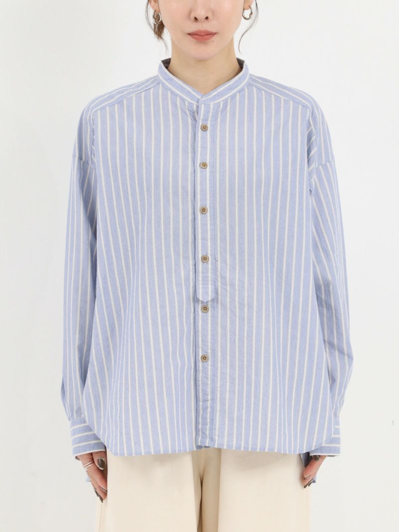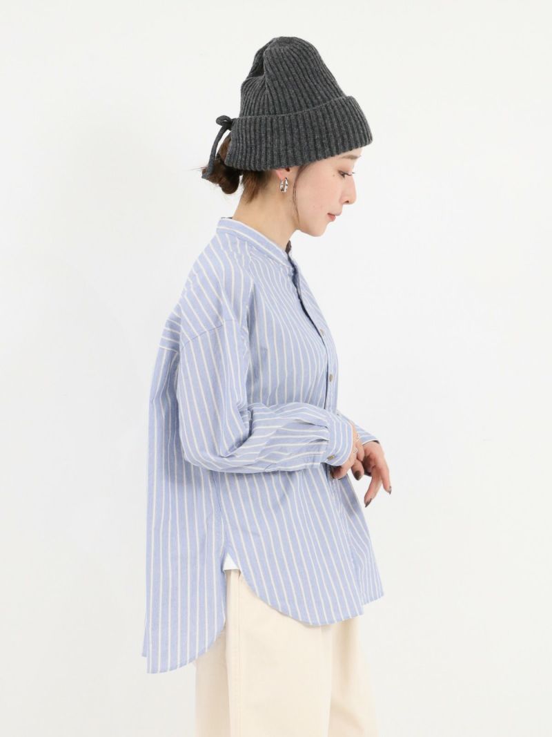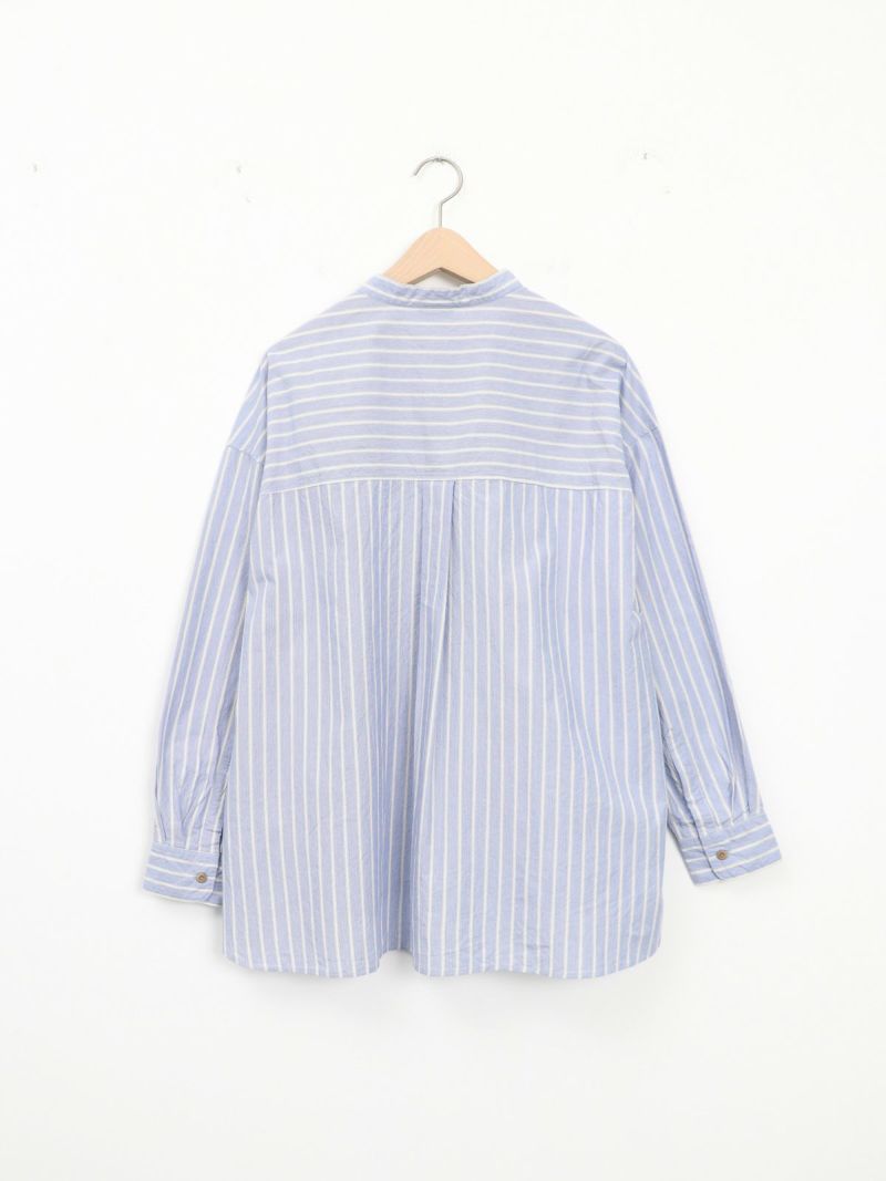 洗いをかけたコットン100%のストライプバンドカラーシャツ。 ゆったりとした身幅でネック周りも余裕のあるサイジングです。裾は前後差があるシルエットで着るだけでナチュラルなラインが仕上がります。デニムやスラックスパンツと相性の良いシャツです。