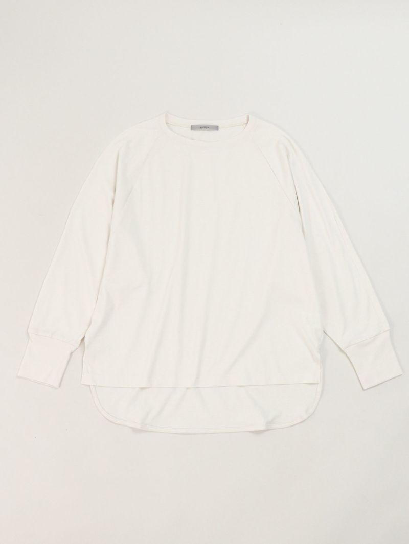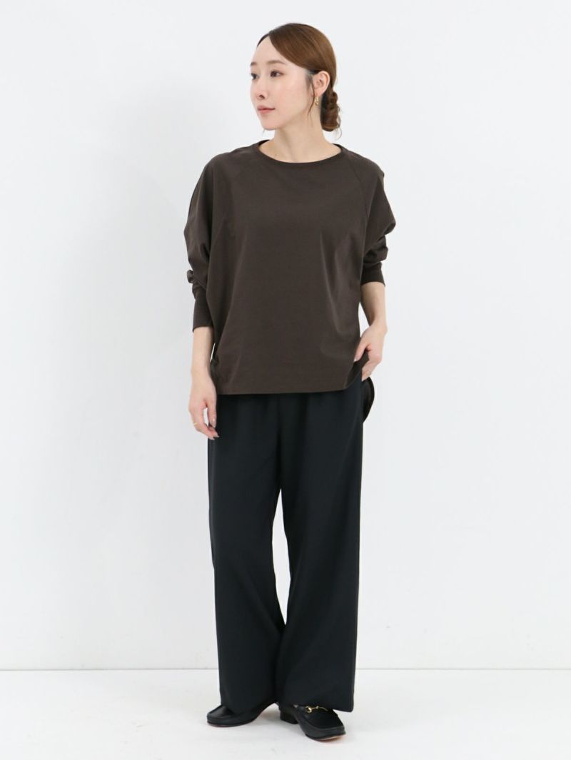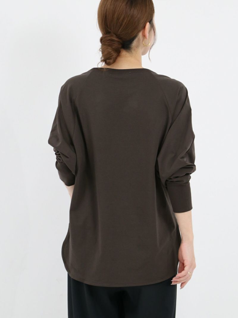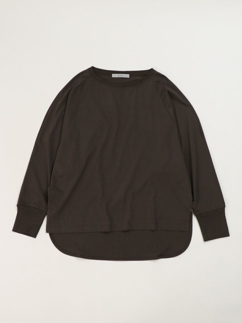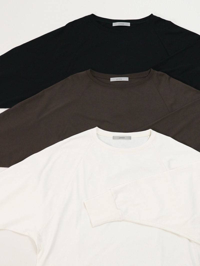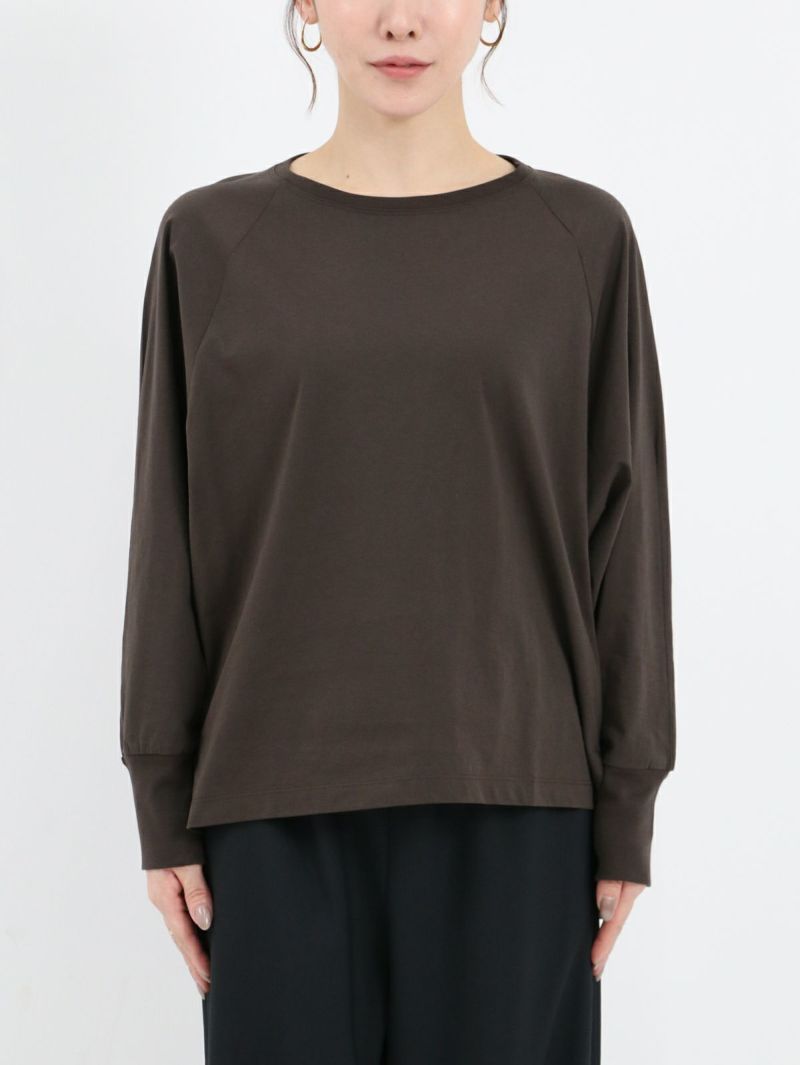 ゆとりを出した肩幅・身幅に長すぎない着丈のシルエット。アームと袖幅を広めにしたラグランスリーブに袖口にリブを付けた9分袖のデザインがポイントです。