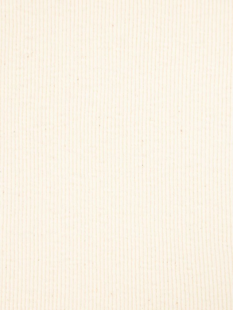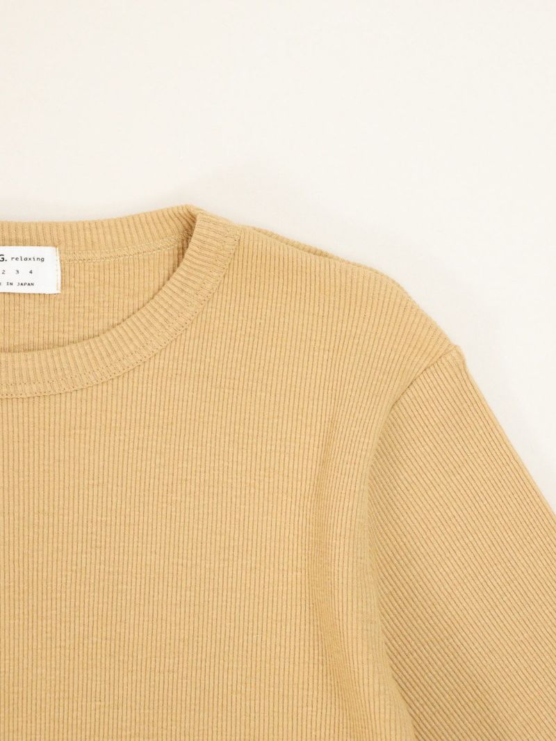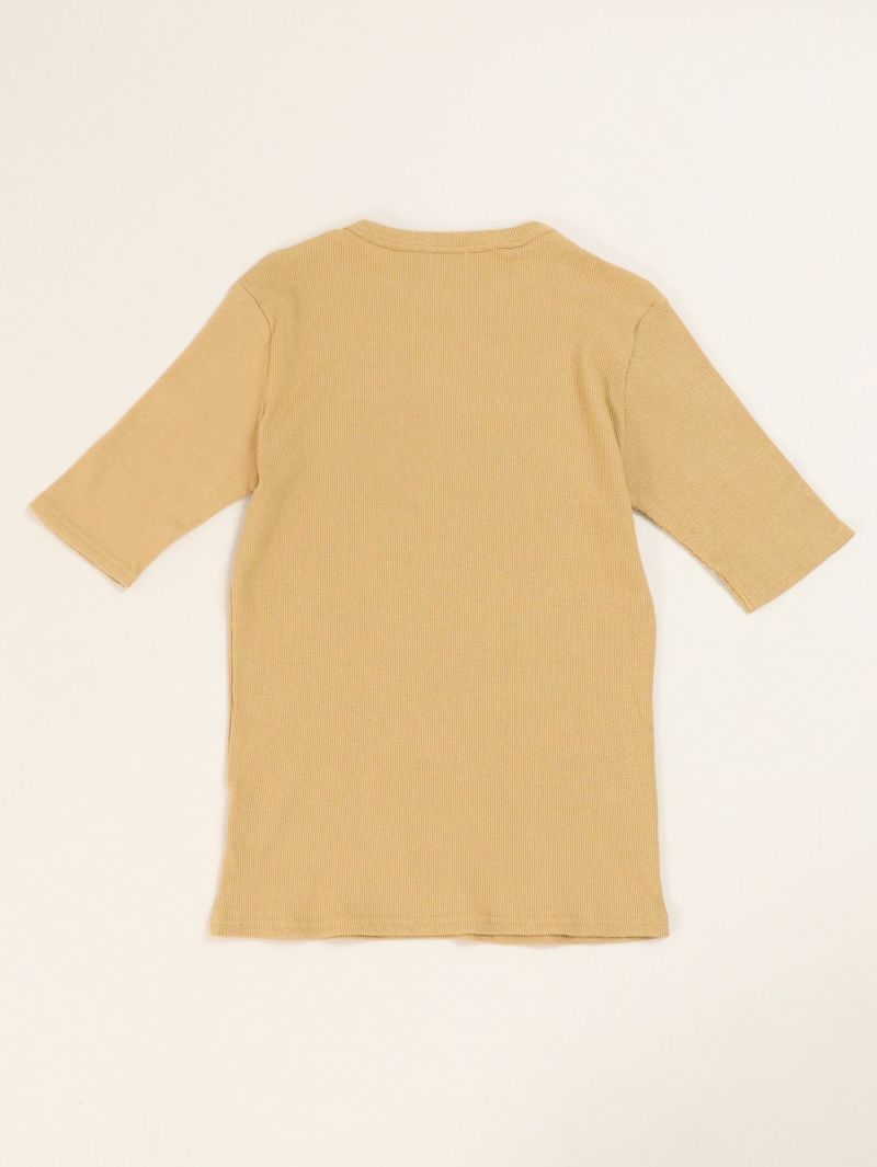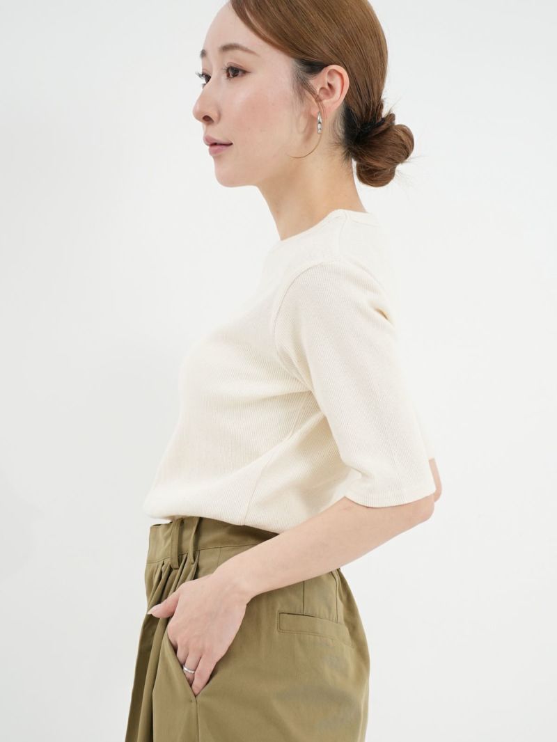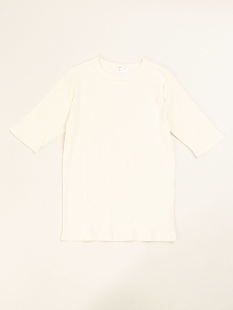 コットン生地のテレコ5分袖T。 自然なムラ感のある優しい質感は落ち綿を使用したリサイクル糸の風合いのある魅力的な仕上がり。ピタッとしすぎない絶妙なサイズ感で1枚でも着やすく秋口まで活躍します。