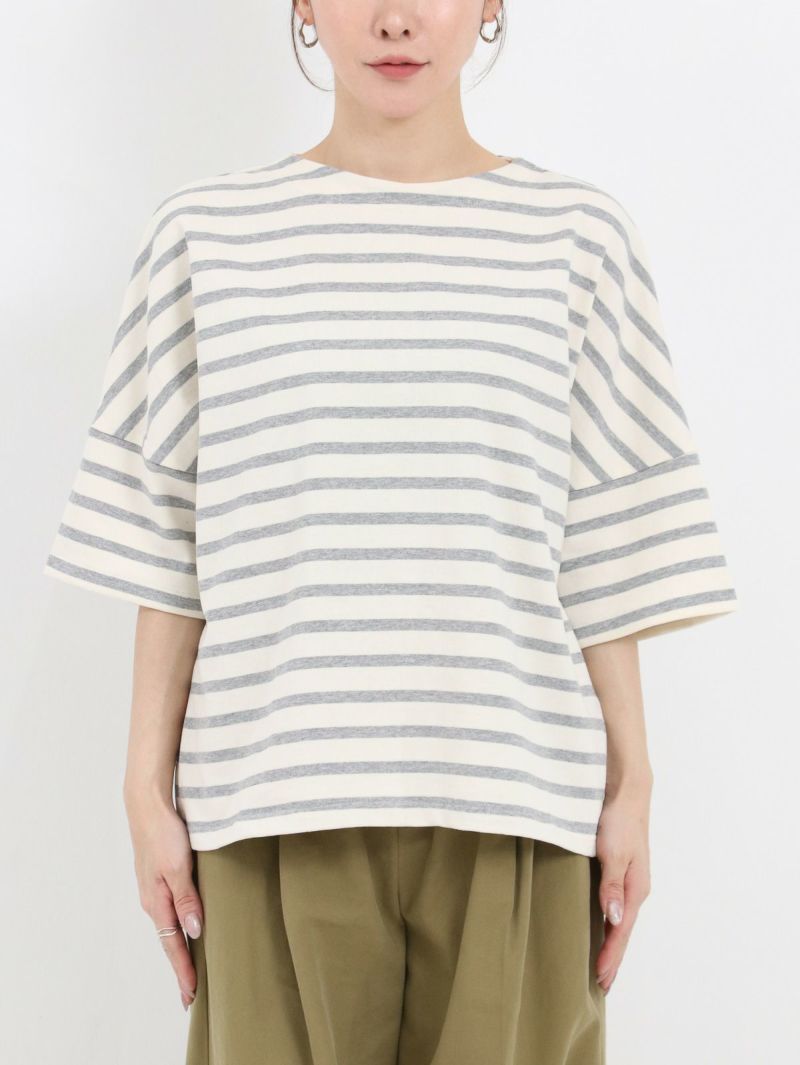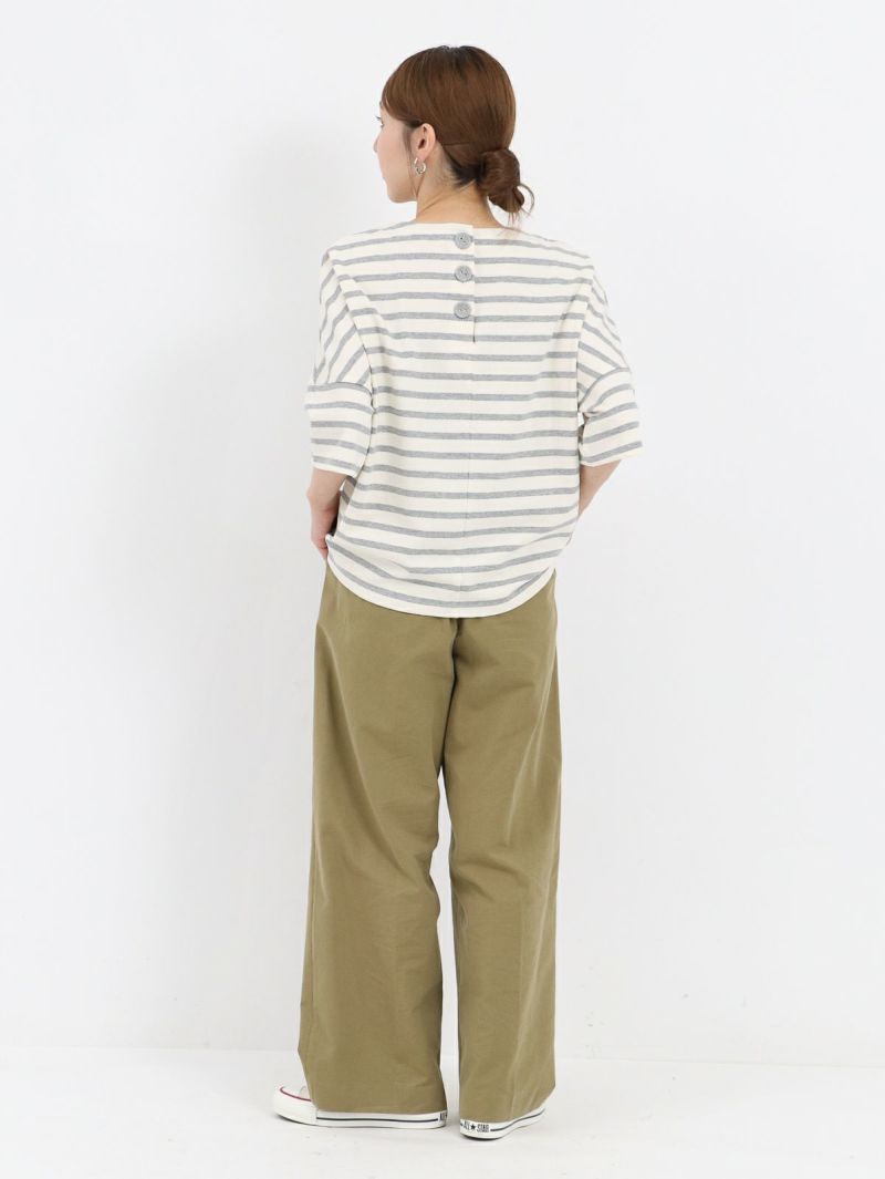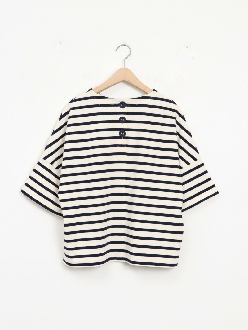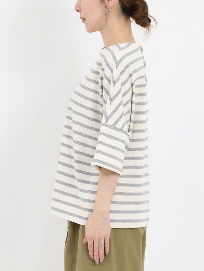 フランス語で”洗いざらし”という意味のデラヴェ生地を使用した、ボーダーカットソーです。袖のボーダーの切り替えやバックのボタンがアクセントになってます。