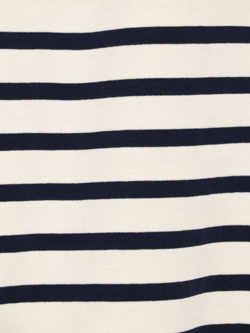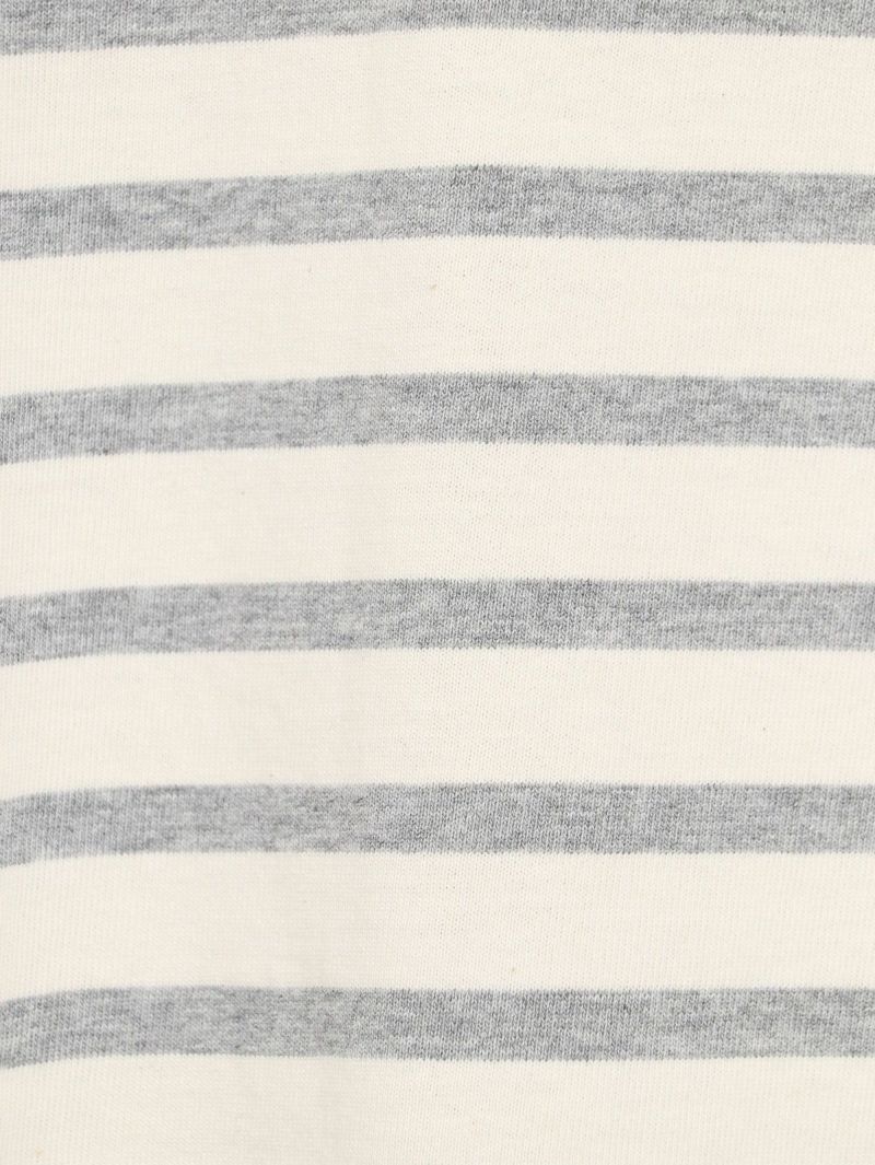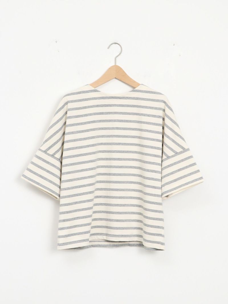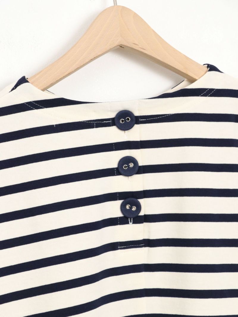 フランス語で”洗いざらし”という意味のデラヴェ生地を使用した、ボーダーカットソーです。袖のボーダーの切り替えやバックのボタンがアクセントになってます。