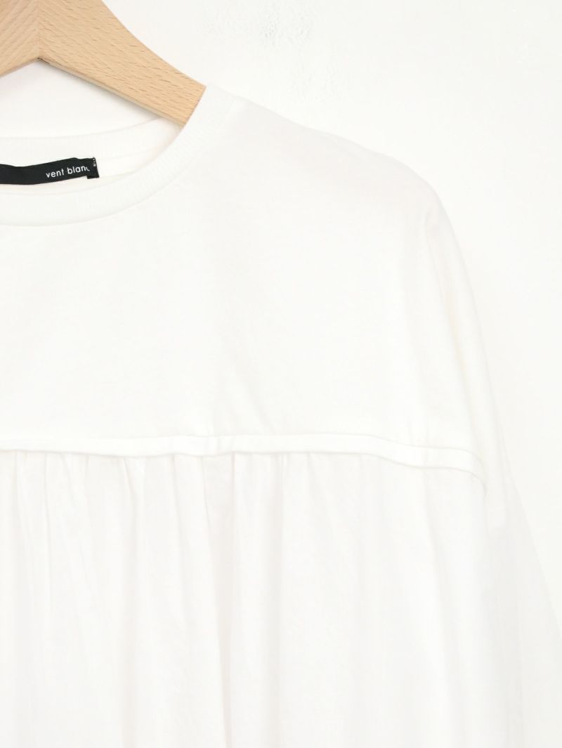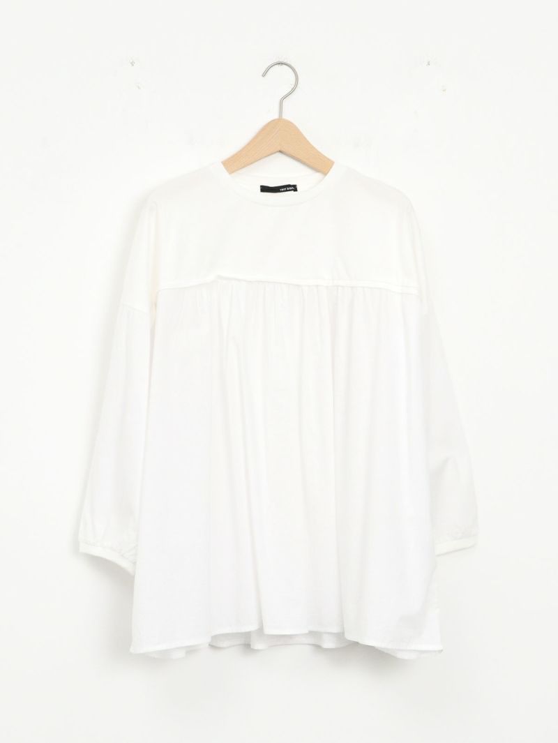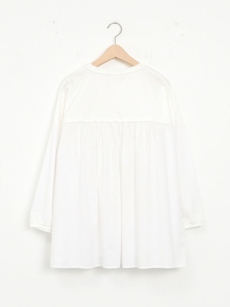 天竺カットソー素材とソフトなローン布帛地を組み合わせた、軽い着心地のコンビプルオーバー。 ゆったりとしたシルエットでボリュームがありながらも、野暮ったくならずに着用出来る1枚。袖口はリブ仕様で腕をまくってもずり落ちにくく、軽やかなに着こなして頂けます。