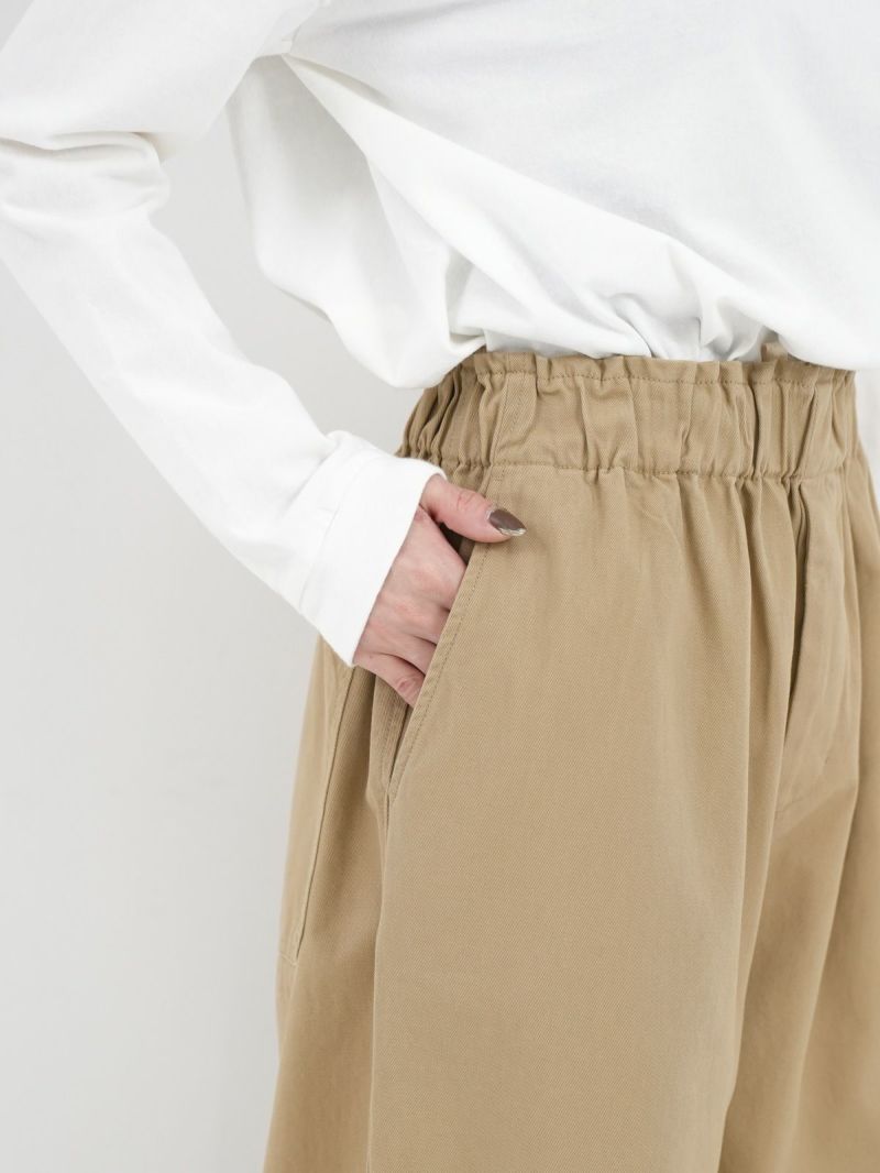 ウエストはゴムでストレスフリー。トップスをインしたときに足が長く見える股上深めのデザインです。