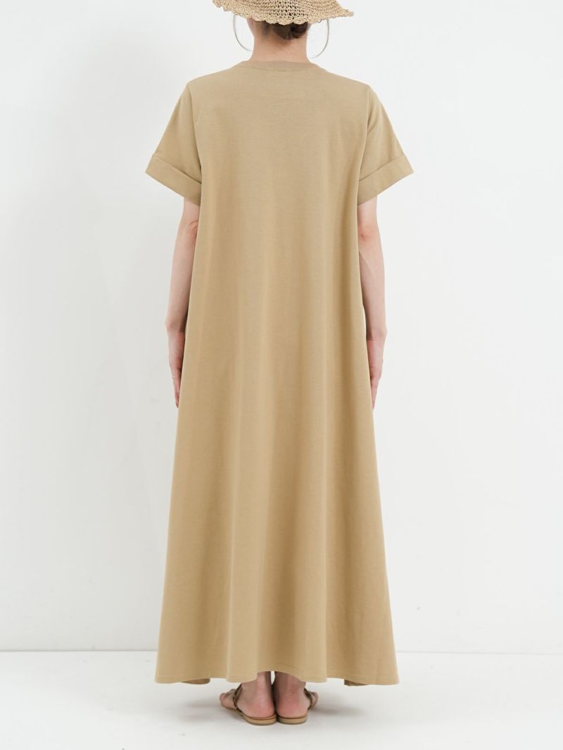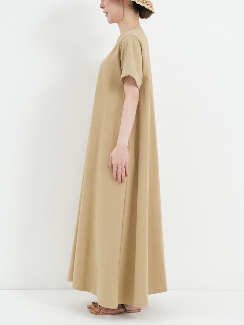 国内生地/国内縫製で品質に拘った1着。 足首まで有るロング丈のワンピースなので存在感があり、1枚で様になります。シンプルながら袖の折り返しがちょっとしたアクセントに◎しっかりした生地感なので、裾にかけてふわっと広がるきれいなAラインシルエットが実感できます。両サイドには便利なポケット付きなのも嬉しいポイント。