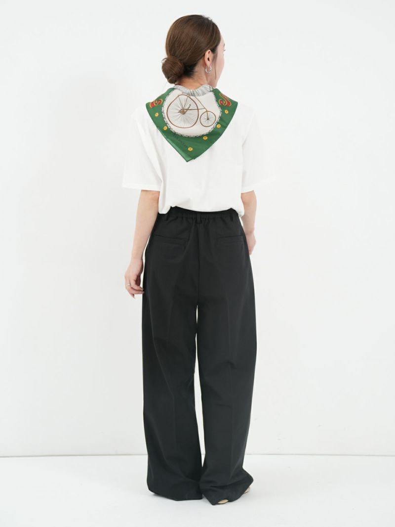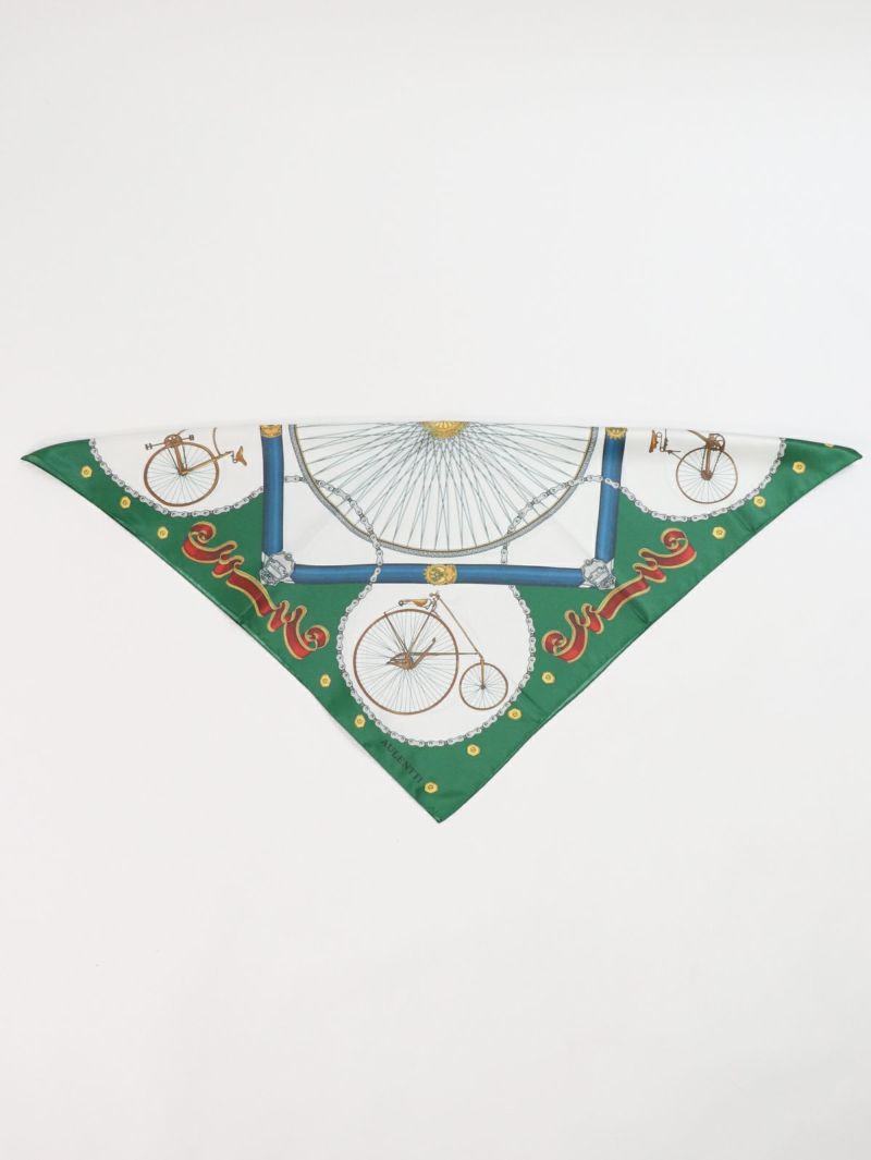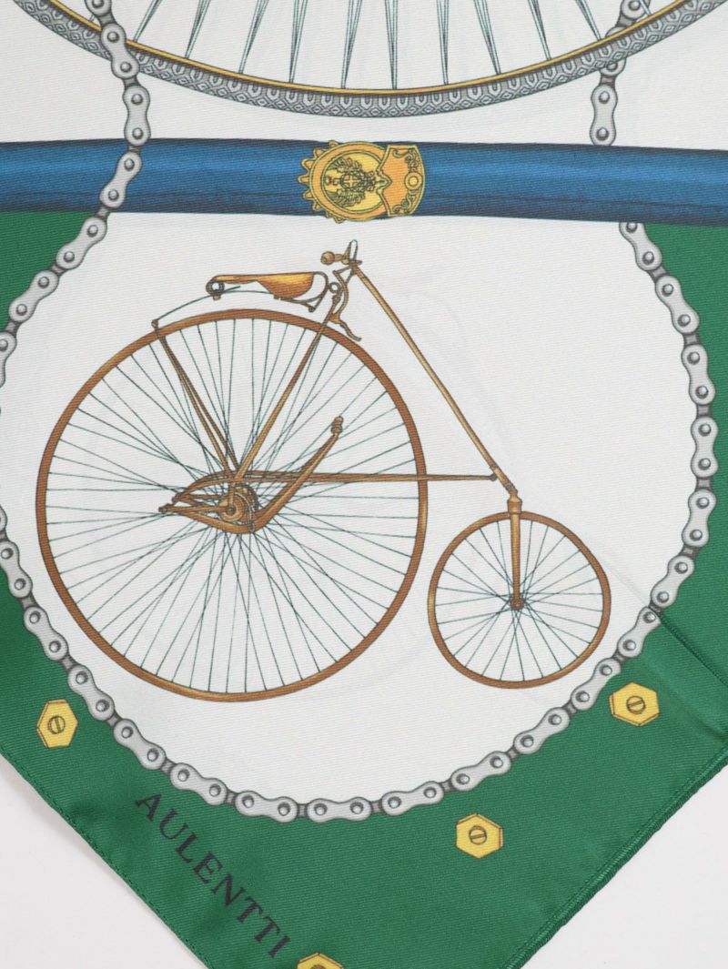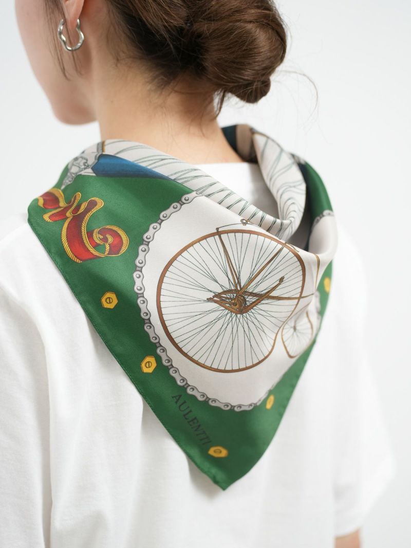自転車をモチーフにしたクラシック柄の大判スカーフ。 ポリエステル100%ながらも高級感のある滑らかな肌触り。首元に巻いたり、バッグに取り付けたりと様々なシーンやコーディネートのアクセントに◎