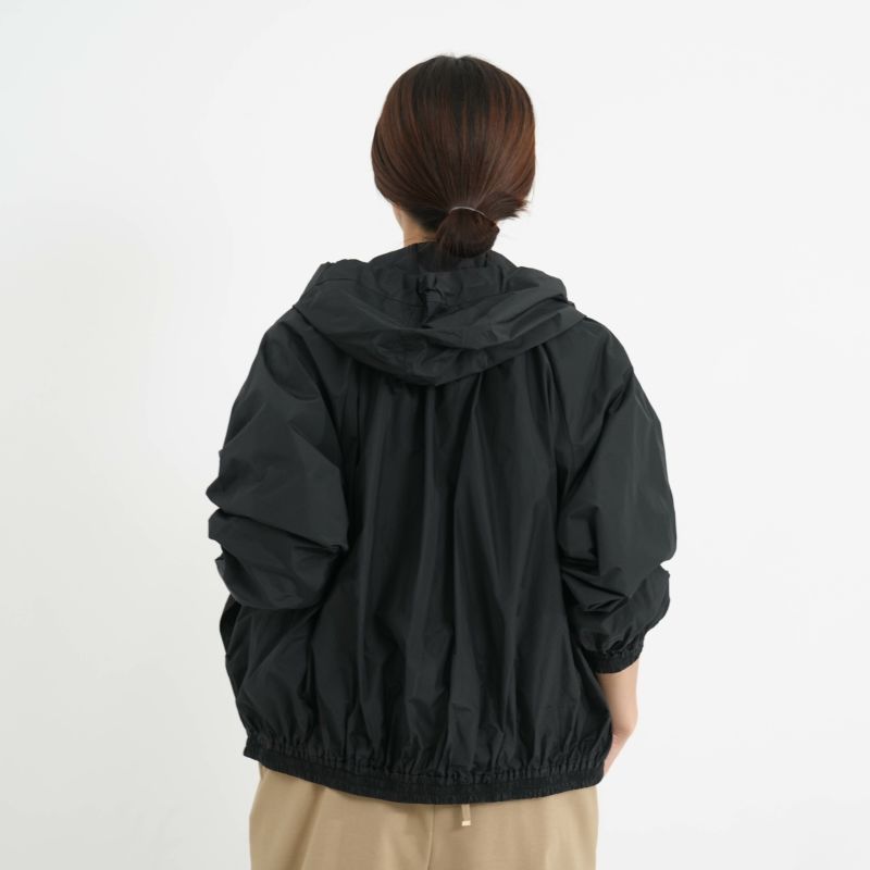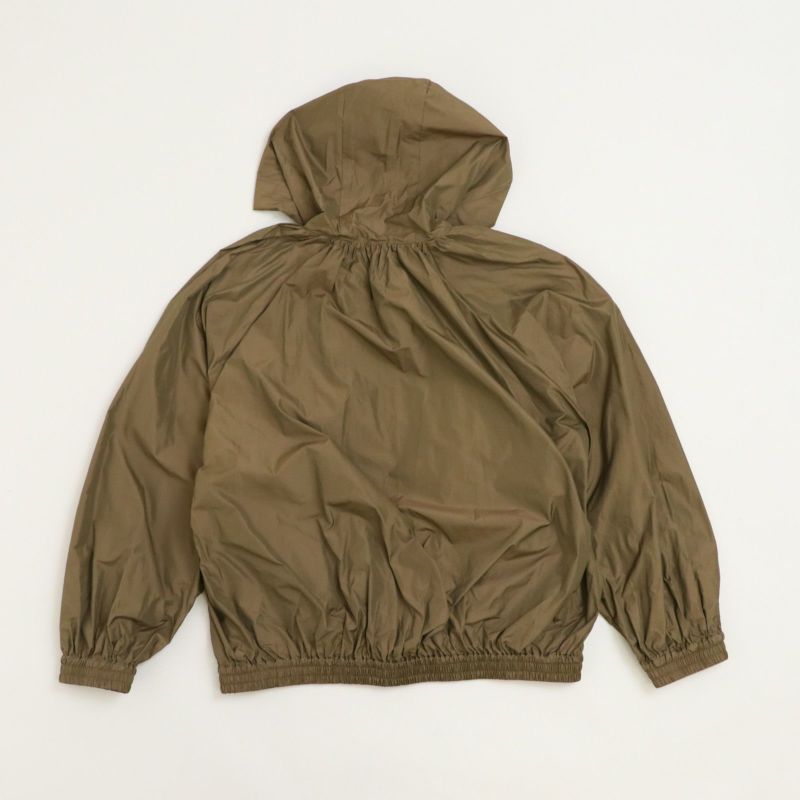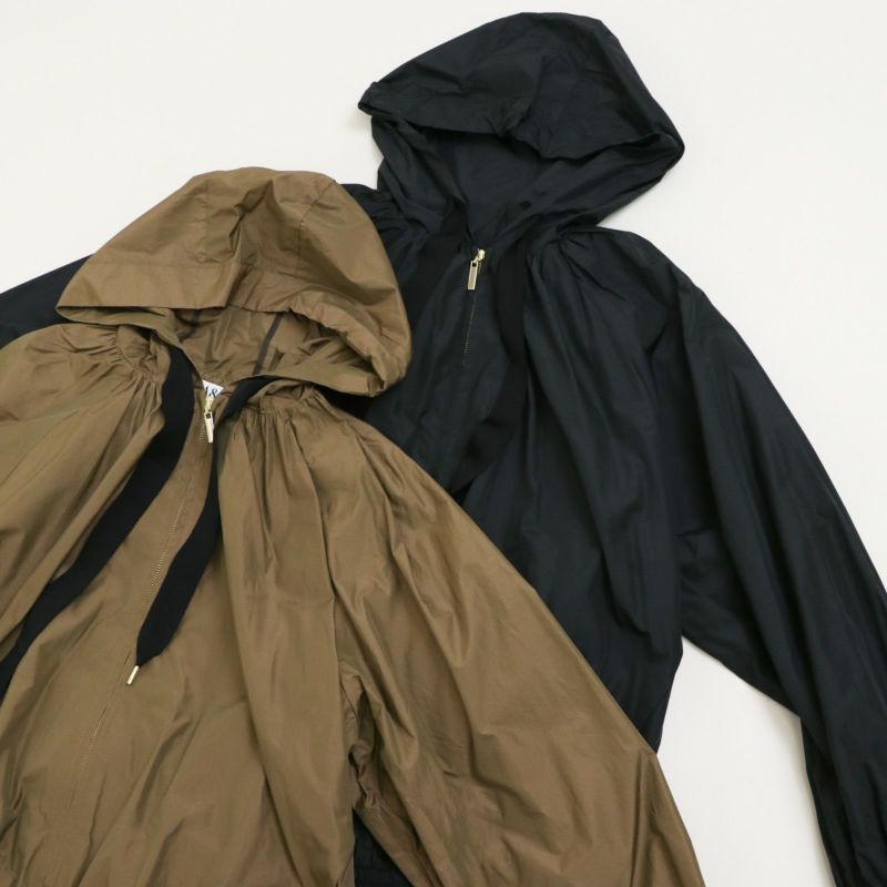 50デニールのリサイクルポリエステルとシャンブレー素材を使用したZIPフーディー。 シルク混素材の光沢感と先染めシャンブレーの色の見え方が高級感あがります。しわになりにくく、フード後ろのパイピングがアクセントに。
