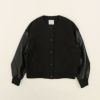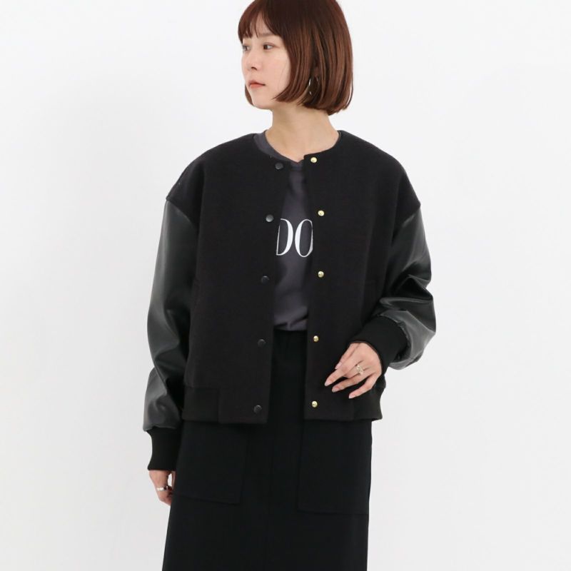 独特な表面感が魅力的なウール生地と、合成皮革のツヤ感をアクセントに合わせたノーカラーブルソン。