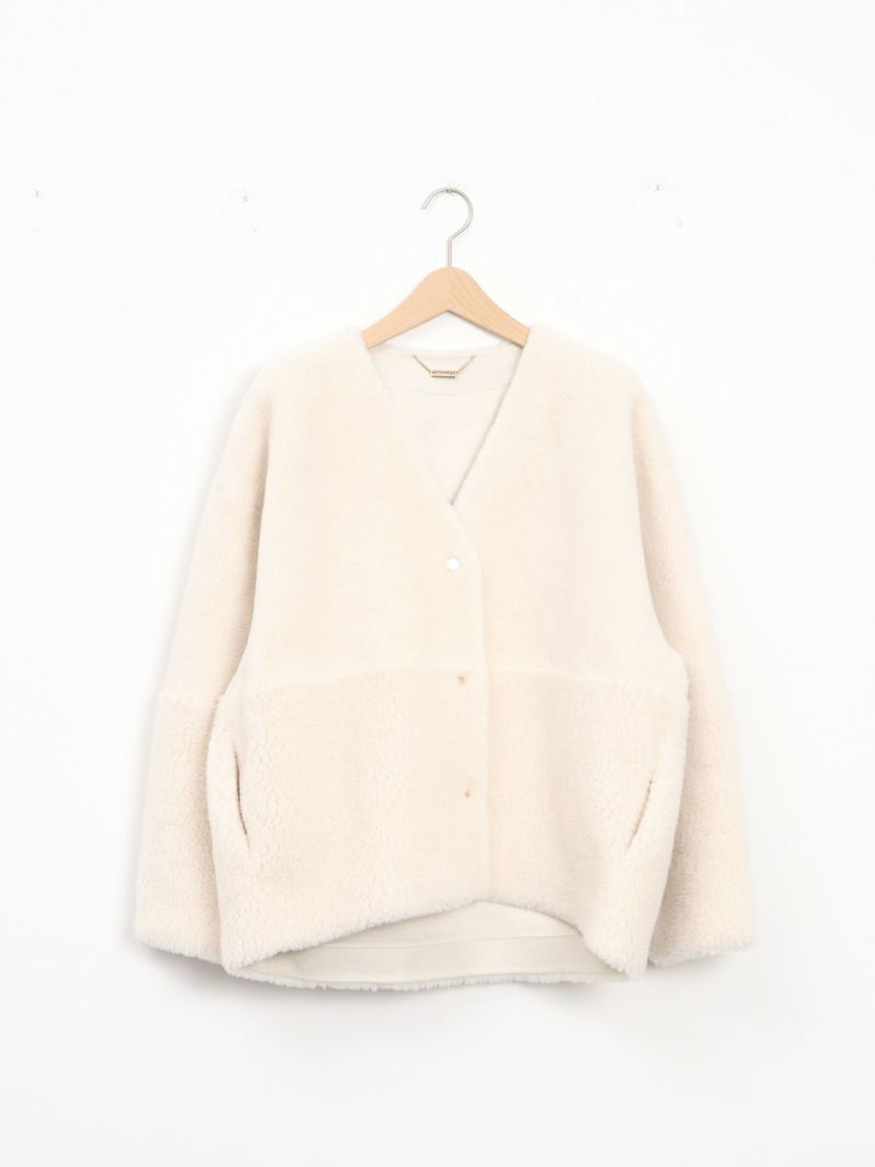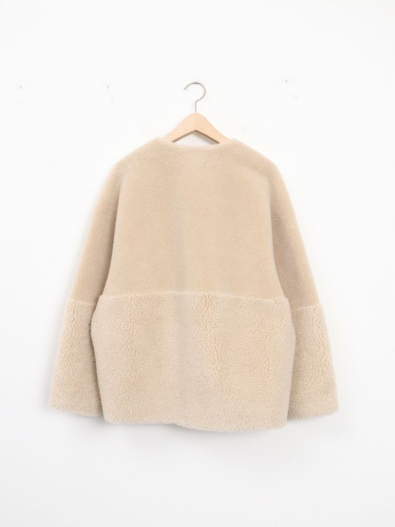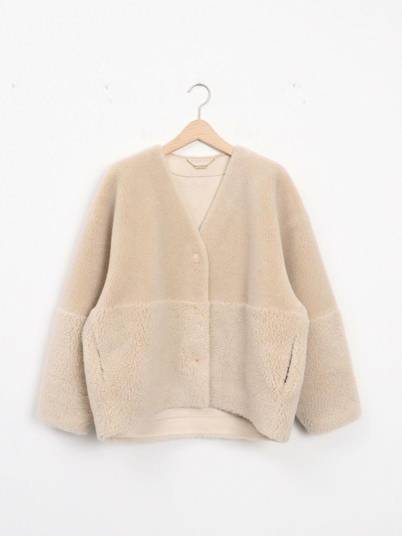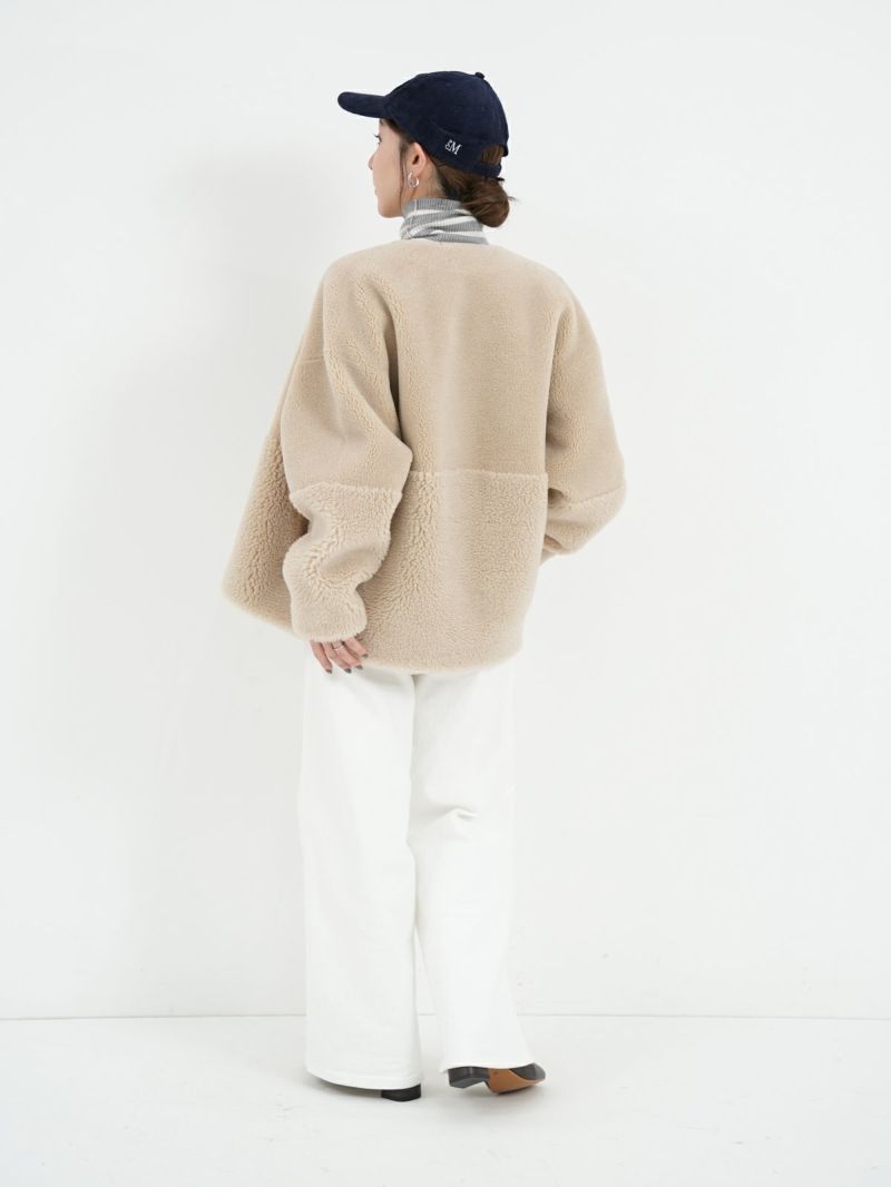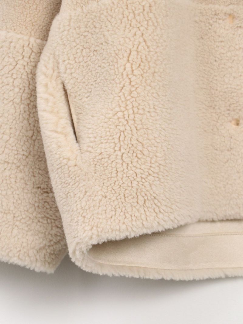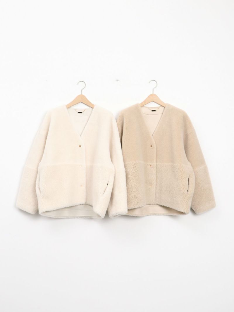 ボアとスエードでリバーシブルで着用できるショートコート。 毛足の異なるボアを袖とウエスト辺りで切り替えてインパクトのあるデザインに落としこみました。また、ラグランスリーブなのでアームホールがゆったりとして厚手のニットやスウェットに合わせても。柔らかで触り心地がいい素材はそのまま活かしつつ、Vネックで抜け感がでるデザインにし、綺麗な印象に仕上げています。ドットボタンは、ゴールドでさりげなくアクセントになっています。
