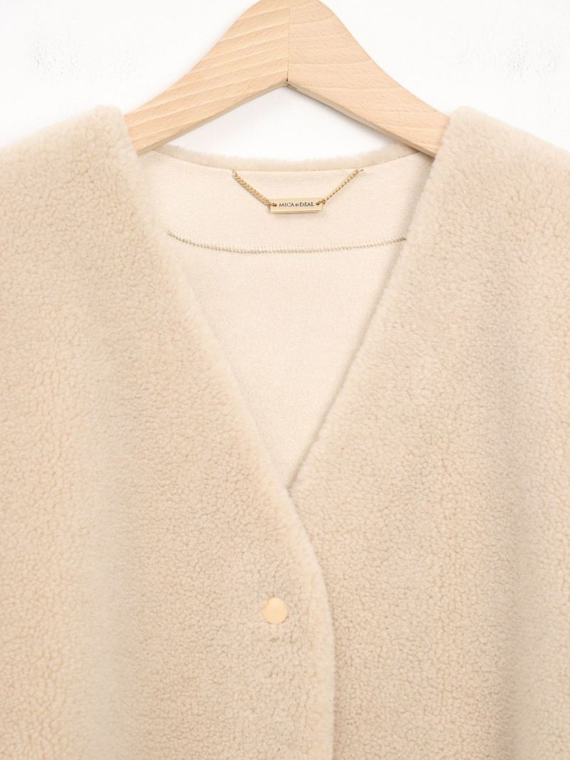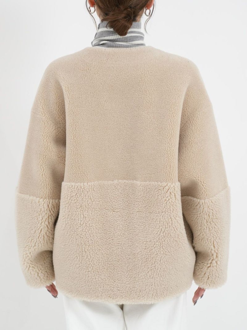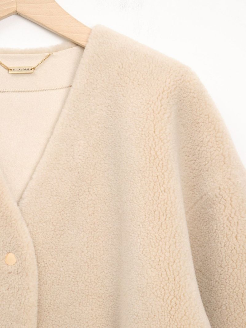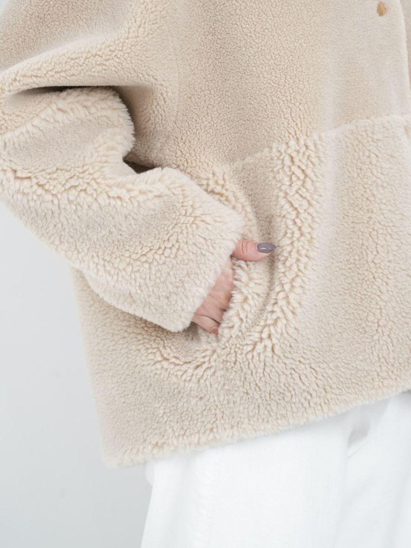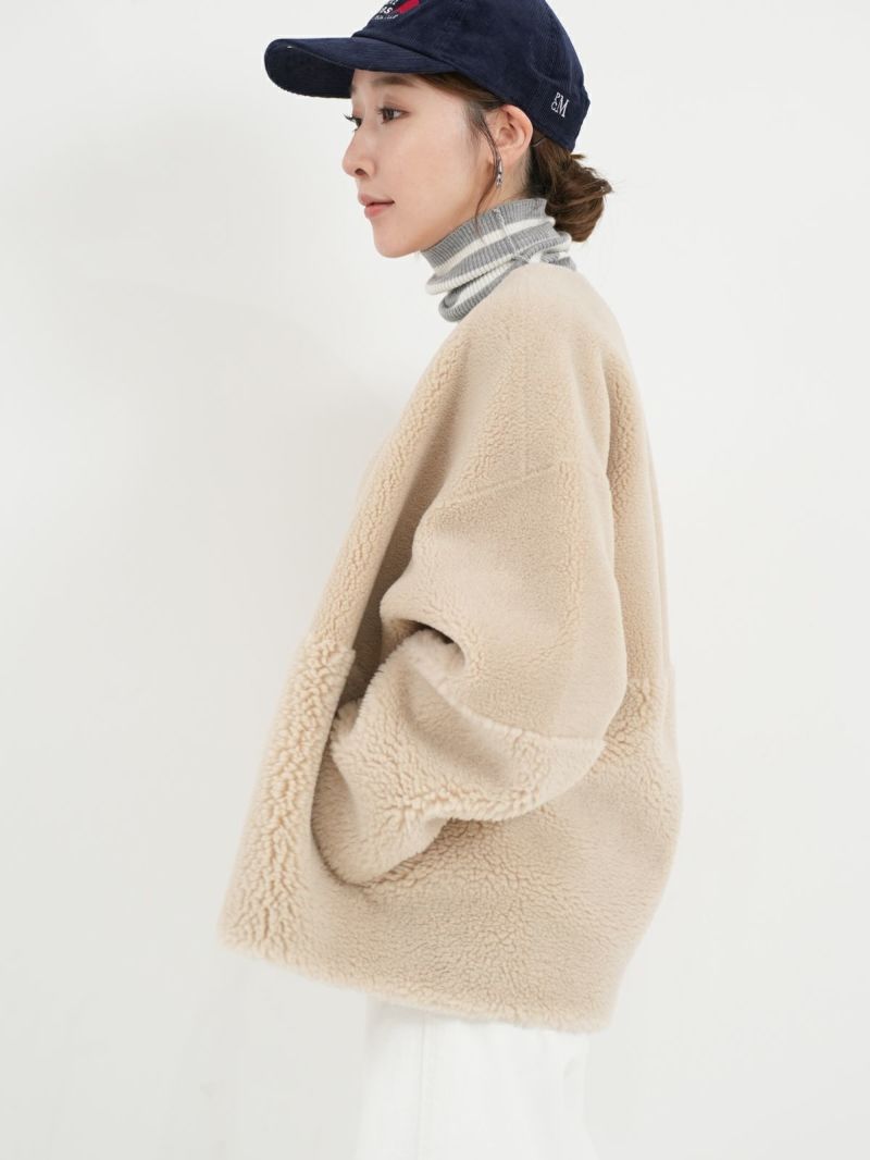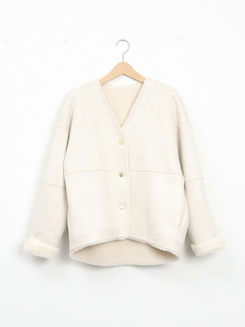 ボアとスエードでリバーシブルで着用できるショートコート。 毛足の異なるボアを袖とウエスト辺りで切り替えてインパクトのあるデザインに落としこみました。また、ラグランスリーブなのでアームホールがゆったりとして厚手のニットやスウェットに合わせても。柔らかで触り心地がいい素材はそのまま活かしつつ、Vネックで抜け感がでるデザインにし、綺麗な印象に仕上げています。ドットボタンは、ゴールドでさりげなくアクセントになっています。